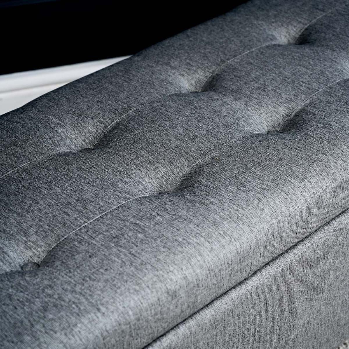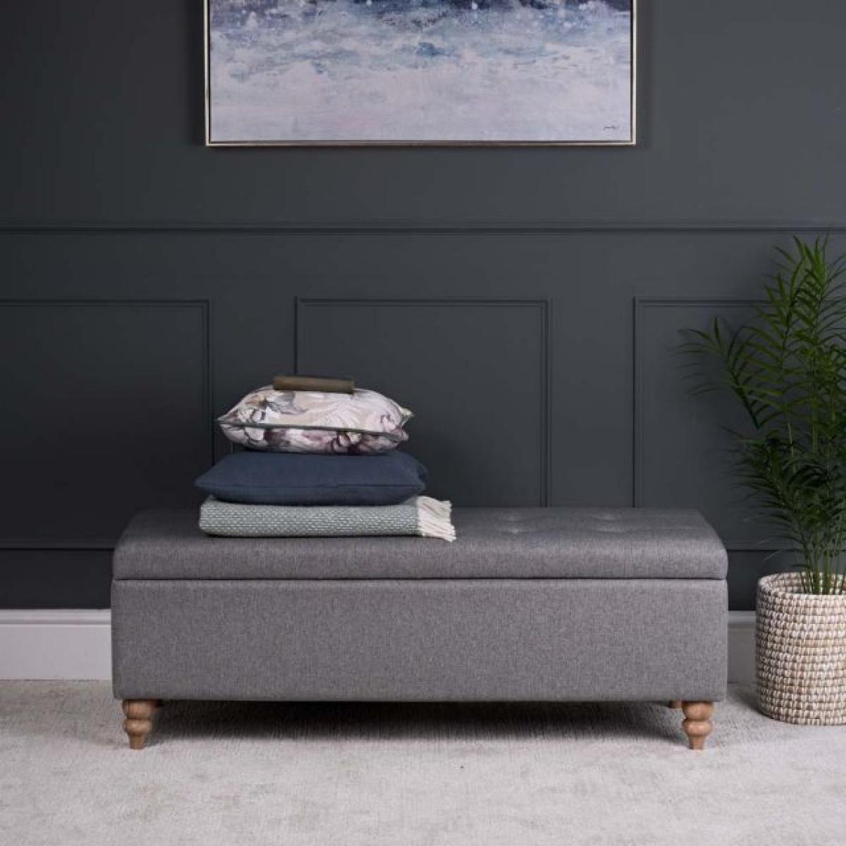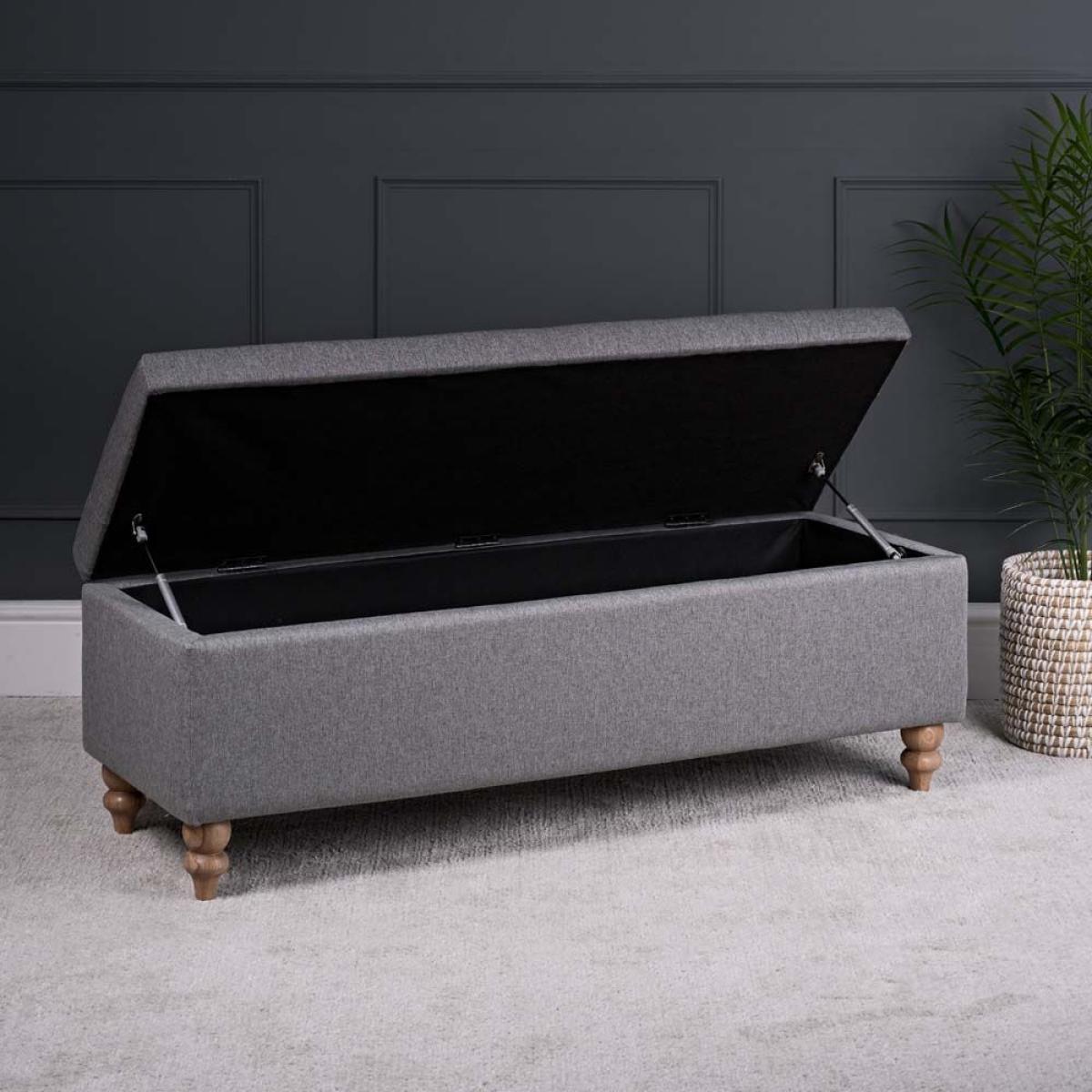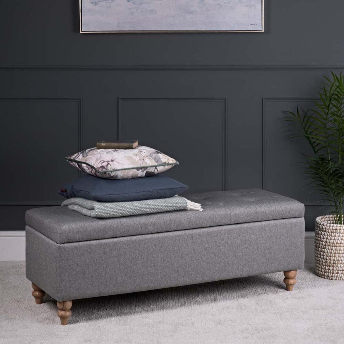 The Blaby Ottoman is a fully upholstered storage box which is great as blanket box in the bedroom or even as an additional seat below a window in the sitting room. The buttoned upholstery is in a neutral grey tone, and the lid features safe and secure hydraulic supports to assist with opening and prevent it closing unexpectedly. The ottoman is finished with turned wooden legs.