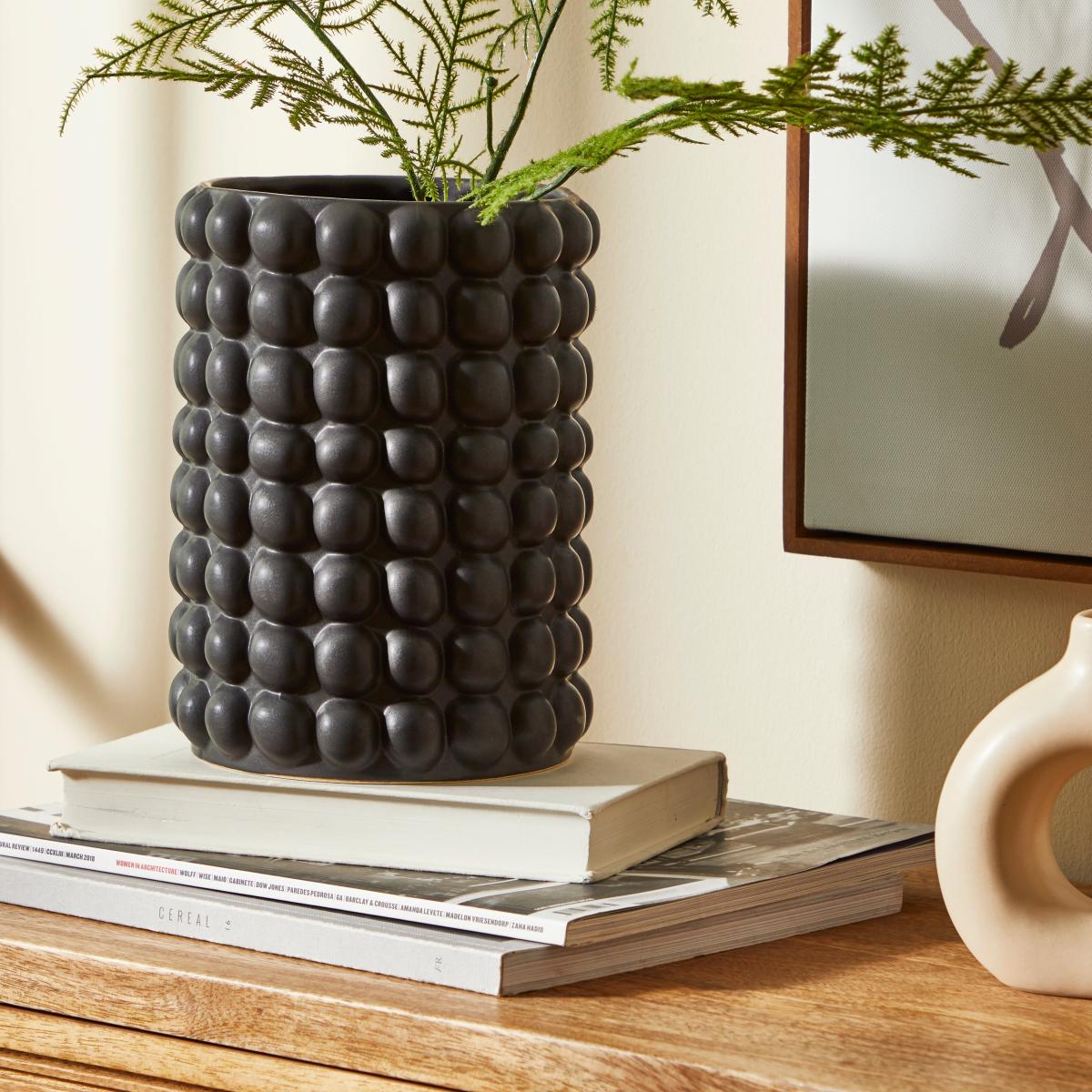 I love this black bubble vase for its bold, modern silhouette and tactile texture, making it a statement piece even when empty. It works particularly well in contemporary or minimalist interiors, adding depth and contrast to neutral palettes. For practical styling, try pairing it with mono-toned or dried floral arrangements to emphasise its graphic quality, or place it as a standalone sculptural element on a sideboard or shelf. Its size makes it versatile for both tabletop displays and larger console arrangements, and its all-black finish ensures it pairs effortlessly with other metallics or colours in your scheme.