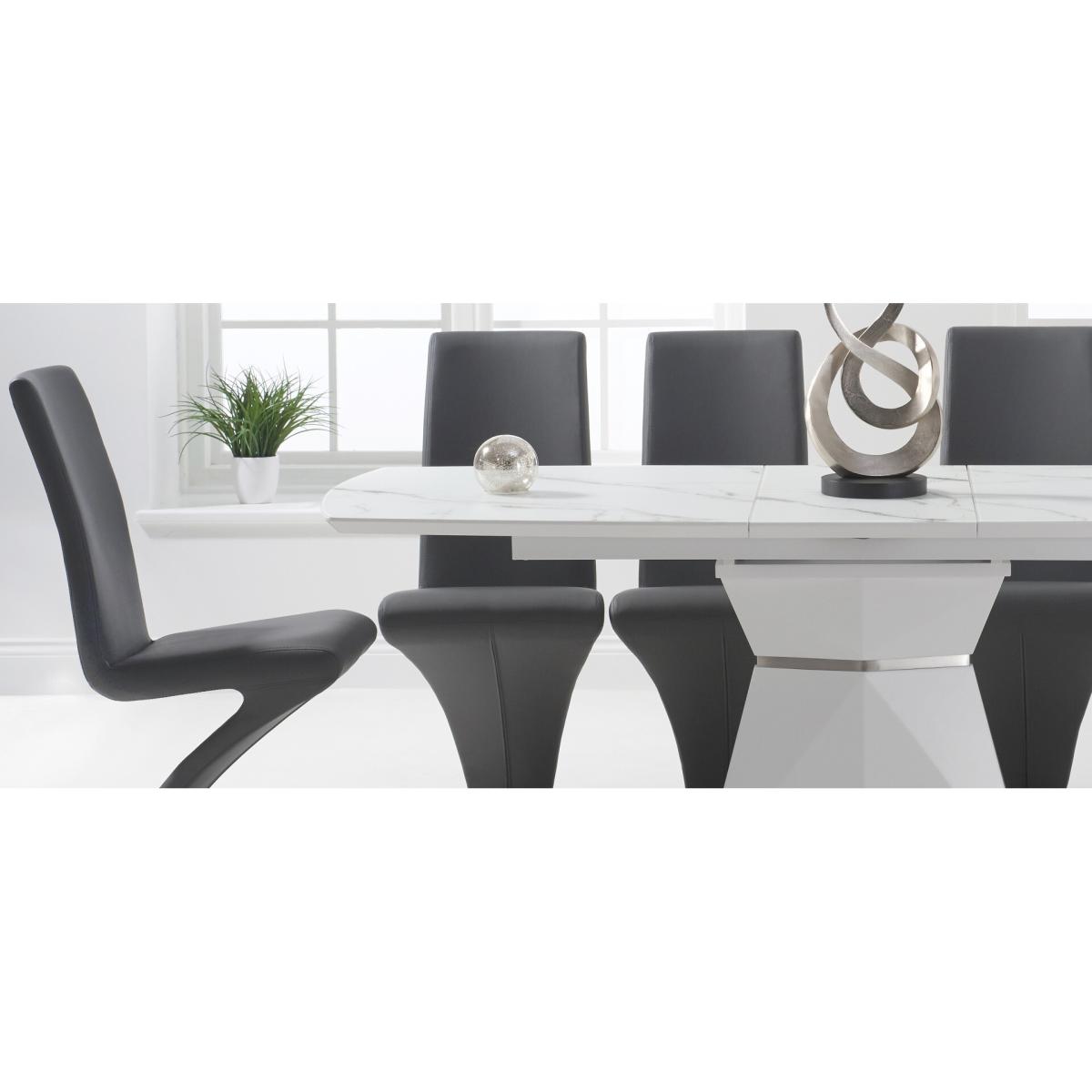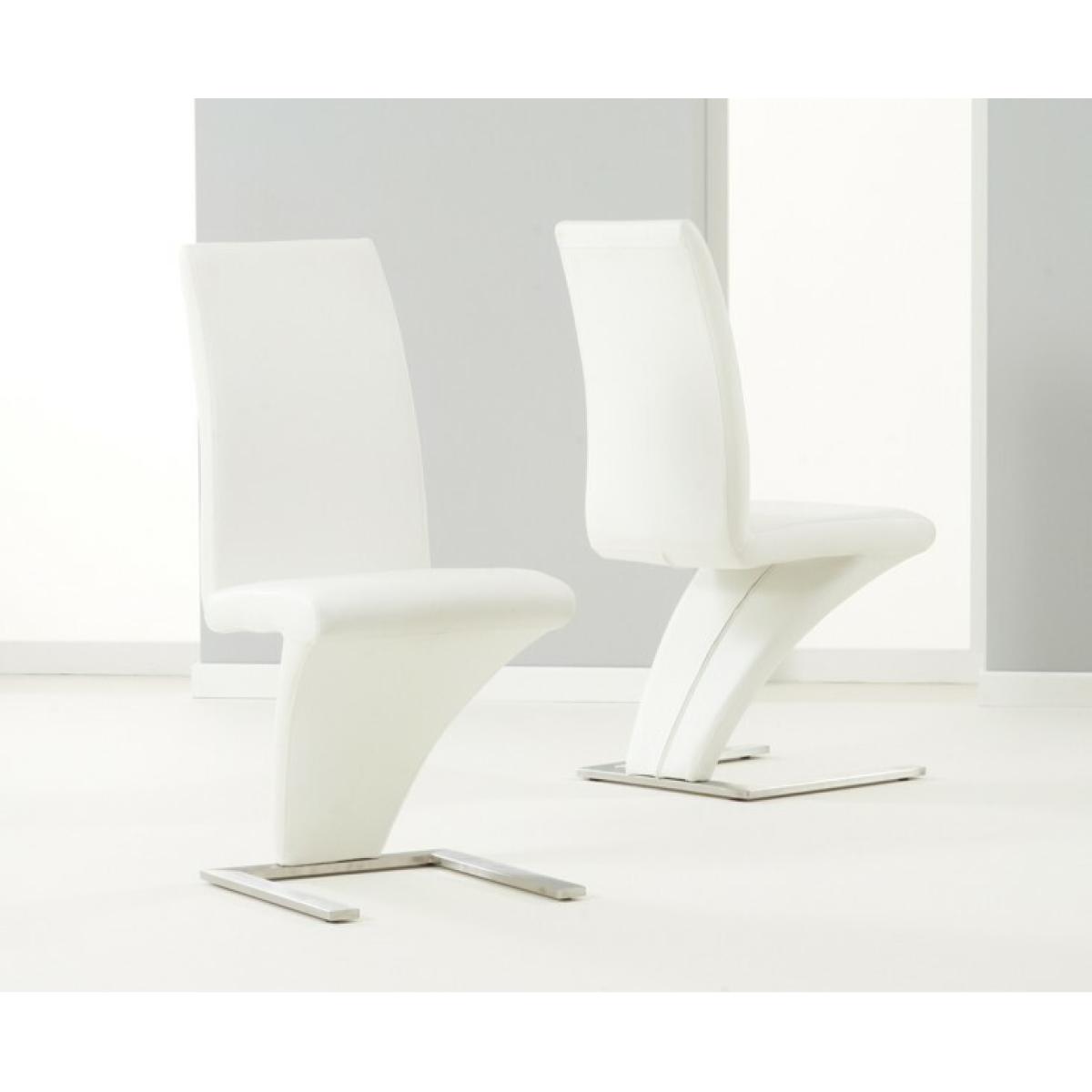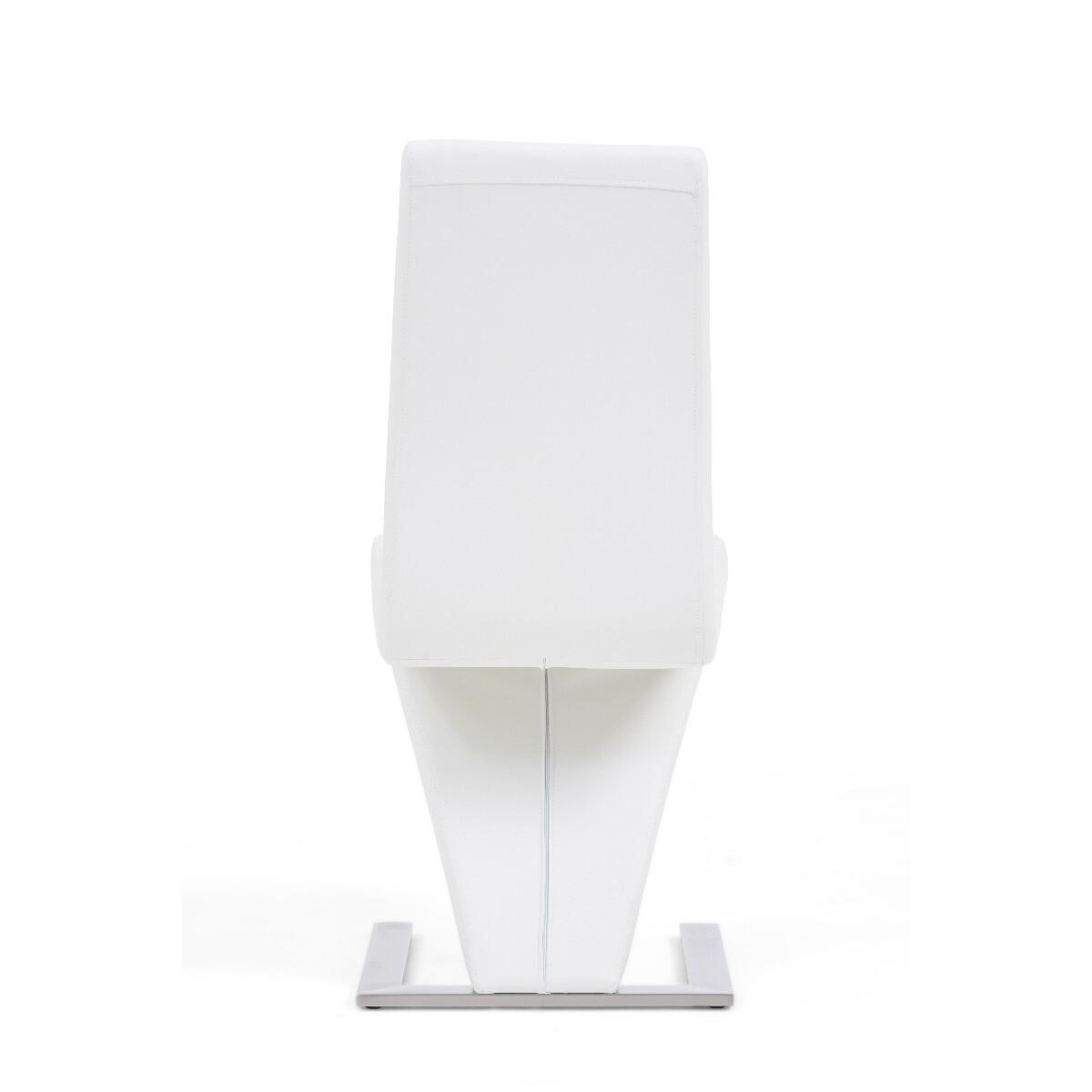 The Aldo Faux Leather Dining Chairs feature a unique Z design, smooth faux leather and brushed metal feet.