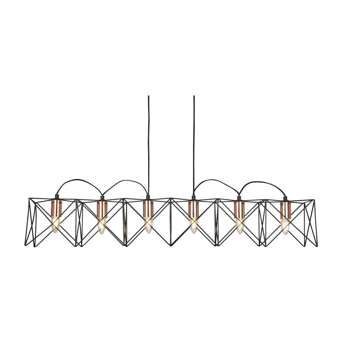 This black and copper pendant with six lights offers a sleek, contemporary look with a hint of industrial edge, making it versatile for various interiors. I love its bold geometric design, which works particularly well in modern and minimalist spaces, but it can also add contrast in more traditional settings. For styling tips, consider hanging it above a dining table or in a spacious kitchen to create a striking focal point. Pair it with copper or matte black accessories to enhance the finish, and keep the surrounding decor simple to let the statement piece shine. Its clean lines and metallic tones make it especially suitable for urban, industrial, or contemporary interiors where architectural details are key.