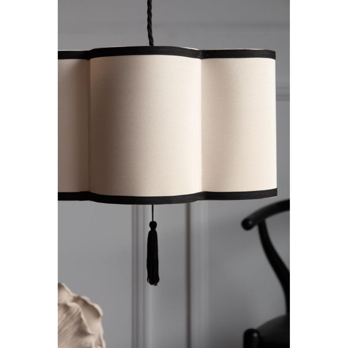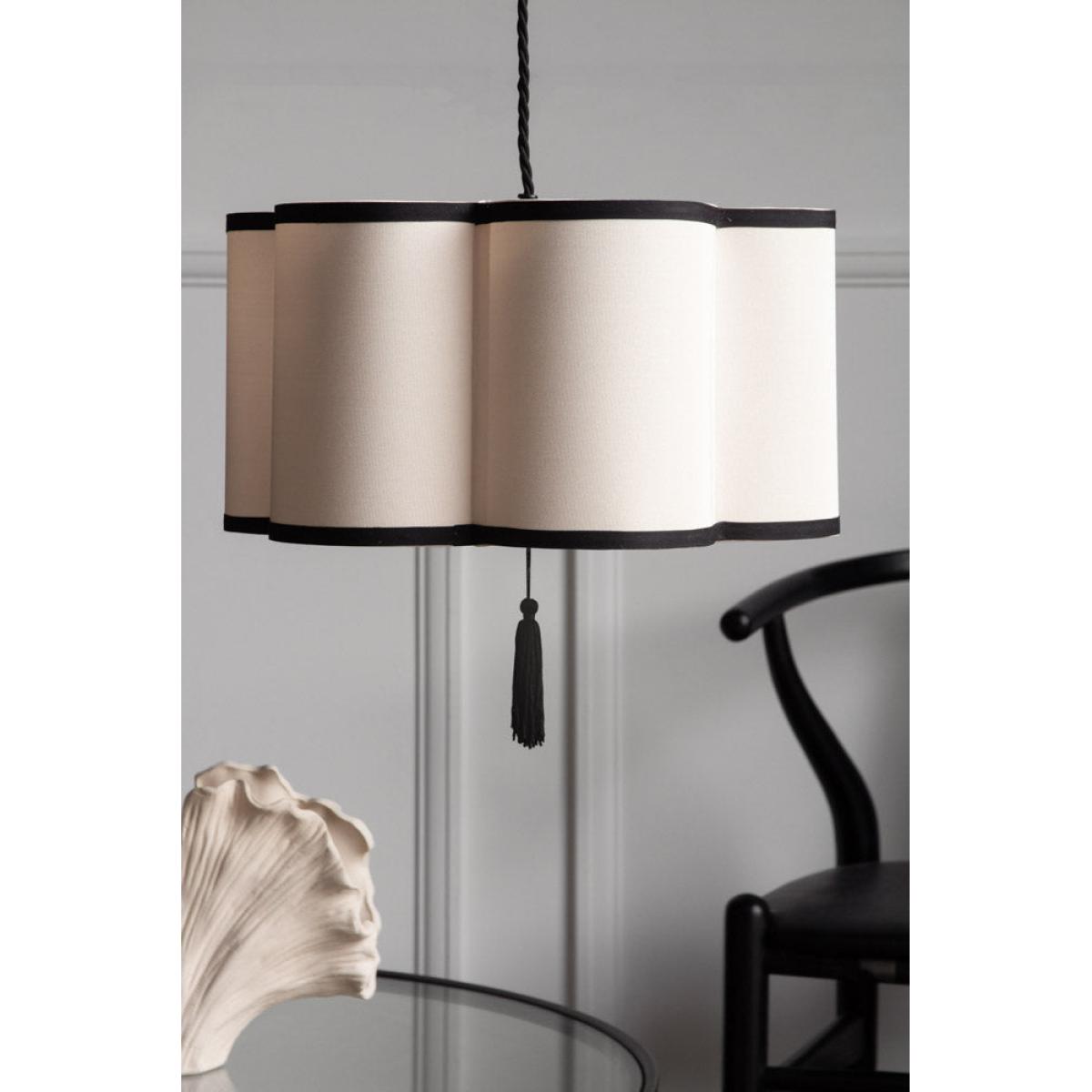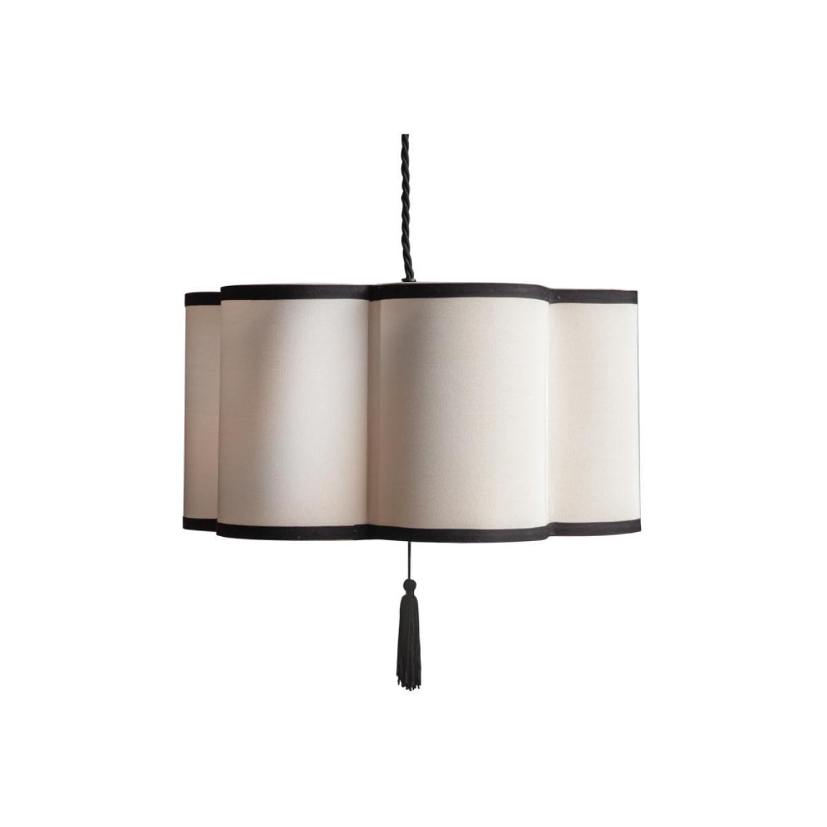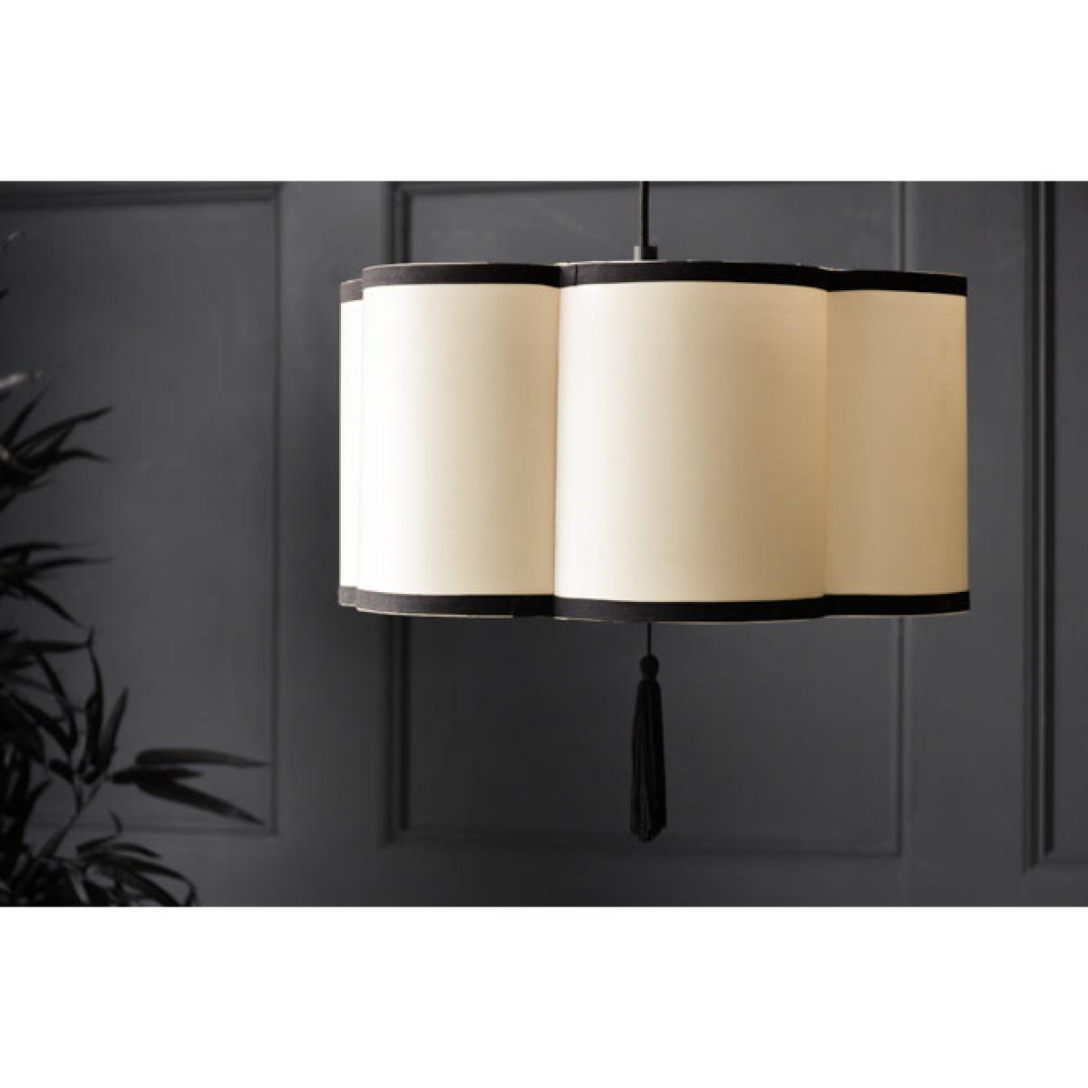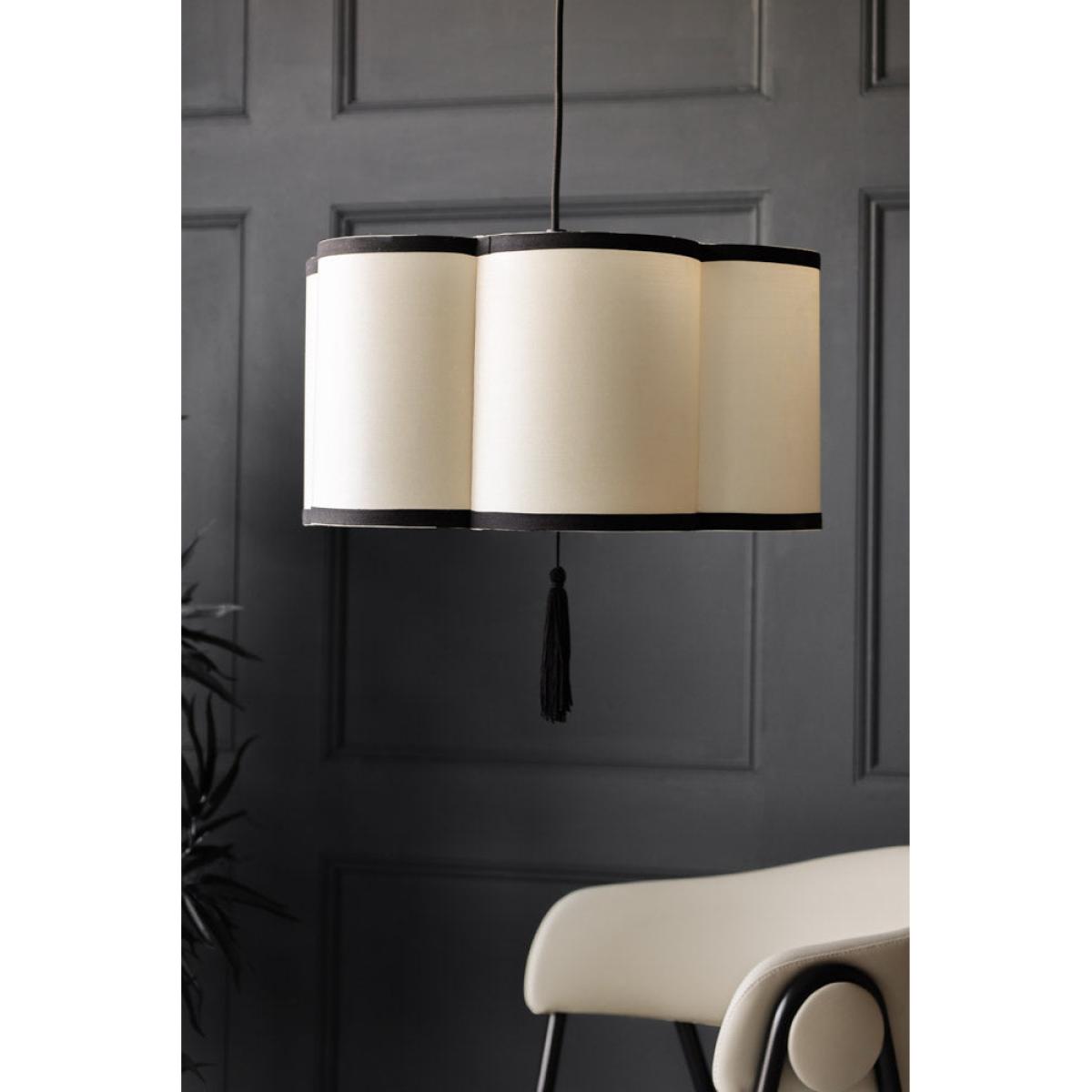 About The Black & Cream Lantern Curved Ceiling Light ShadeA striking and unusual shape, the Black & Cream Lantern Ceiling Light Shade features a gorgeous curved shape made from a smooth and stretchy silk style fabric adorned with a sleek black trim and decorative black tassel. Showcasing a sumptuous shape that is totally unique, this ceiling lamp shade will emit the most glorious glow into your interior scheme. Offering a standard screw fitting, this cream shade is only suitable for ceiling lights, not table lamps, and is conveniently functional yet stylish, so what’s not to love?!Why We Think You’ll Love The Cream Ceiling Light ShadeIntroducing a wonderfully calming vibe, the ceiling light shade offers an organic design and a glorious natural palette that is oozing with serene tranquillity. An instant style statement, this lamp shade for ceiling lights exudes a one of a kind charm that would make a gloriously pairing with plush textures and chic furniture. Where To Style The Cream & Black Lantern Light ShadeA true statement piece in and of itself, this decorative light shade would look amazing as the star of the show in your living area. Fit a warm coloured bulb in this light shade and style it alongside cosy textures like fluffy pillows and throws for a total tranquil vibe that’ll be calling your name after a long day. Alternatively, style this unique light shade in your bedroom for a serenely stylish sleeping space that is oozing with luxurious indulgence.