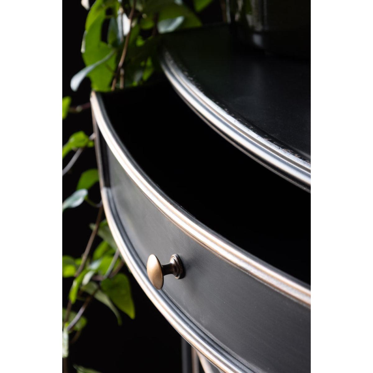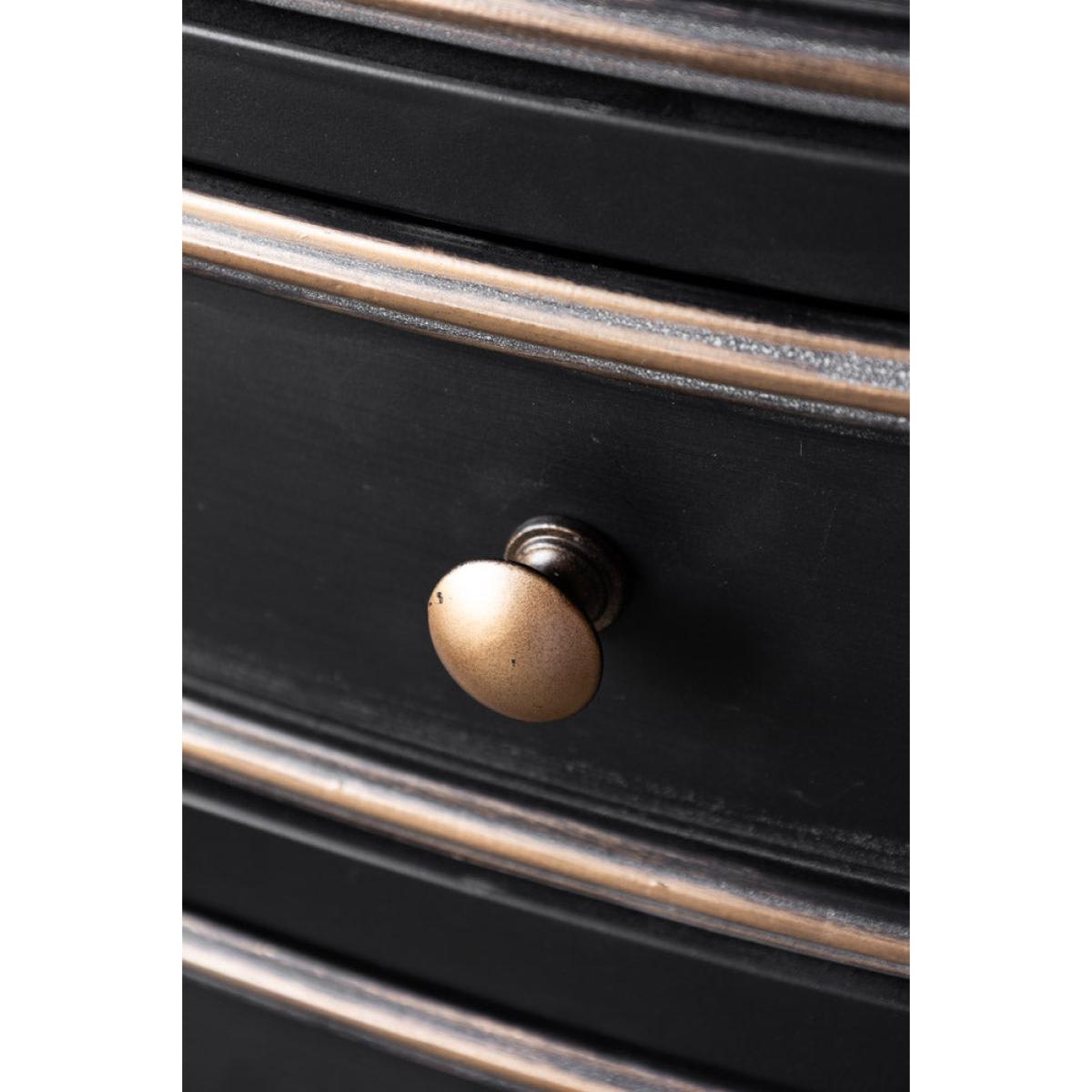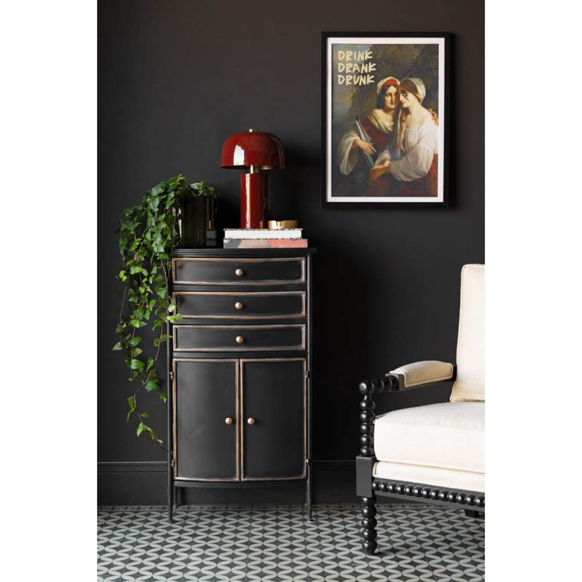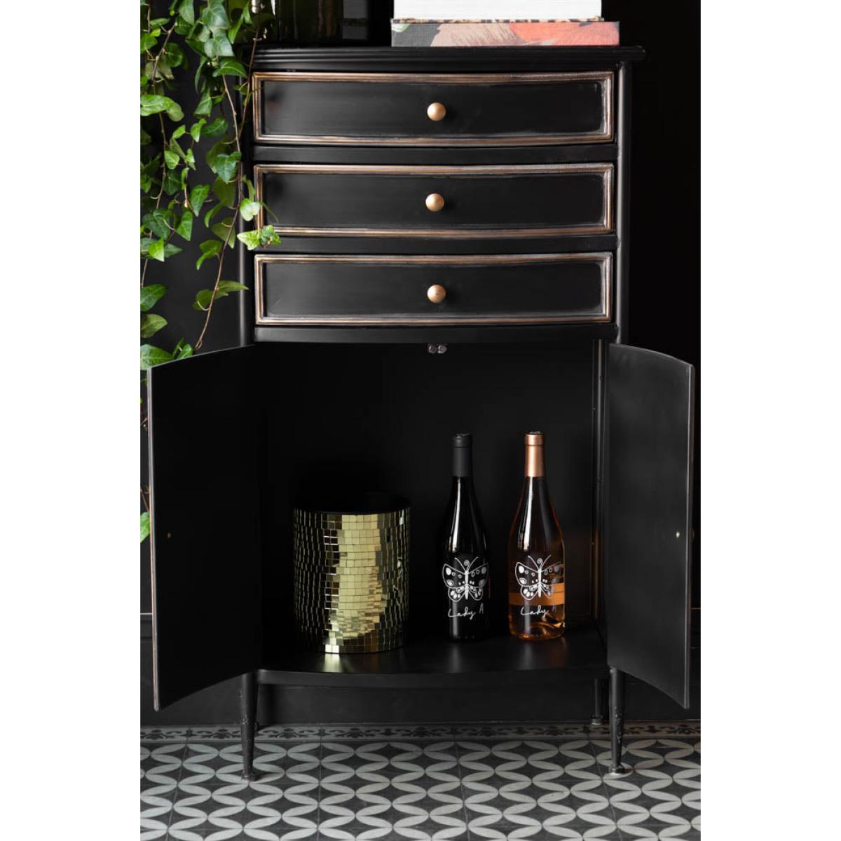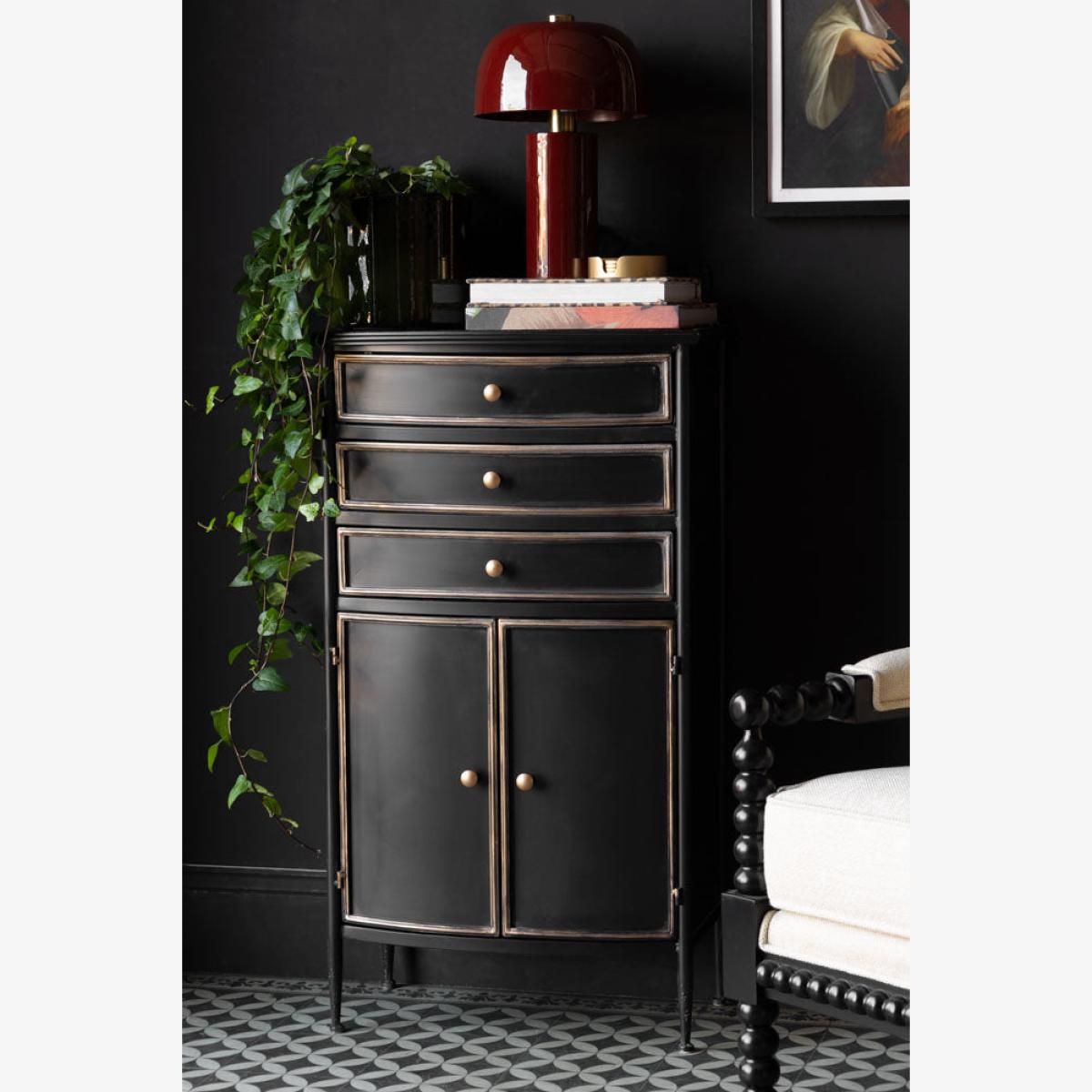 Drenched in rich, inky black with beautifully distressed gold edging and knobs, this slim sideboard gives a moody manor house meets boutique hotel bar vibe. It’s grand, opulent and very grown-up. The kind of black sideboard that instantly makes a room feel smarter by simply existing. With three sleek drawers and double-door storage, this cabinet is as practical as it is beautiful. Ideal for stashing everything from cocktail napkins to candle collections. Let this gorgeous piece adorn your hallway or bedroom and let it show off, because who doesn’t love a little bit of drama?- Black & Gold Antiqued-Style Side Cabinet- Measures: W56cm x H101cm x D36cm- Material: Iron