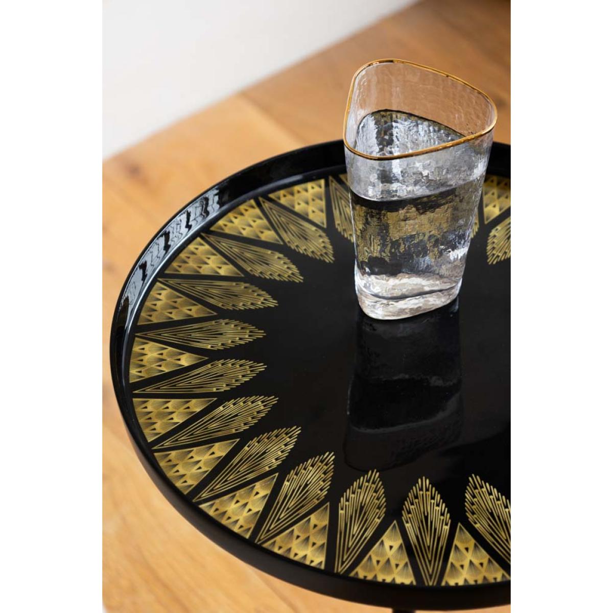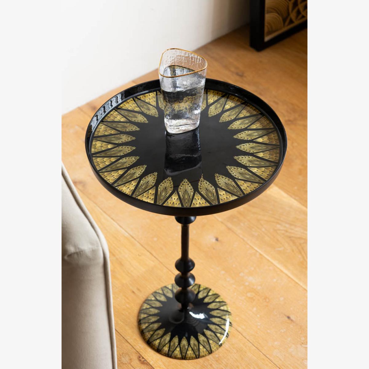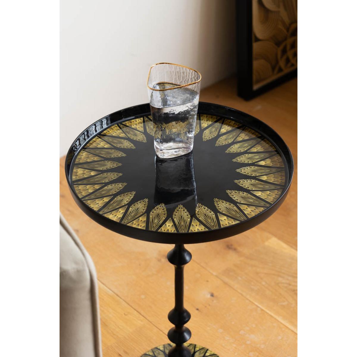 Serving you serious Gatsby glam, this black side table is pure Art Deco elegance with a modern edge. With a sleek, ribbed pedestal base, this sofa side table is dressed head-to-toe in inky black with gorgeous gold detailing that radiates around the tabletop and base like a little sunburst moment. It’s bold, it’s timeless, and it brings instant vintage luxe to your existing side tables and any corner of your home. Style it next to a plush velvet armchair, use it as a chic drinks table, or let it shine in your bedroom for a touch of old-school glamour. All because your side table should be as fabulous as you are. - Black & Gold Art Deco Inspired Side Table - Measures: W37cm x D37cm x H57cm - Materials: Metal - This product should only be used on firm, level ground. Avoid exposing the furniture to excessive heat or direct sunlight, as this can cause cracking and deterioration of the colour. Keep away from strong heat sources. Do not use this item if components are missing or broken. - Wipe clean only