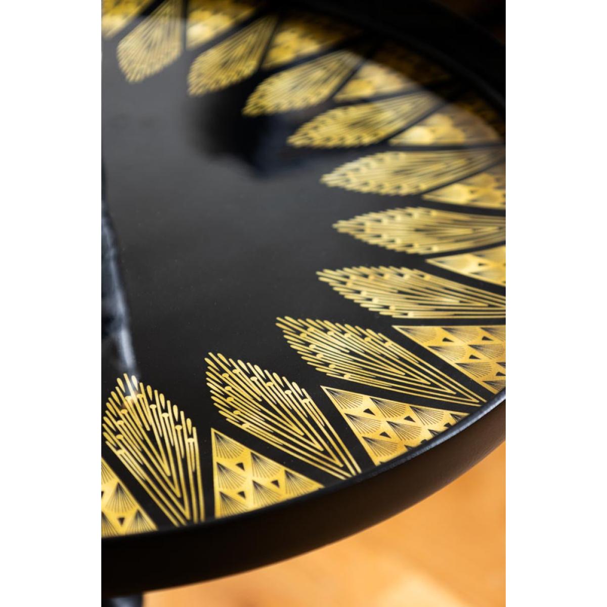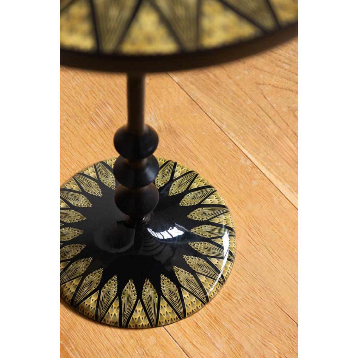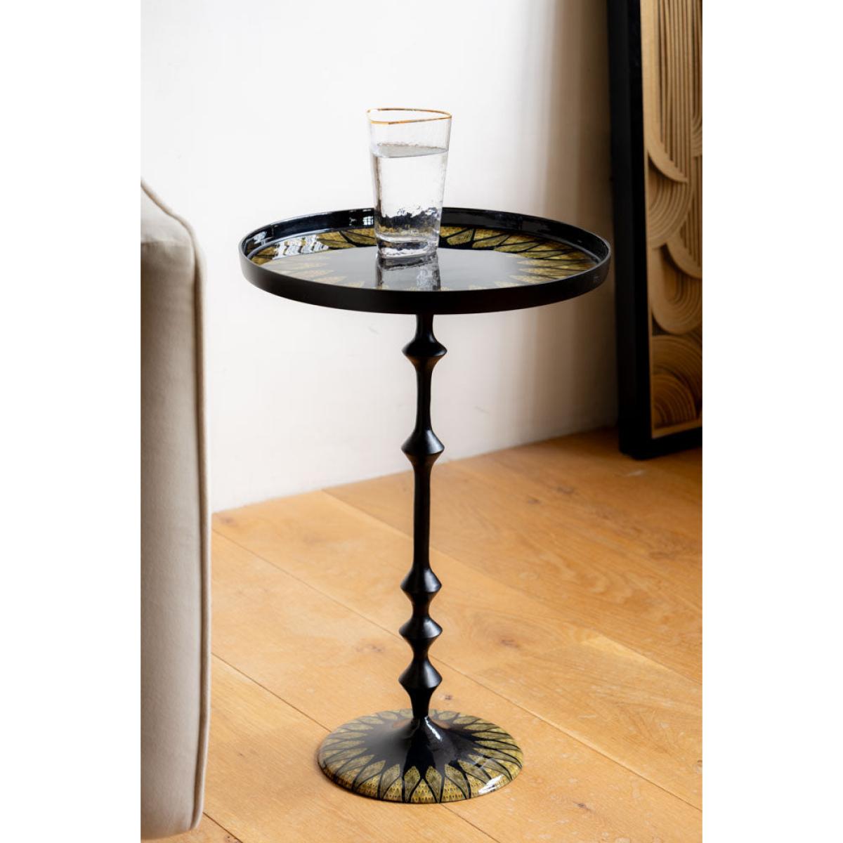 Serving you serious Gatsby glam, this black side table is pure Art Deco elegance with a modern edge. With a sleek, ribbed pedestal base, this sofa side table is dressed head-to-toe in inky black with gorgeous gold detailing that radiates around the tabletop and base like a little sunburst moment. It’s bold, it’s timeless, and it brings instant vintage luxe to your existing side tables and any corner of your home. Style it next to a plush velvet armchair, use it as a chic drinks table, or let it shine in your bedroom for a touch of old-school glamour. All because your side table should be as fabulous as you are. - Black & Gold Art Deco Inspired Side Table - Measures: W37cm x D37cm x H57cm - Materials: Metal - This product should only be used on firm, level ground. Avoid exposing the furniture to excessive heat or direct sunlight, as this can cause cracking and deterioration of the colour. Keep away from strong heat sources. Do not use this item if components are missing or broken. - Wipe clean only
