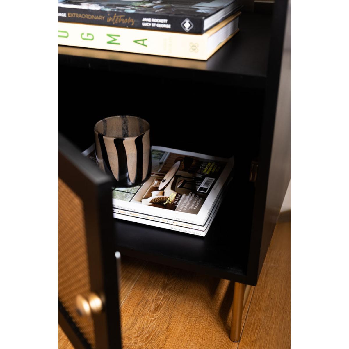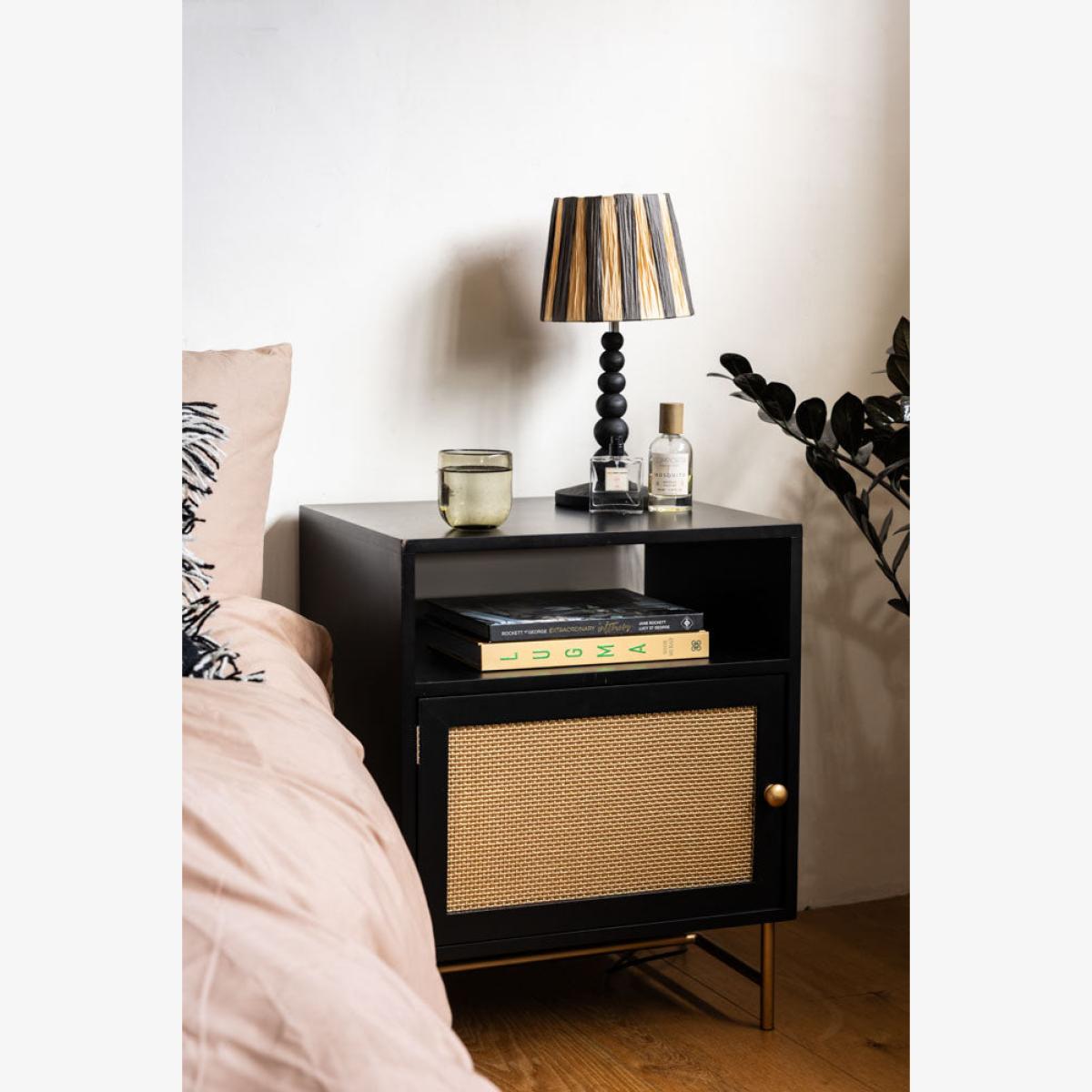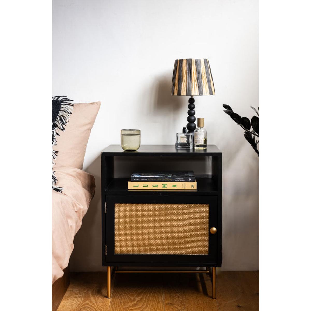 Introducing the effortlessly glamorous Black & Gold Rattan Bedside Table. Designed in-house, we wanted this bedside to celebrate the recent revival of rattan, with a signature Rockett St George twist. Instead of natural wood, we've gone for black and gold finishes for maximum glamour. It's beautiful, practical and promises to pair perfectly with your bed, whether you own a velvet beauty or a statement four-poster bed. With good looks in the bag, this modern bedside cabinet prioritises storage as well as style. A fabulous fit for smaller spaces where your bedroom furniture needs to work hard, the design features two shelf spaces for all your bedside essentials and a handy cupboard hidden behind the rattan door. A true statement piece, this Black & Gold Rattan Bedside Table will instantly elevate your bedroom decor with its bold yet timeless design. - Black Rattan Bedside Table - Measures: W48cm x D43cm x H68cm - Made from wood with gold metal legs and a drawer knob - Features two shelves and a storage cupboard
