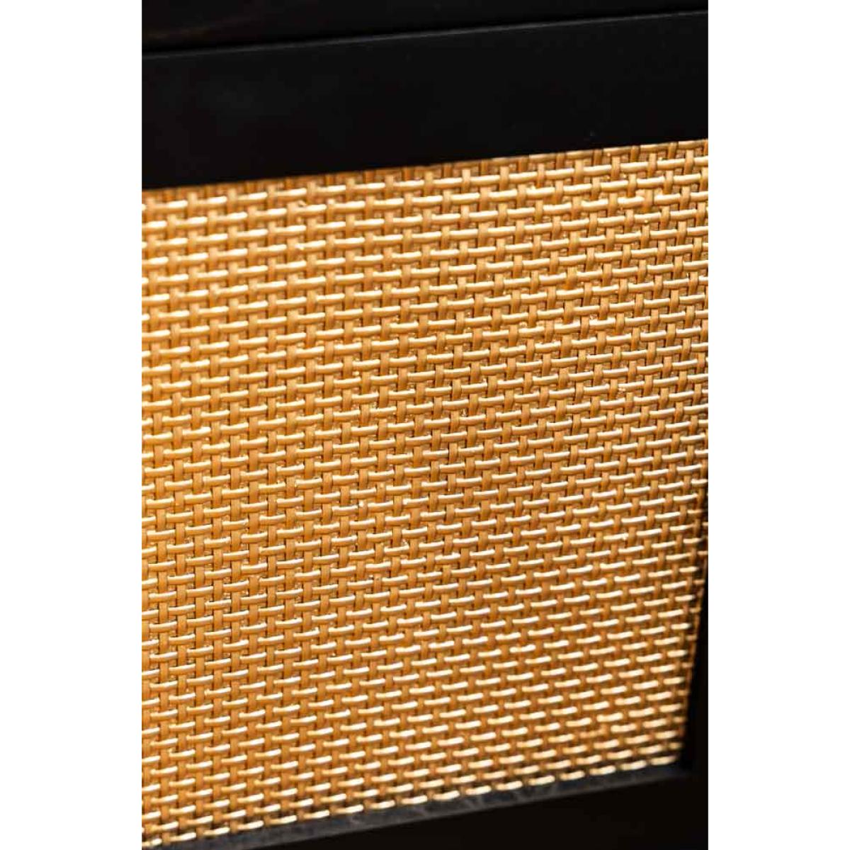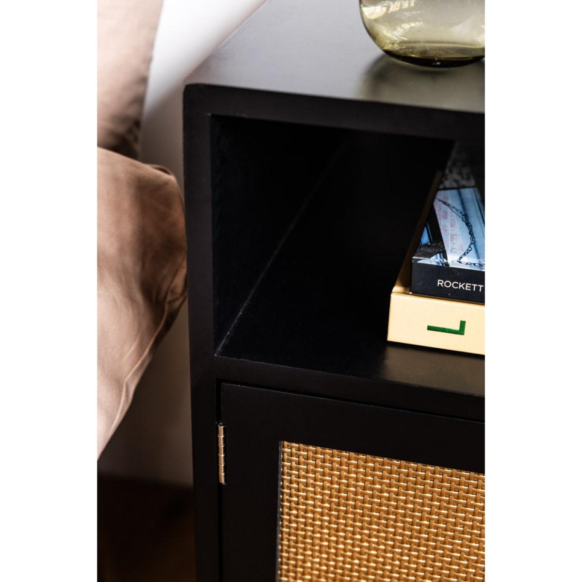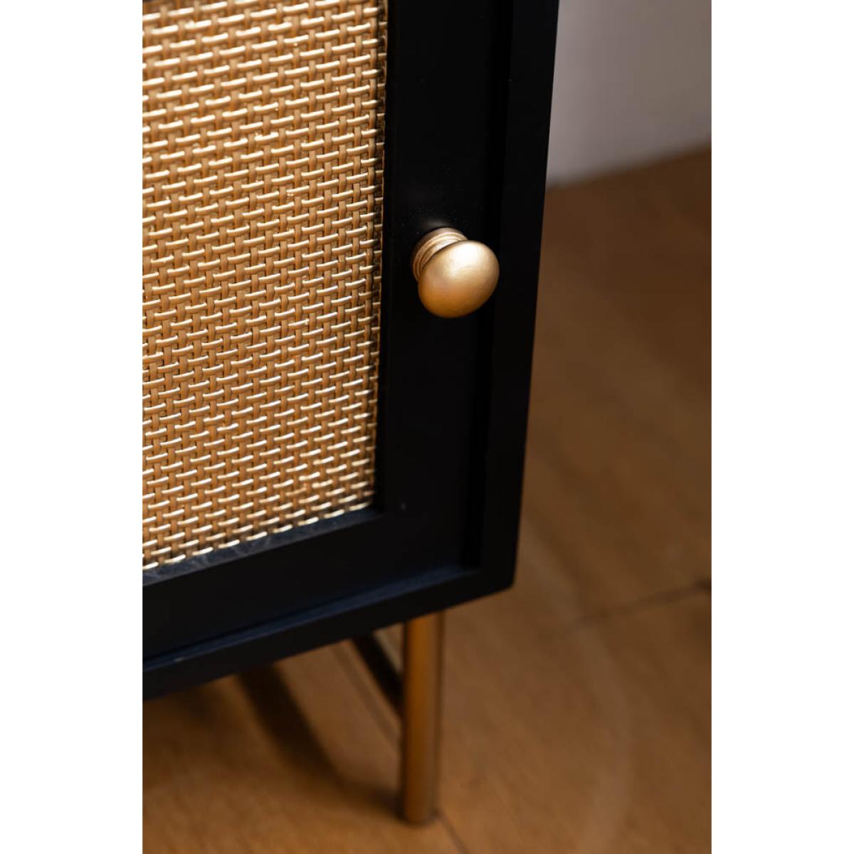 Introducing the effortlessly glamorous Black & Gold Rattan Bedside Table. Designed in-house, we wanted this bedside to celebrate the recent revival of rattan, with a signature Rockett St George twist. Instead of natural wood, we've gone for black and gold finishes for maximum glamour. It's beautiful, practical and promises to pair perfectly with your bed, whether you own a velvet beauty or a statement four-poster bed. With good looks in the bag, this modern bedside cabinet prioritises storage as well as style. A fabulous fit for smaller spaces where your bedroom furniture needs to work hard, the design features two shelf spaces for all your bedside essentials and a handy cupboard hidden behind the rattan door. A true statement piece, this Black & Gold Rattan Bedside Table will instantly elevate your bedroom decor with its bold yet timeless design. - Black Rattan Bedside Table - Measures: W48cm x D43cm x H68cm - Made from wood with gold metal legs and a drawer knob - Features two shelves and a storage cupboard