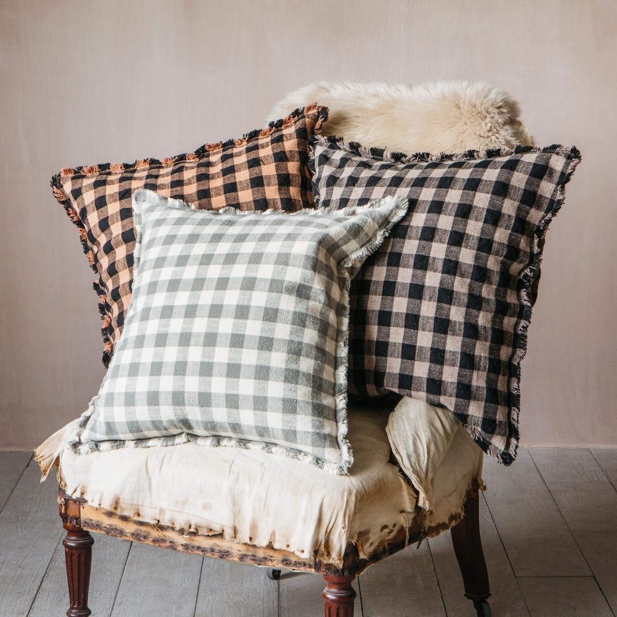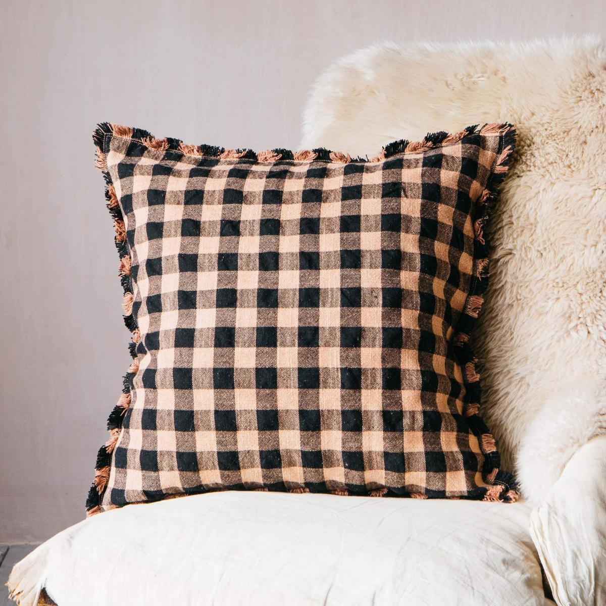 A soft cushion made of stonewashed cotton with a black and peach pink gingham print and tufted edges.