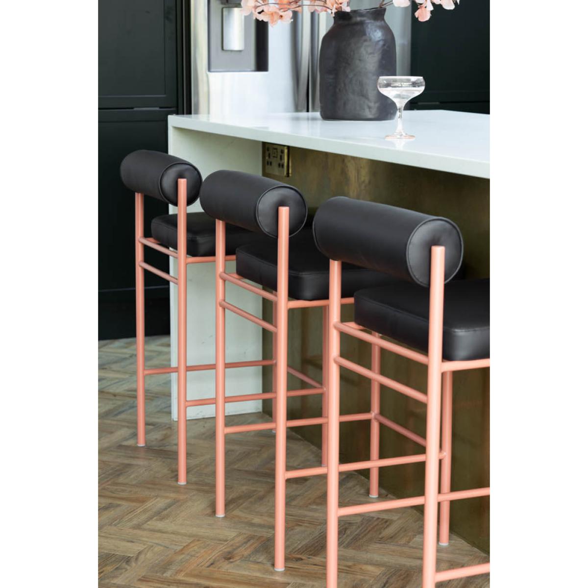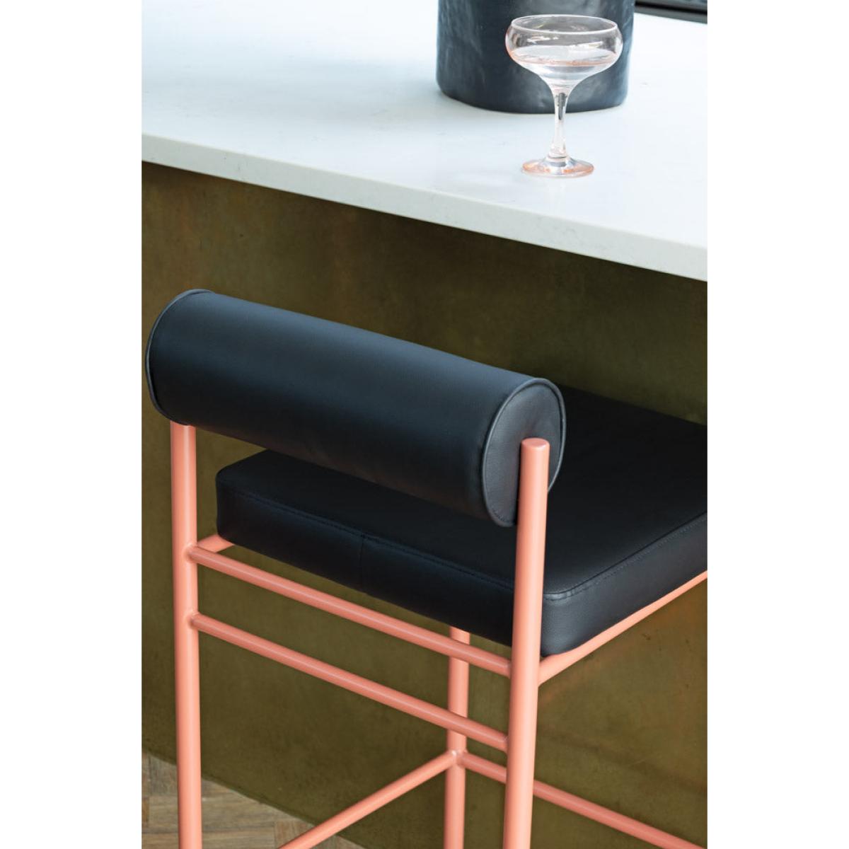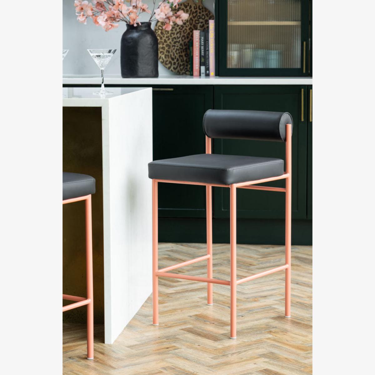 <!--td -- > Say hello to your new favourite kitchen barstool! With a cracking personality, this breakfast barstool takes the timeless roll-back design and gives it a playful, modern twist. First, let’s talk about the seat – wrapped in sleek black faux leather, it’s smooth, stylish and incredibly comfortable. The gently curved back offers just the right amount of support, so you can sit back and sit in style. Now, for the star of the show: those legs! A stunning peachy pink with a shimmering finish, they add the perfect pop of colour to modern kitchen and breakfast barstools. Chic? Check. Quirky? Absolutely. Perfect for kitchen counters, home bars, or anywhere that needs a bit more flair, this kitchen barstool is made for those who love a sprinkle of fun with their function. So, why settle for an average barstool when you can have one this fabulous? - Black and Pink Roll Back Bar Stool - Measures: H84cm | Seat - W40cm x D40cm | Seat Height: 65cm - Materials: Metal & PU Leather - This product should only be used on firm, level ground- Avoid exposing the furniture to excessive heat or direct sunlight as this can cause cracking of the wood and deterioration of the colour- Keep away from strong heat sources- Do not use this item if components are missing or broken- Wipe clean