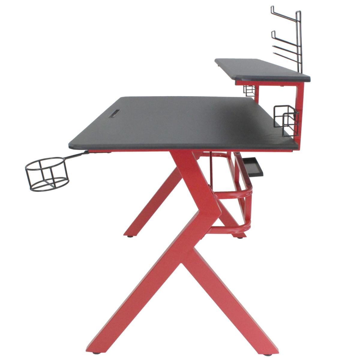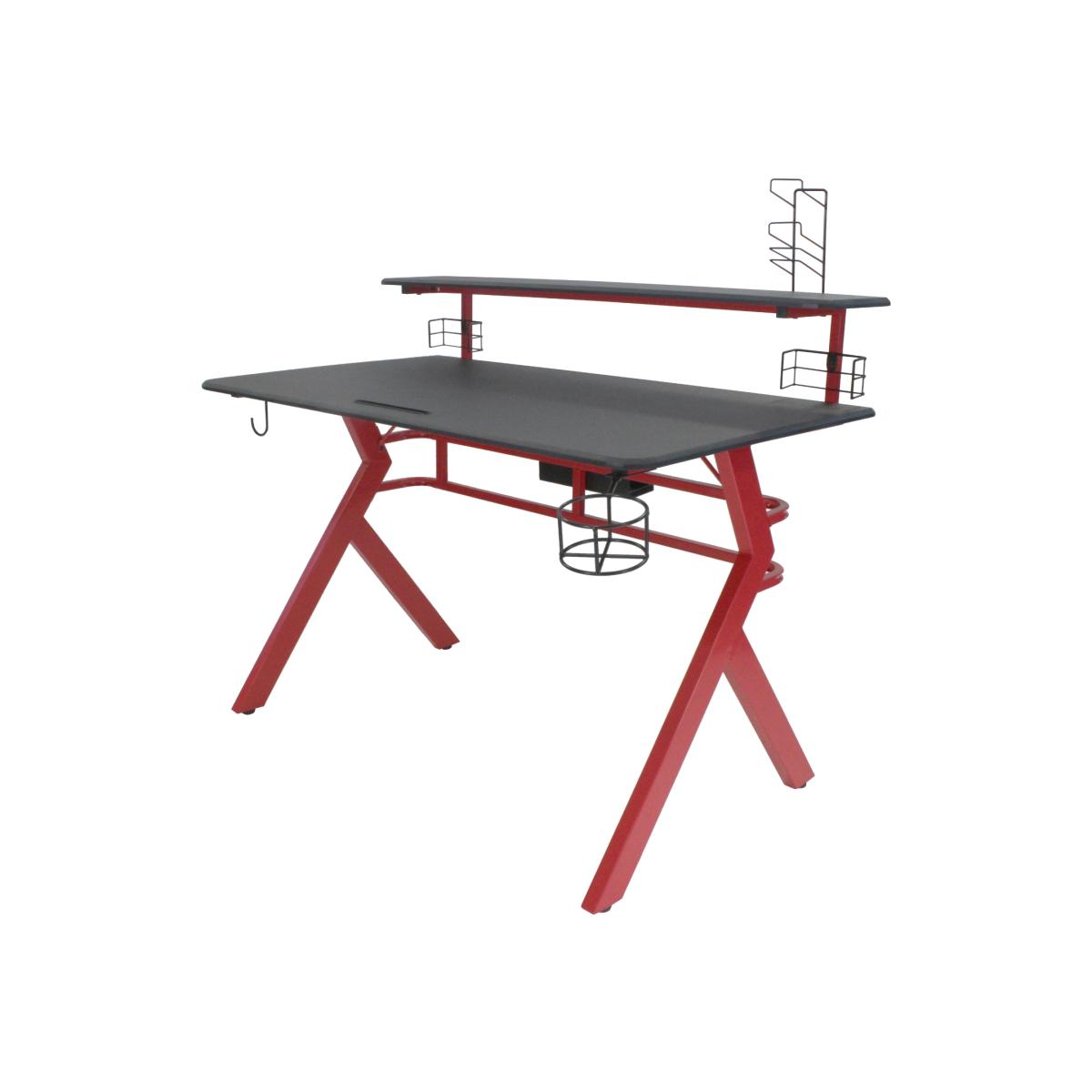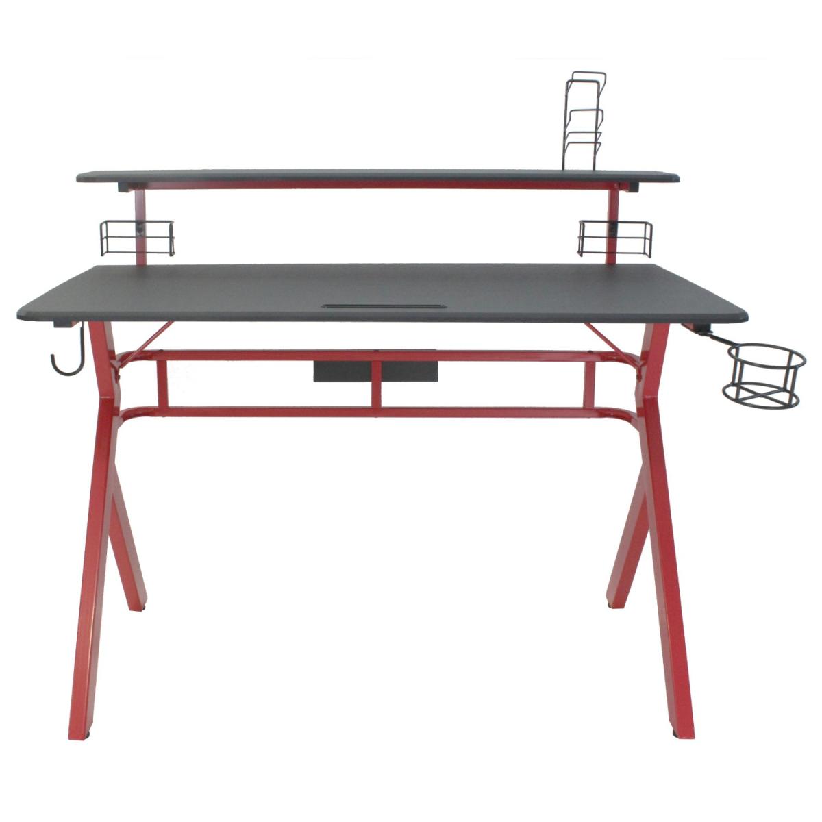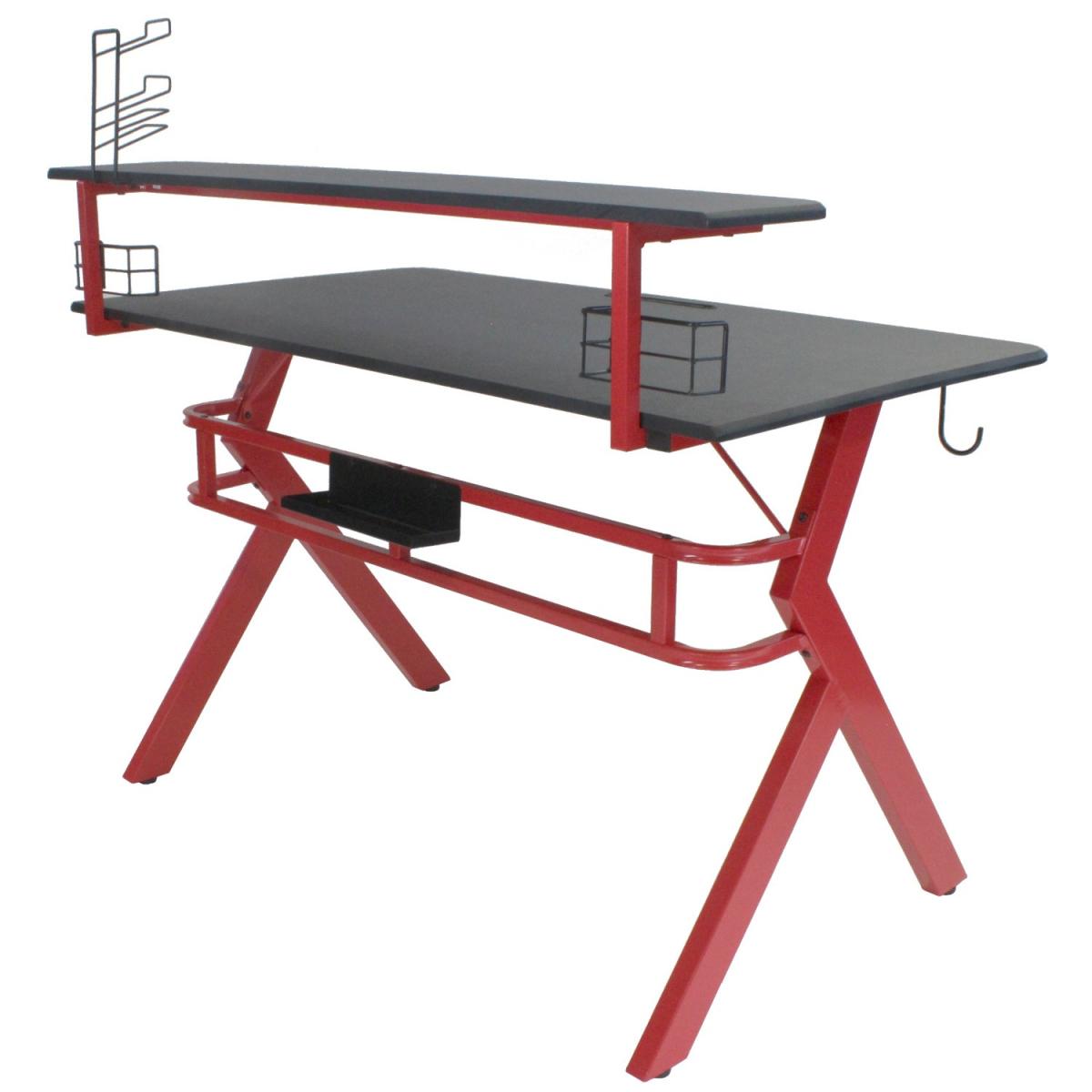 Dimensions:H96 x W120 x D68 cm Features: Gaming desk in black and red Features various holders for game controllers, headphones, etc Sturdy and durablesteel legs Assembly required