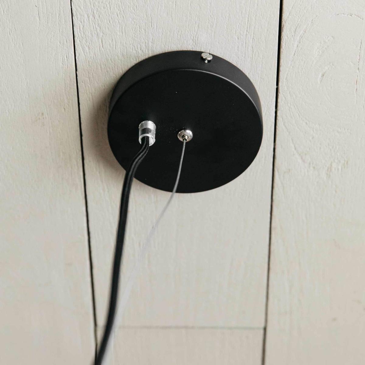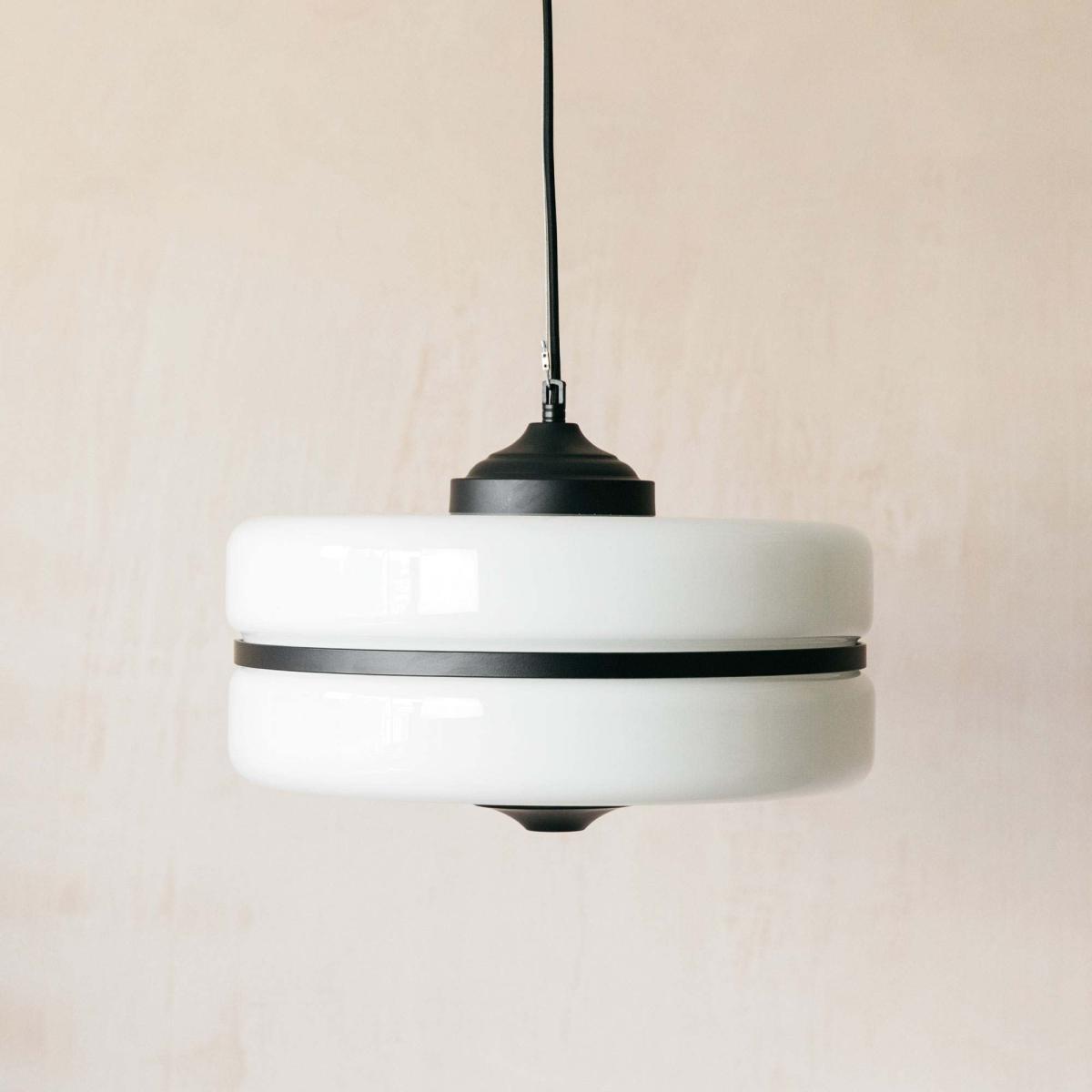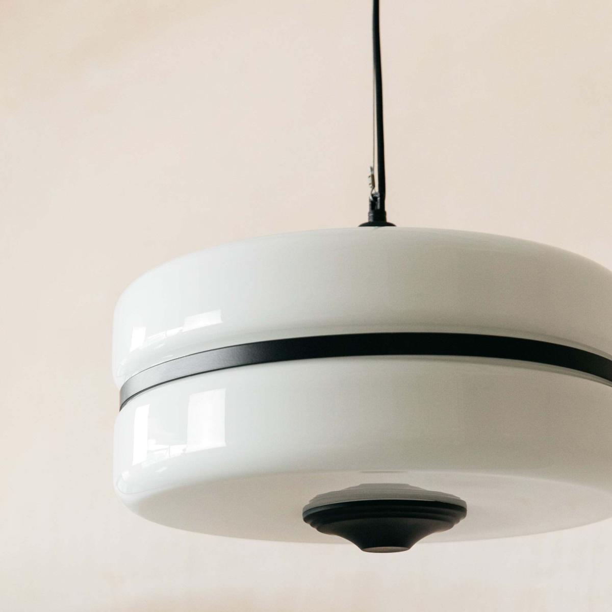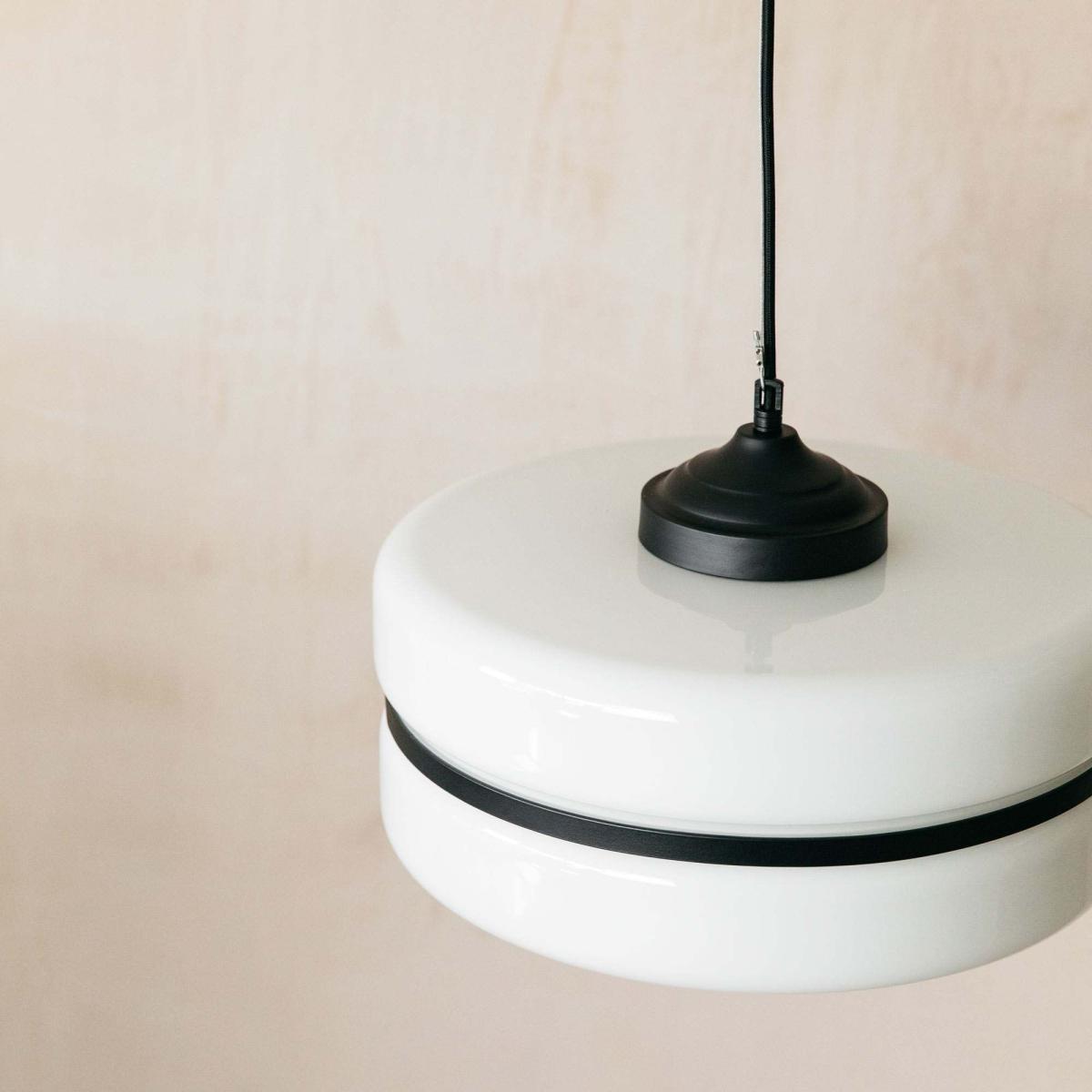 A classic monochrome pendant made from opaque white glass with a slim black metal band. An instant classic, this minimalist ceiling light creates functional yet stylish illumination.
