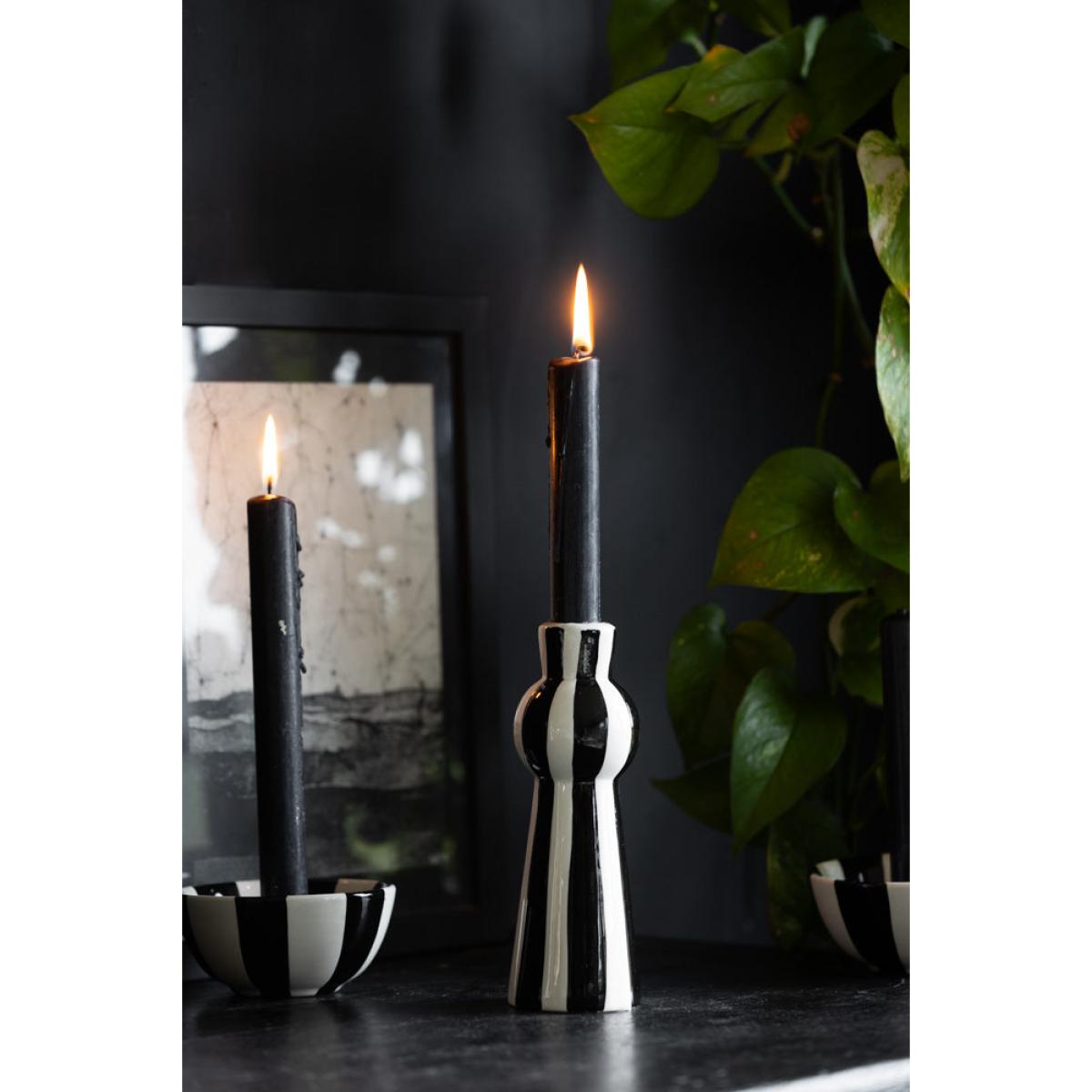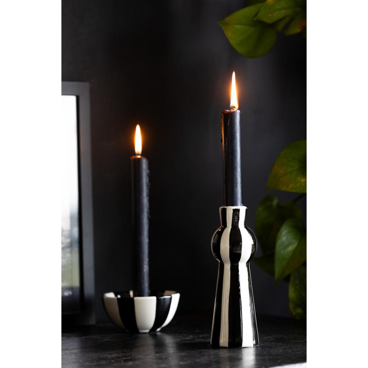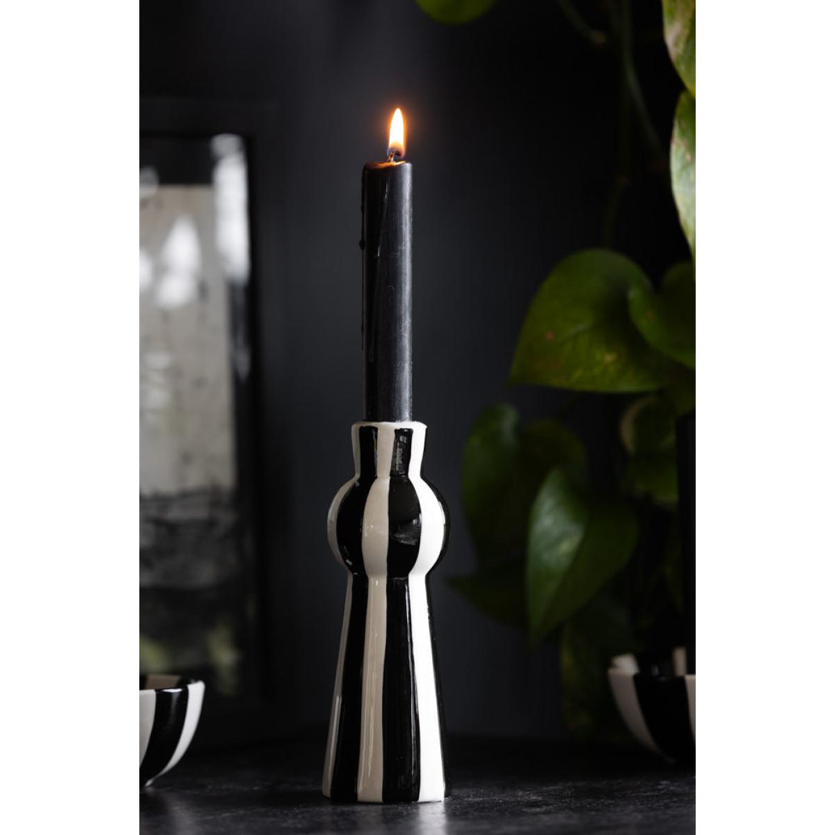Stripes are everywhere at the moment, and with good reason. As a timeless pattern that looks great with *everything*, you cannot go wrong with a sexy striped number like the Black & White Stripe Candlestick Holder in your home. Candlelight is magic, and we always recommend filling your home with as many candles as possible to create a relaxing atmosphere and a flattering, golden glow. Perfect for dinner candles, from tapered to twisted, colourful or striped designs, the tall-yet-curvy shape provides a chic base for showing off the beauty of candlelight. In addition, the bold black and white vertical stripes create a modern feature on your dining table, sideboard or shelves. One of our top styling tips is to introduce a set of stripe candle holders to a monochrome table display for a dreamy dining scene that packs a punch. Also available as a beautiful bowl candlestick holder, why not indulge your stripe obsession by buying both? - Black and white striped candle holder- Measures: W6cm x H17cm | Candle dia. 2.2cm- Never leave candles unattended in your home