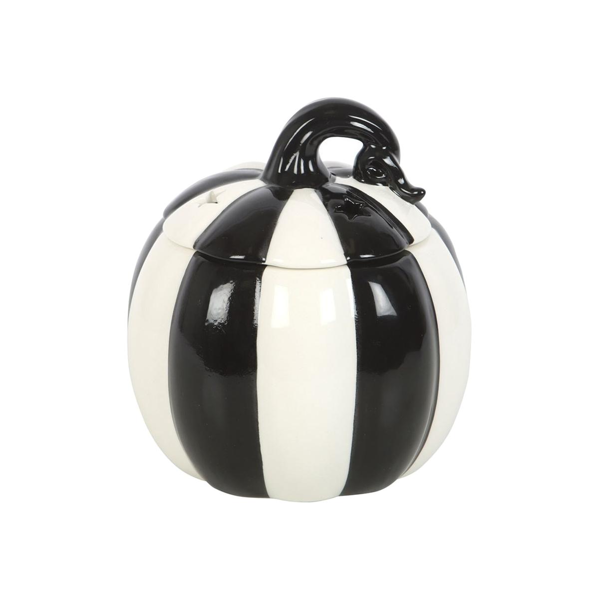 Make a dramatically stylish statement this season with this captivating Black and White Striped Ceramic Pumpkin Oil Burner! Perfect for your favourite fragrance oils. This isn't your traditional autumn pumpkin, it's a chic and modern take, ideal for those who love a touch of gothic elegance or bold monochrome decor. Beautifully crafted from quality ceramic, this pumpkin-shaped burner features striking vertical black and white stripes, creating a visually stunning piece. It's topped with a matching striped lid, complete with a distinctive black stem-style handle, which lifts off to reveal the dish for your chosen aromatics. Recommended for use with fragrance oil diluted with water. Always remove the lid whilst in use