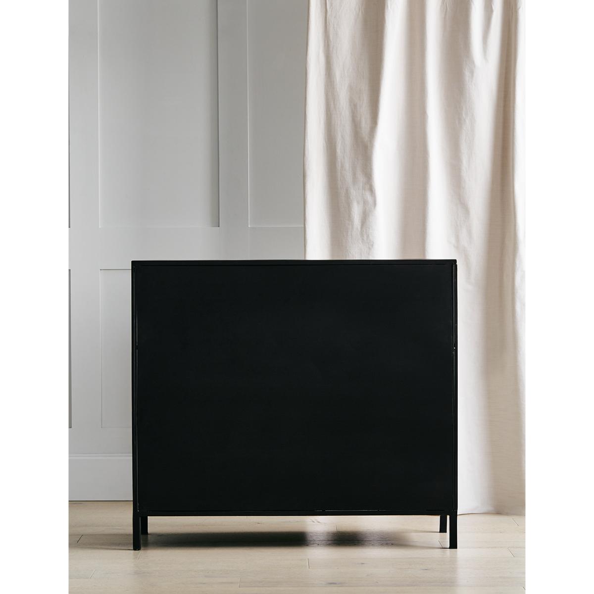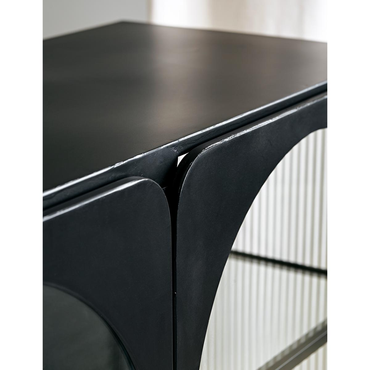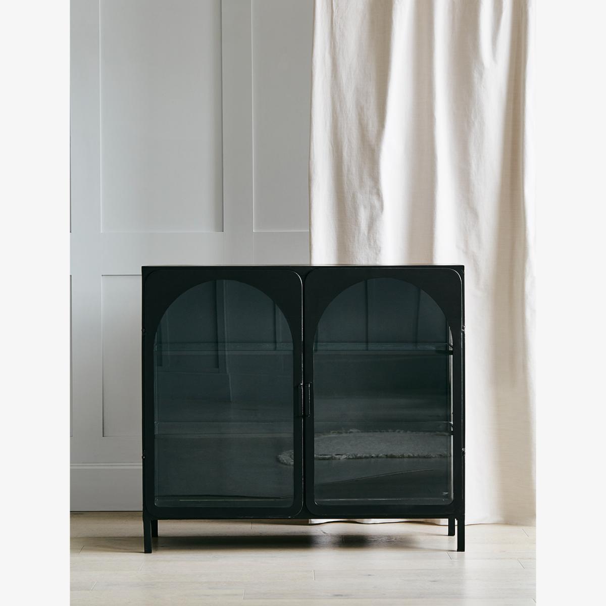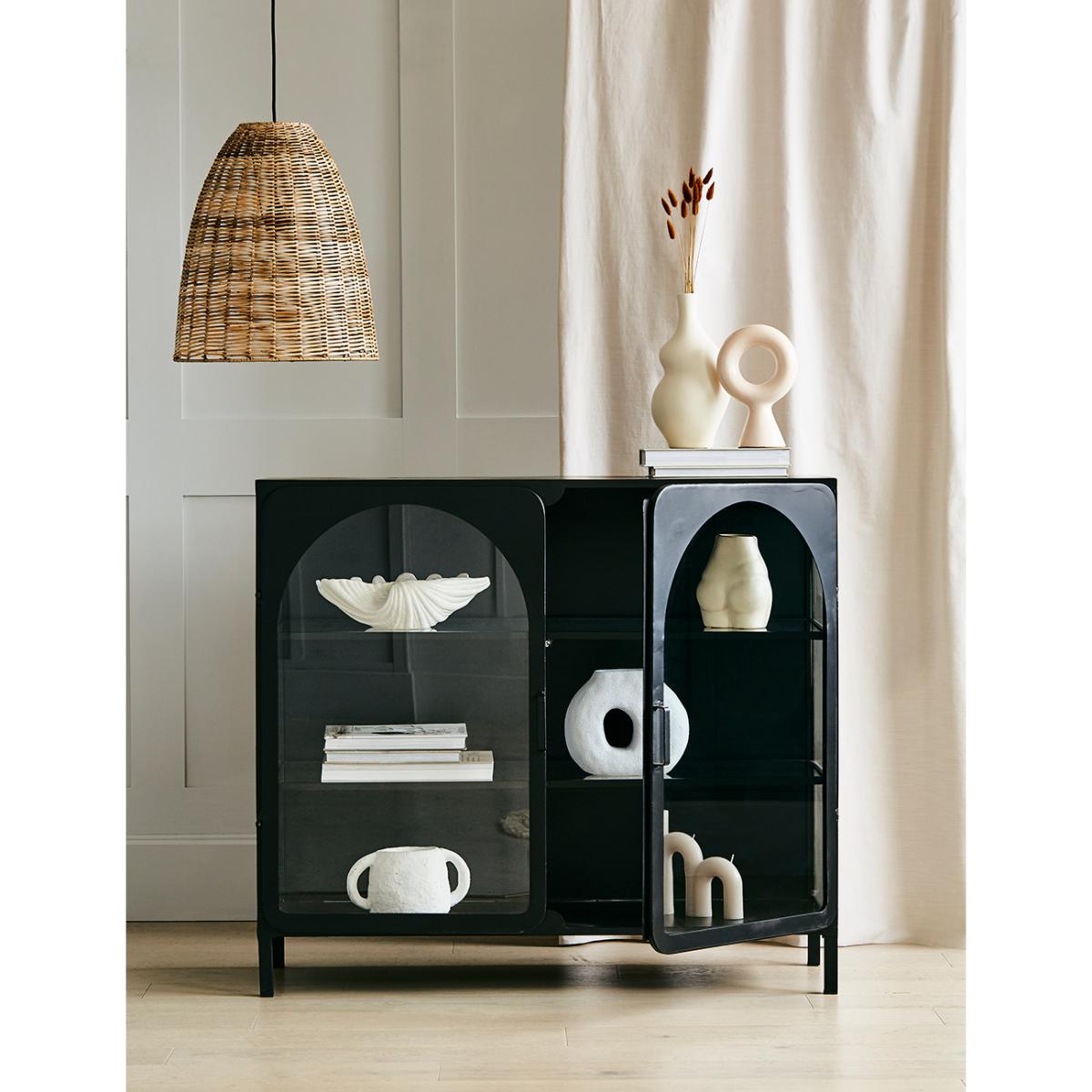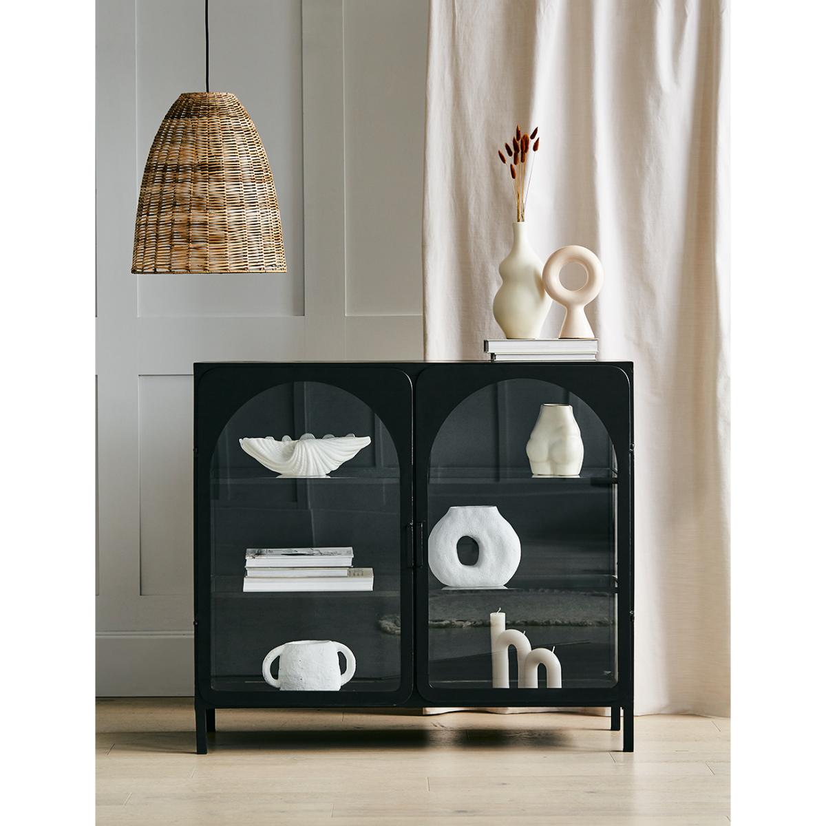 This black arch metal and glass cabinet has a sleek, contemporary appeal that works well in modern or industrial-inspired interiors. I love its minimalist structure paired with the glass doors, which make it ideal for showcasing decorative objects, glassware, or art pieces. To style it effectively, consider placing it in a living room or dining area with monochrome or natural tones, adding a few curated accessories or plants to soften the metal and glass textures. Practical tips include using its transparency to your advantage by lighting inside with LED strips for an eye-catching display, and pairing it with other matte or textured finishes to create visual interest without overwhelming the space.