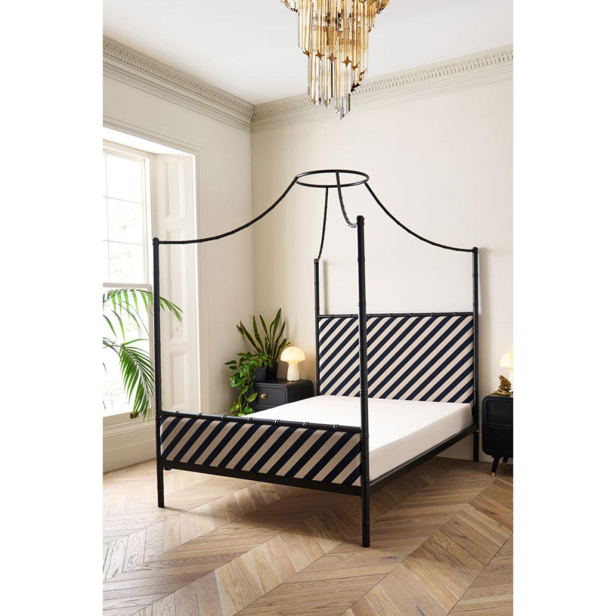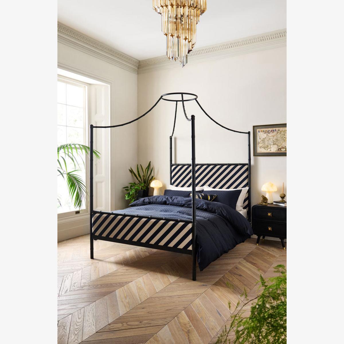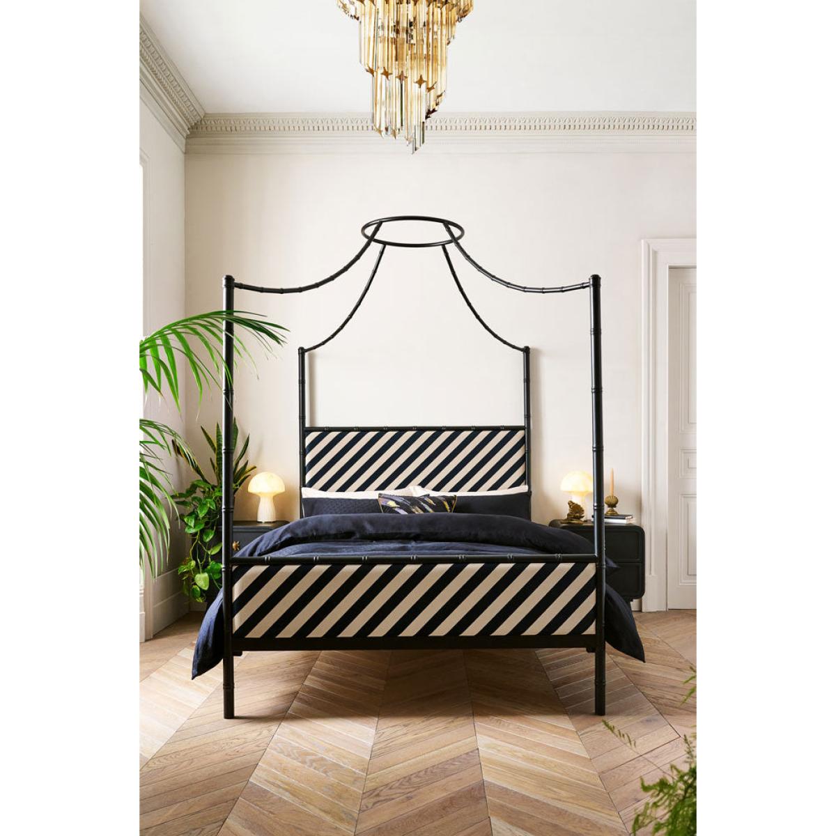 <!--td --> Fancy a four-poster? Of course you do! Well, your wish is our command. This striking metal-framed bed is cleverly designed to work au naturel, with the frame on display loud and proud (and isn’t it a cracker?!) However, the square-set framework arcs cleverly above the bed to converge in a hoop from which you can drape linen, cotton or, if you’re feeling VERY posh, swathes of silk. This creates the classic four-poster look (they were originally designed to create a canopy around the bed to keep the cold out – think of it as a very fancy-pants draught excluder). The whole shebang is brought bang up to date with the addition of the Rockett St George signature stripe, which gives the piece a modern, directional feel. RSG co-founder Jane is adamant that our bedrooms are sacrosanct – a tranquil and treasured space in which we can retreat and relax. Use this bed to help create your sanctuary and the boudoir of your dreams.- Black Bamboo-Inspired Four Poster Bed- Available in two sizes: King and Double. King: 210cm x W209cm x D158cm; Double: H210cm x W199cm x D143cm - Material: Matt black metal and fabric