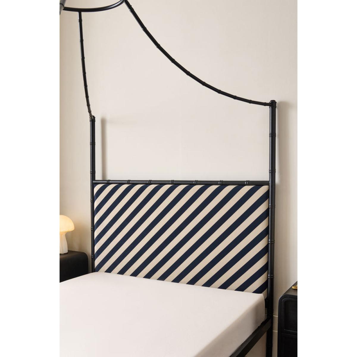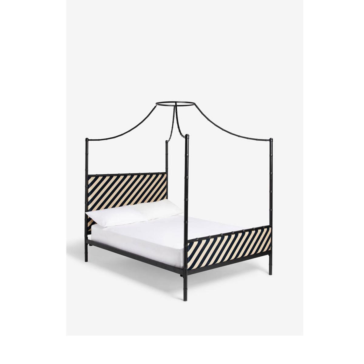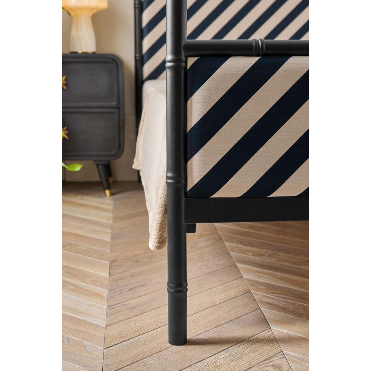 <!--td --> Fancy a four-poster? Of course you do! Well, your wish is our command. This striking metal-framed bed is cleverly designed to work au naturel, with the frame on display loud and proud (and isn’t it a cracker?!) However, the square-set framework arcs cleverly above the bed to converge in a hoop from which you can drape linen, cotton or, if you’re feeling VERY posh, swathes of silk. This creates the classic four-poster look (they were originally designed to create a canopy around the bed to keep the cold out – think of it as a very fancy-pants draught excluder). The whole shebang is brought bang up to date with the addition of the Rockett St George signature stripe, which gives the piece a modern, directional feel. RSG co-founder Jane is adamant that our bedrooms are sacrosanct – a tranquil and treasured space in which we can retreat and relax. Use this bed to help create your sanctuary and the boudoir of your dreams.- Black Bamboo-Inspired Four Poster Bed- Available in two sizes: King and Double. King: 210cm x W209cm x D158cm; Double: H210cm x W199cm x D143cm - Material: Matt black metal and fabric