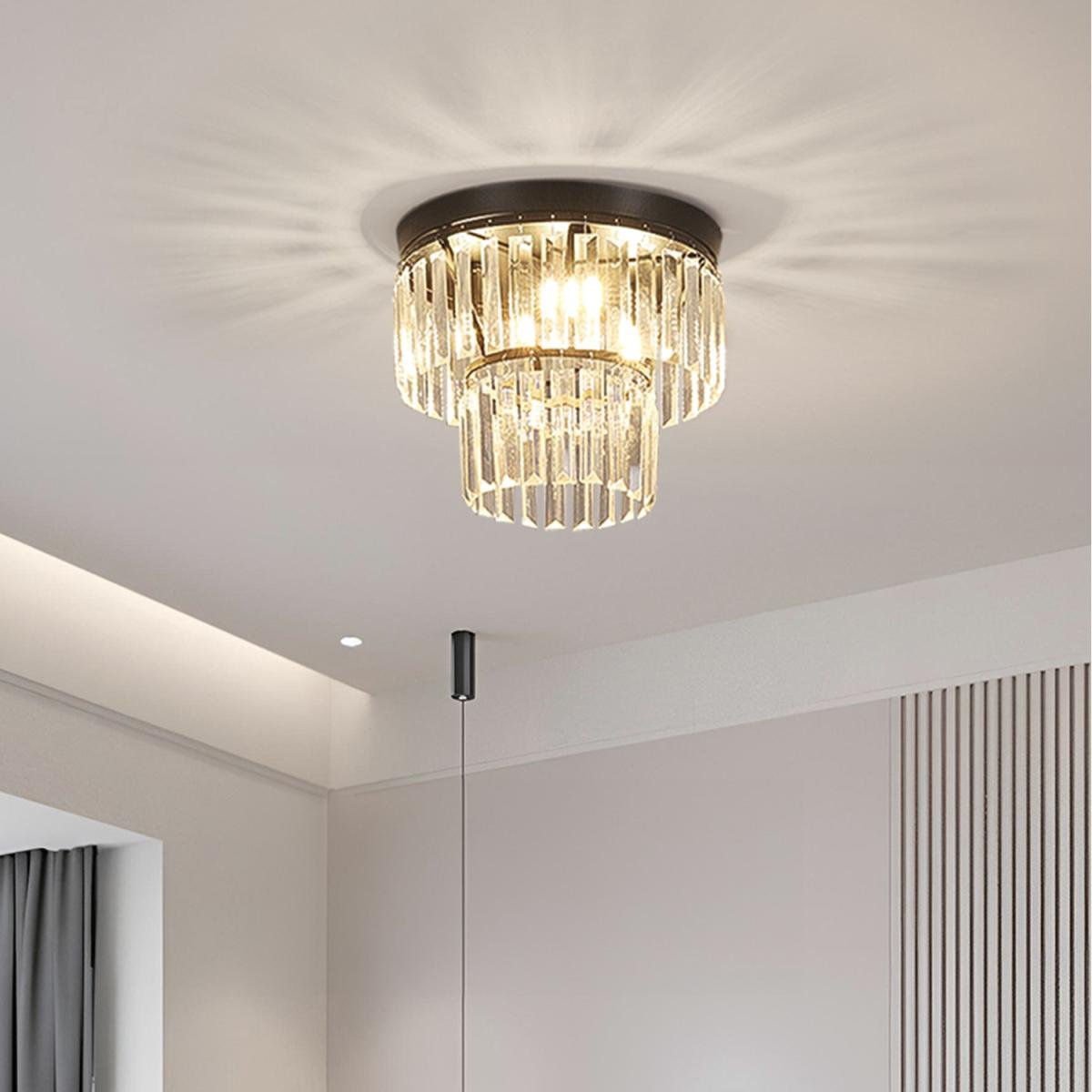 This crystal ceiling light is the perfect choice for enhancing your room's decor. Featuring two layers of crystals at varying heights, it adds depth and dimension to any space. The high-quality crystals and unique design reflect stunning light, not only fulfilling your lighting needs but also elevating the overall beauty of your space. The base, crafted from iron and coated with black paint, further accentuates the elegance of the fixture while ensuring long-term durability. Ideal for a variety of settings, this ceiling light beautifully combines aesthetics with practicality.