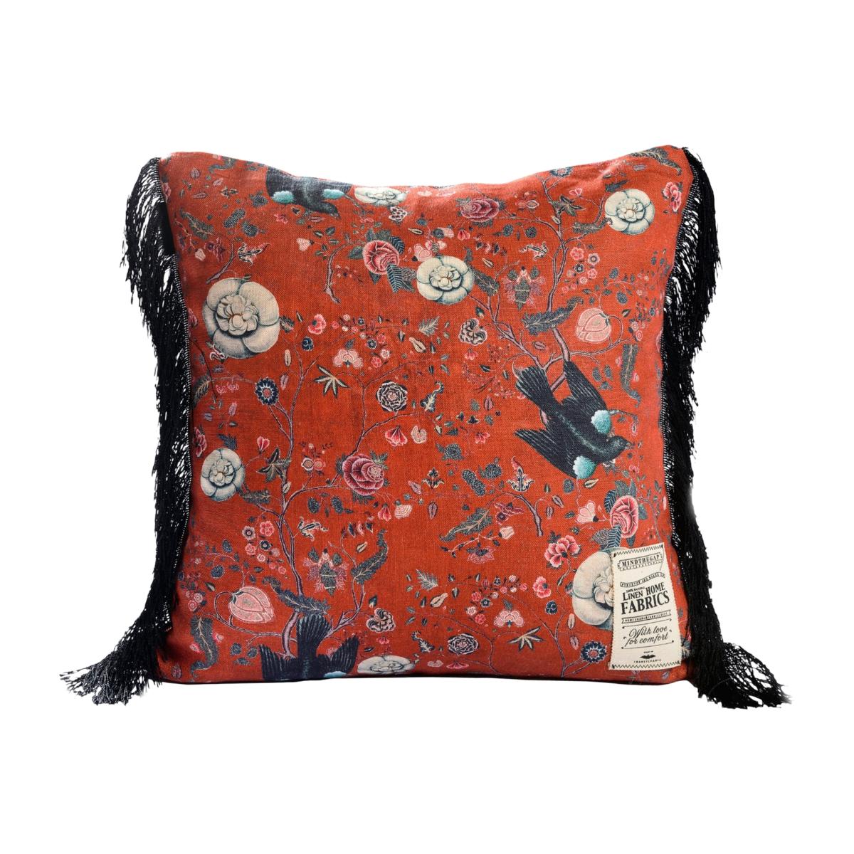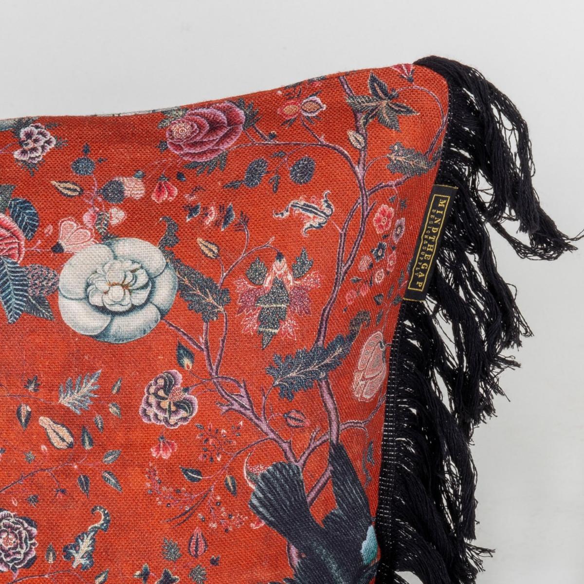 An interesting artwork, on a red background, with spectacular floral motifs, inspired from the bohemian lifestyle. MINDTHEGAP's distinctive cushions show beautiful patterns and details of our fabrics. Made on heavy linen or cotton pile velvet, all cushion are printed in Romania by using traditional methods. To achieve a unique vintage effect and to get more softness, our linen cushions are stonewashed finished. The fillings are made of duck feathers in order to keep the natural look of the cushion and also a good shape for long time.