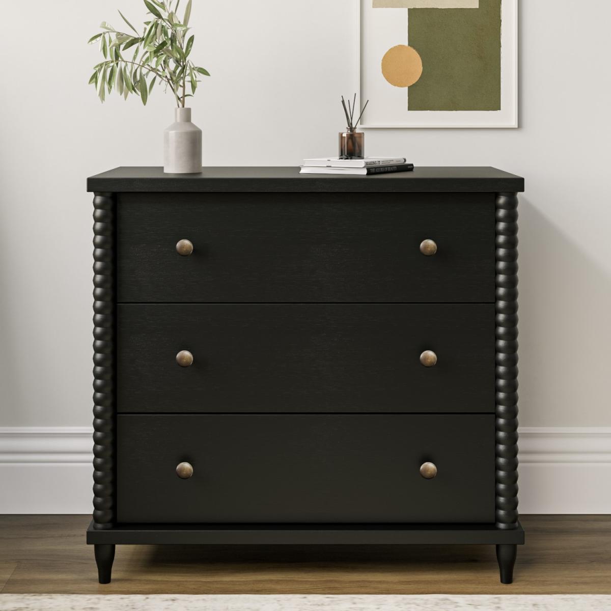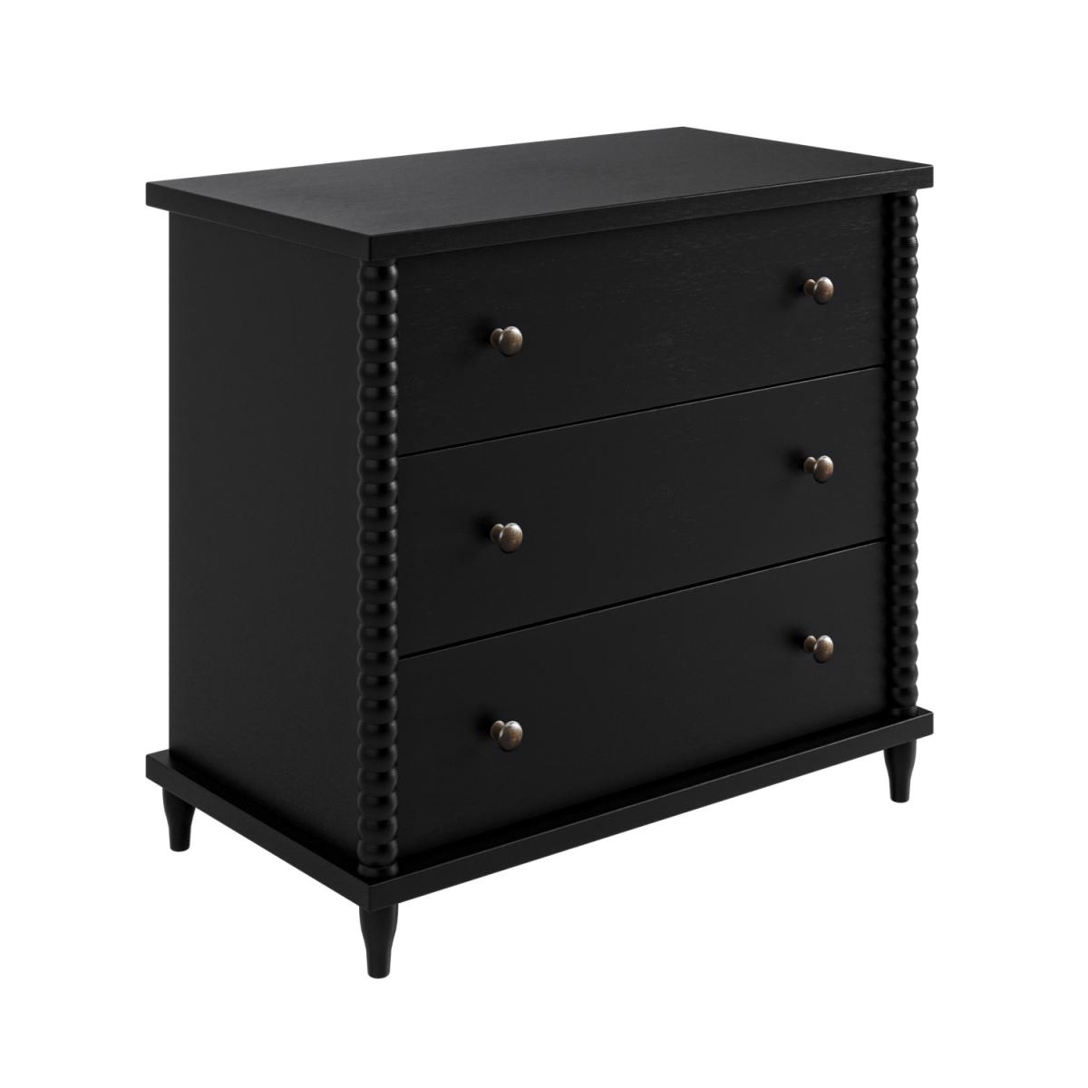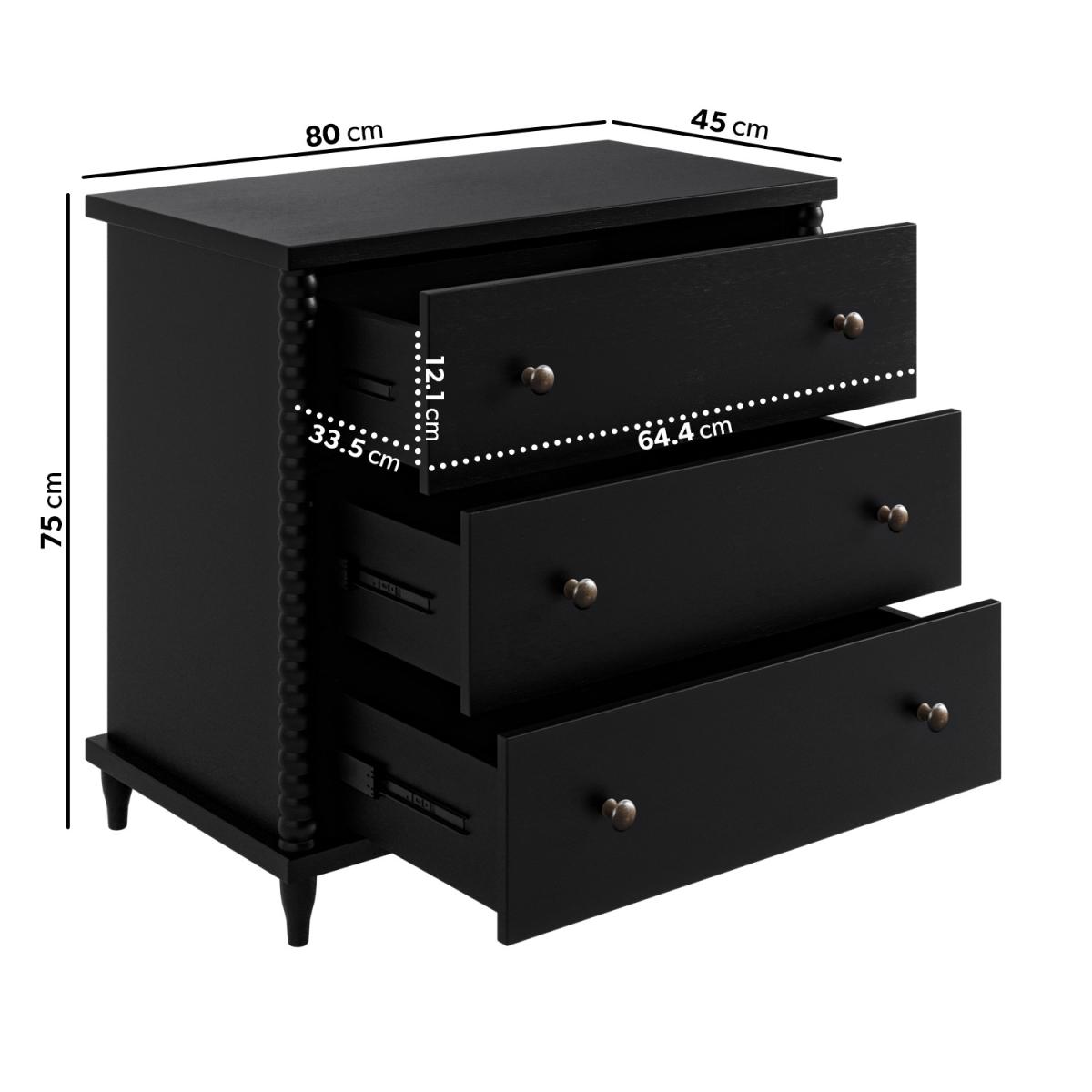 All about me The Alma chest of drawers is guaranteed to create a stylish statement in any bedroom, with round bobbin legs that add a distinctive touch. The sleek black painted finish brings a classy finish to any interior. Need to know Dimensions: W80 x D45 x H75 cm Weight: 22.5 kg Number of drawers: 3 Drawer dimensions:W64.4 x D33.5 x H12.1 cm Runners: Metal Colour:Black Finish: Lacquered Material: Solid pine and MDF (back panel and drawer base) Assembly required: Yes Packaging dimensions: W90.2 x D56.6 x H21.1 cm