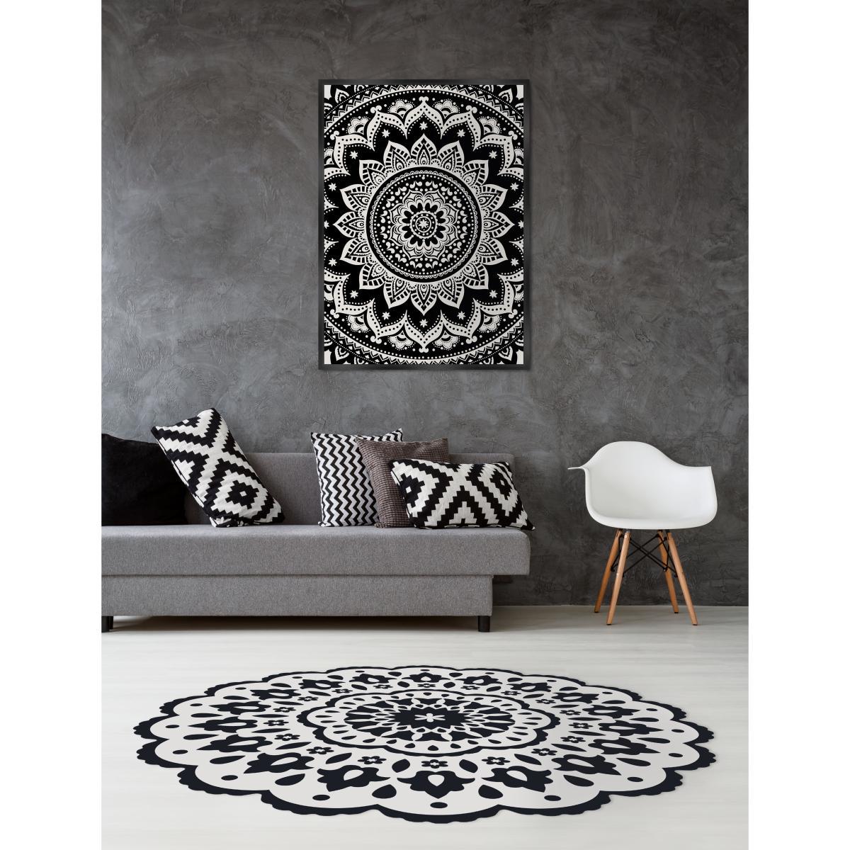 From the kitchen to the bedroom via the bathroom or terrace, the vinyl rug is taking over our homes! Easy to maintain, the vinyl rug is easy to clean: it has nothing to fear from crumbs, water, stains or UV, and is ideal for outdoor use. Like true floor paintings, vinyl rugs come in ultra-graphic prints: they delimit and personalise space by creating a unique, original decoration. Follow in the footsteps of the most ancient rituals with this ethnic mandala-style pattern with its black and white look. A Buddhist meditation aid, the mandala is a circle filled with complex symbols representing the movements of the universe. Its elaborate graphics, almost hypnotic, immerse you in an initiatory journey rich in sensory discoveries.