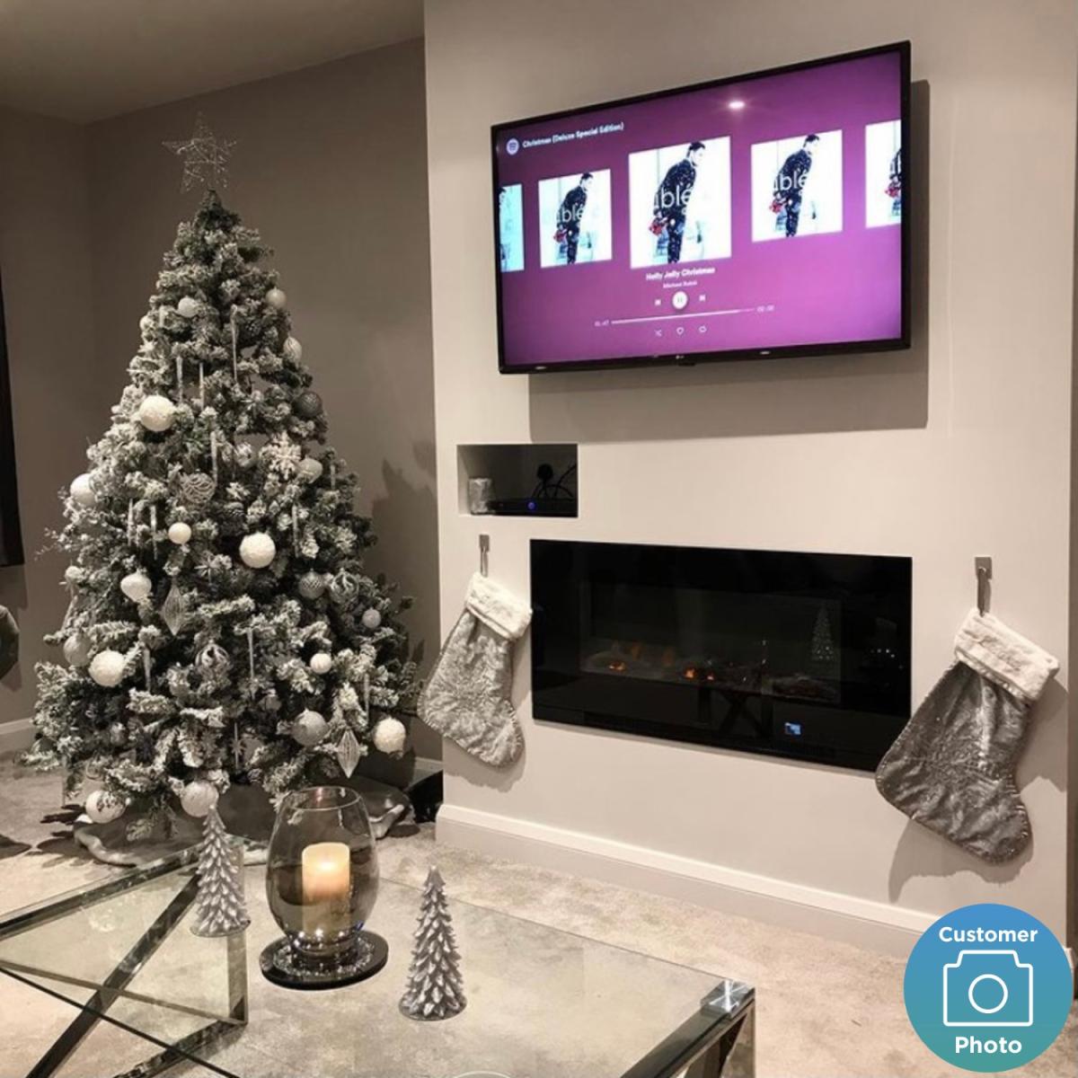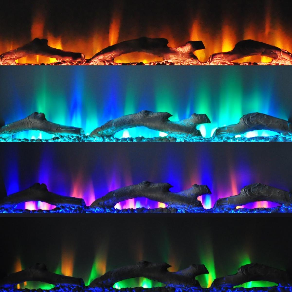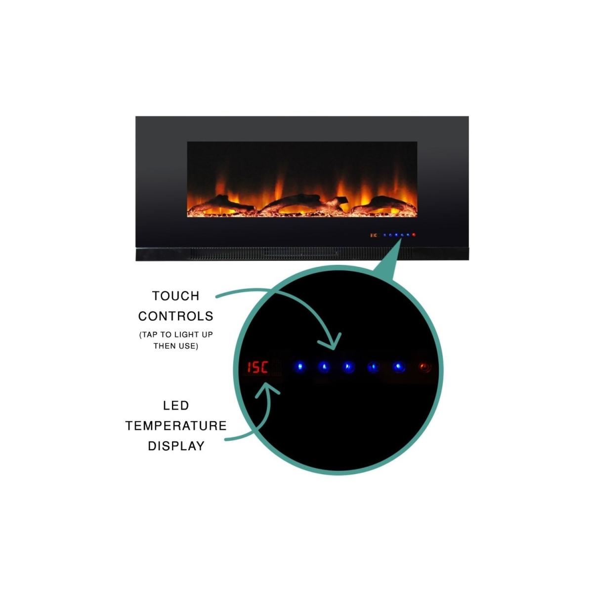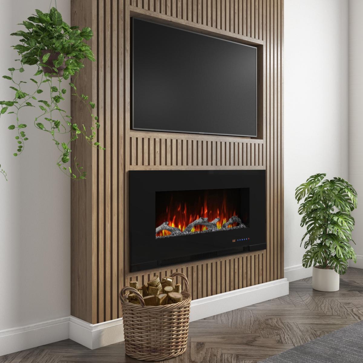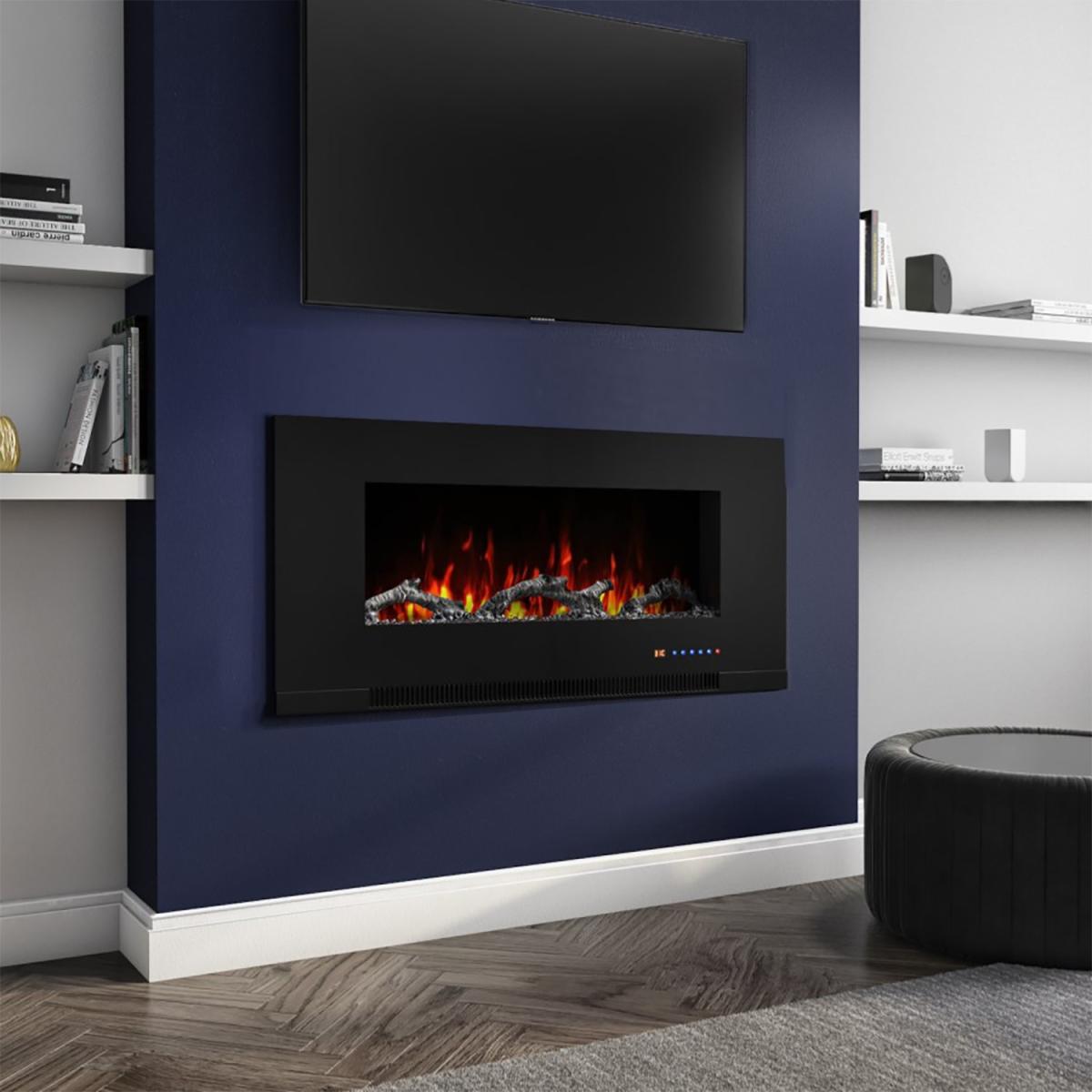 Features we love Stylish built-in fire in a sleek black glass finish. Would make the perfect attribute to a media wall. With 10 LED flame colour and fuel bed colour settings. Use the fire with or without the heating element A handy thermostatic remote control included All about me. Transform your room into a cosy yet ultra-modern abode with this sleek glass front fire. With realistic flickering flames and a believable log and crystal fuel bed both of which have ten colours to choose from you can set the colour combination of your choice for the perfect setting. It also includes two heat settings and remote control to make changes without even getting up from your sofa or manually via the controls on the side of the fire. You can mount it straight to the wall as it comes with a wall bracket for easy installation or set it in for a seamless look; you could even create your own media wall Need to know. Dimensions. W106.7 x D11.9 x H50.2 cm Wall Recess Dimensions. W82 x D11.9 x H43.8 cm Style. Wall mounted or inset Material. Metal and; glass Finish. Black glass Colour. Black Cable Length. 1.85m - exiting the fire from the bottom right hand side Heat Settings. 2 - 0.7kW and 1.3kW 0.7KW setting. = 10p per hour* 1.3KW setting. = 18p per hour* Voltage. 220-240V Fuse. 13 AMP Weight. 21.4kg Controls. Digital touch display and remote control included Safety thermal cut off. Yes Fixings included. Yes – Wall bracket Assembly Required. No - just fix to the wall plug in and go!Temperature scale is featured on the front of the fire. No flue or chimney is required *Costs are based on the UK average cost of 1kw per KWh. Cost will vary depending on your tarrif.