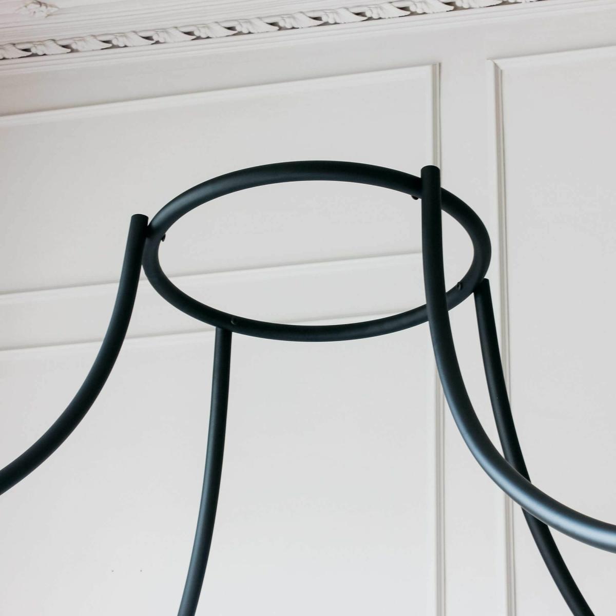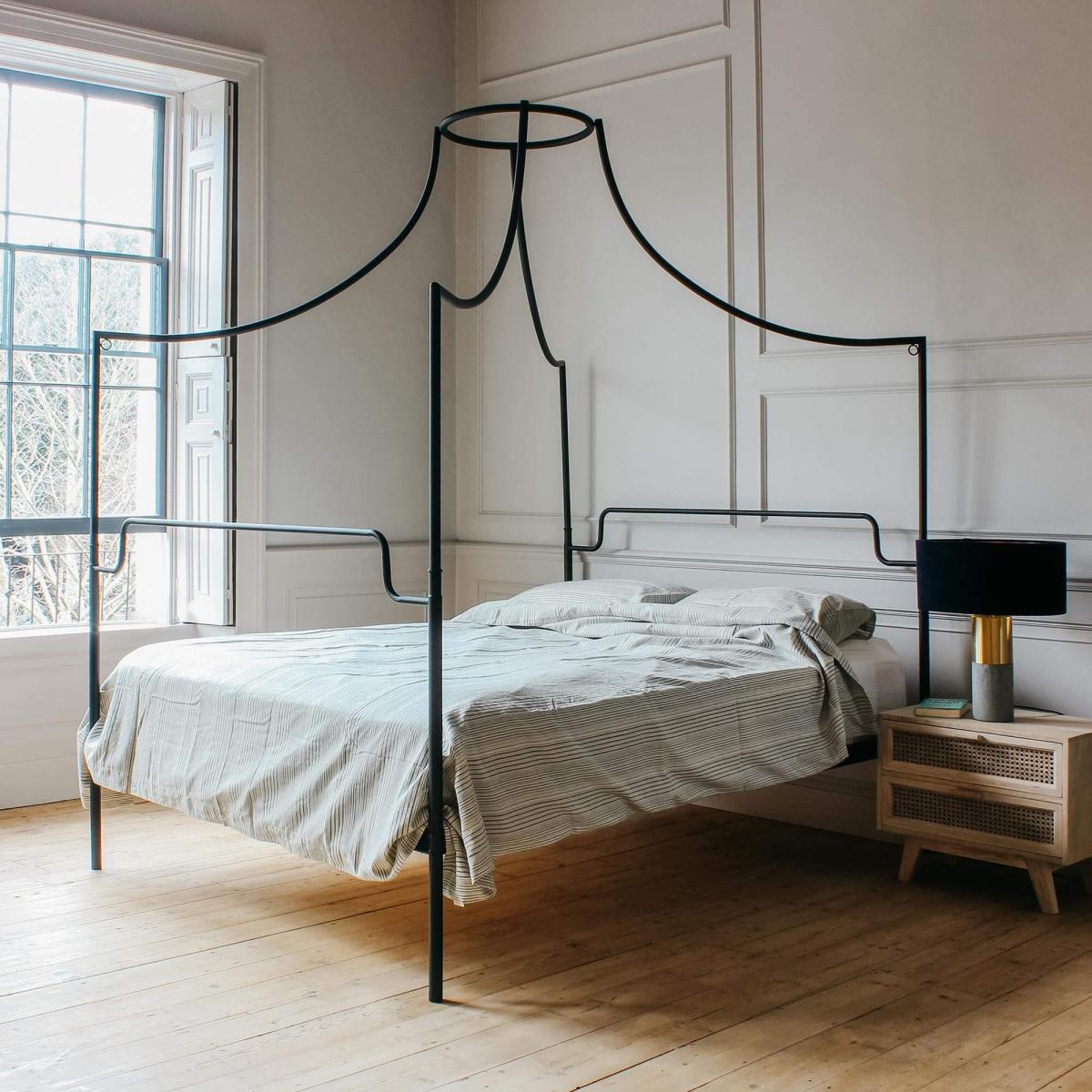 With a regal flourish, sleep beneath the scrolling curves of this black iron canopy bed. Layer with soft linen bedding and lavish velvet cushions for a refined look.