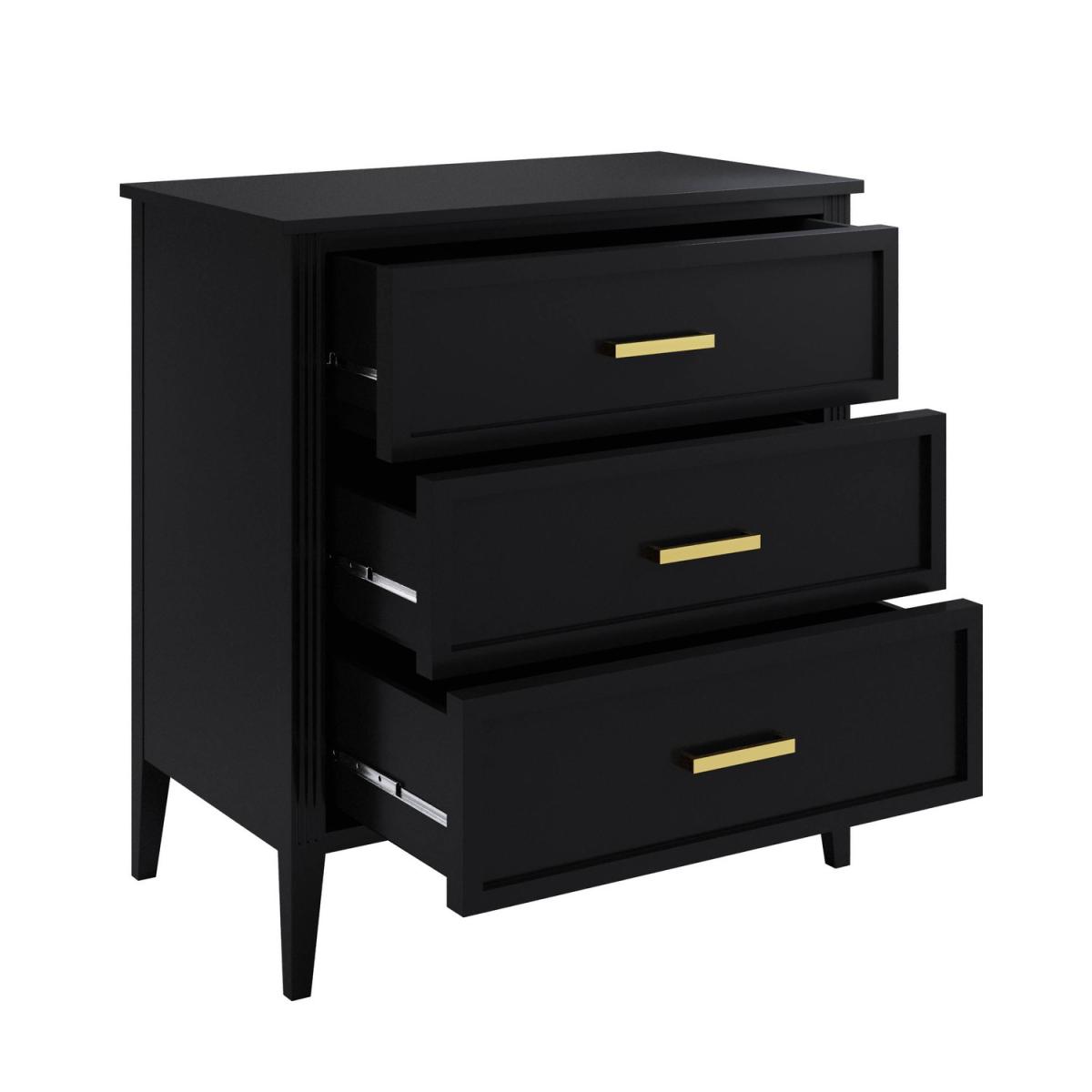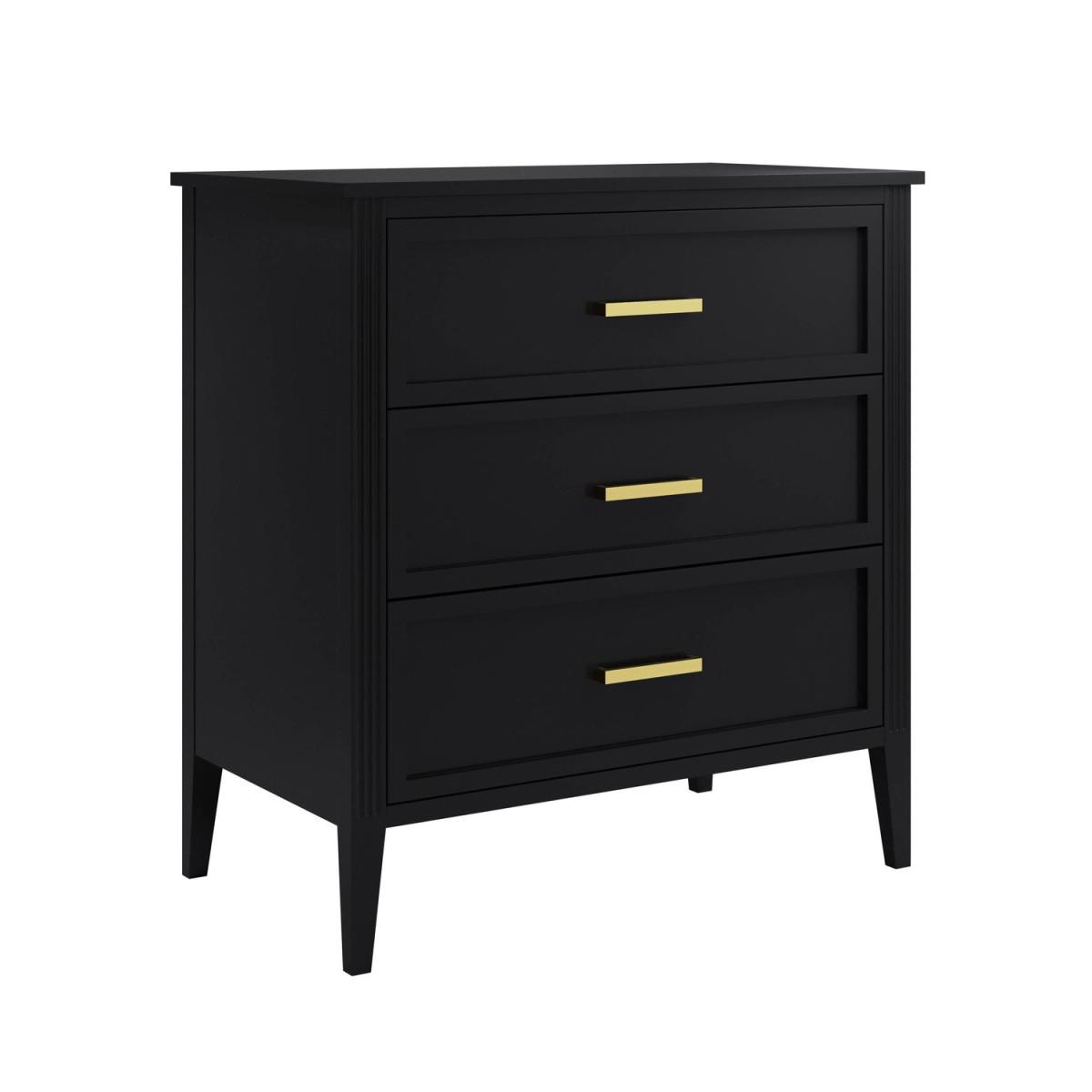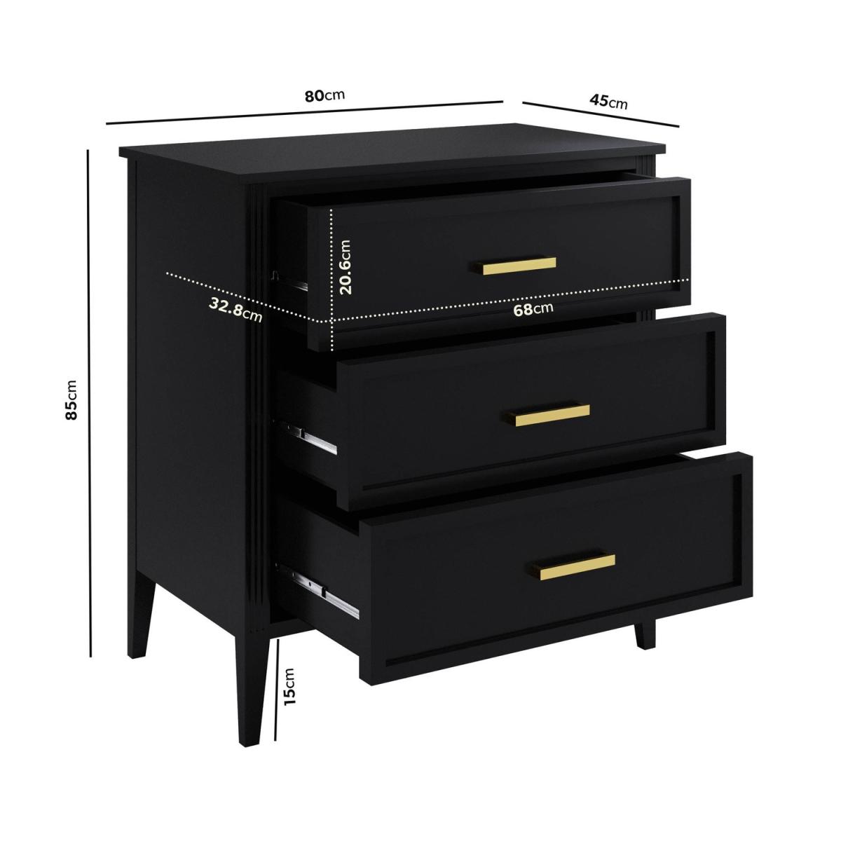 The matt black finish gives a modern and minimalist vibe and blends effortlessly with various colour schemes. Classic charm meets modern sophistication with fluted side details and golden accents. Offers lasting stability and elegant style while keeping the space feeling open and airy. Perfect for both traditional and contemporary interiors. Three spacious drawers to neatly store your bedside essentials. The Wide Delilah Chest of Drawers is a stylish addition to your bedroom. This timeless piece is a modern twist on a usually classic design. Providing ample storage for your clothes, this chest comes with 3 large drawers and a spacious top surface to display your favourite items. Complete with elegant brass handles and crafted with solid pine, this chest of drawers is built to last. Dimensions: W80 x D45 x H85 cm Base to floor height: 15 cm Inner drawer dimensions:W61.4 x D32.8 x H12.5 cm Weight: 28.7kg Number of drawers: 3 Colour: Black Finish: Matt Material: Solid pine & MDF Assembly required: Yes Packaging dimensions: Box 1: W56.5 x D97.4 x H22 cm