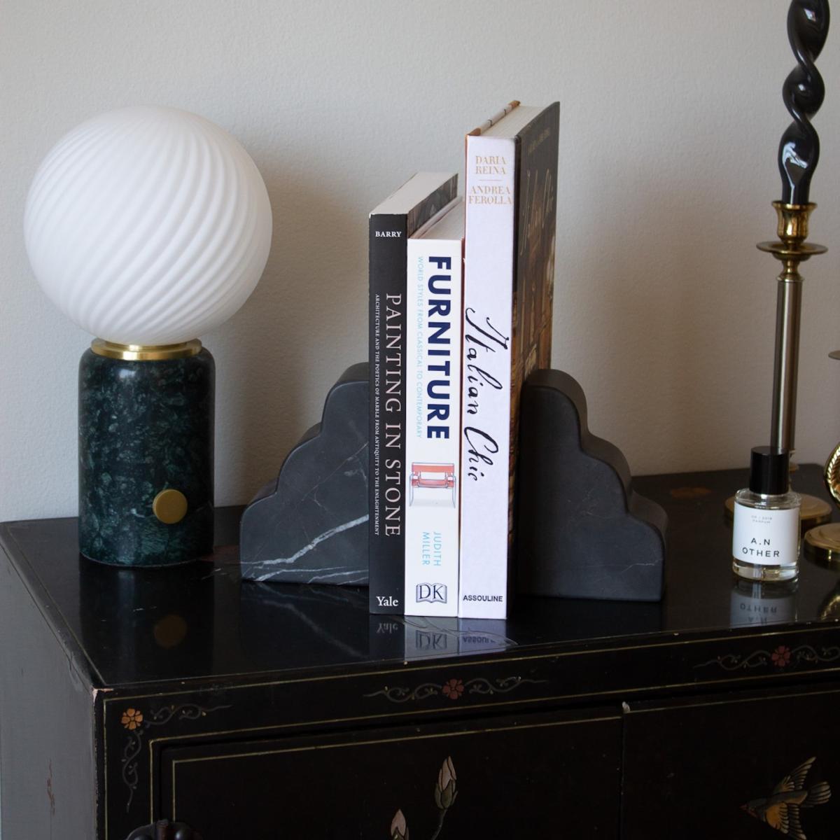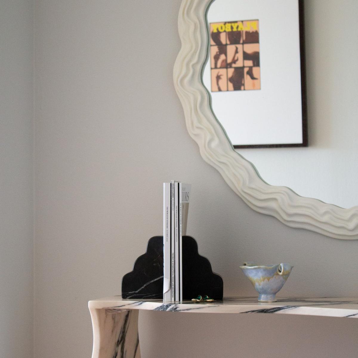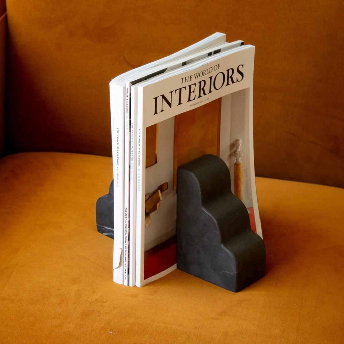 An exclusive collaboration with Maison Rogue. Our design inspiration began with a look at vintage bookends, objects that created nostalgia for libraries of times past. Everything we had seen was angular so we aimed to create something new. We wiggled our pen, in an attempt to undo the rigid lines, and fell in love with the resulting shape. Wrapped around a stack of books, these pieces appear as clouds. Individually each piece acts as a little sculpture. Using nero marble, these bookends are fabricated by hand. Each curve is grinded down meticulously and finished in a rough honed texture. They are made sustainably utilizing marble offcuts. Sold individually.