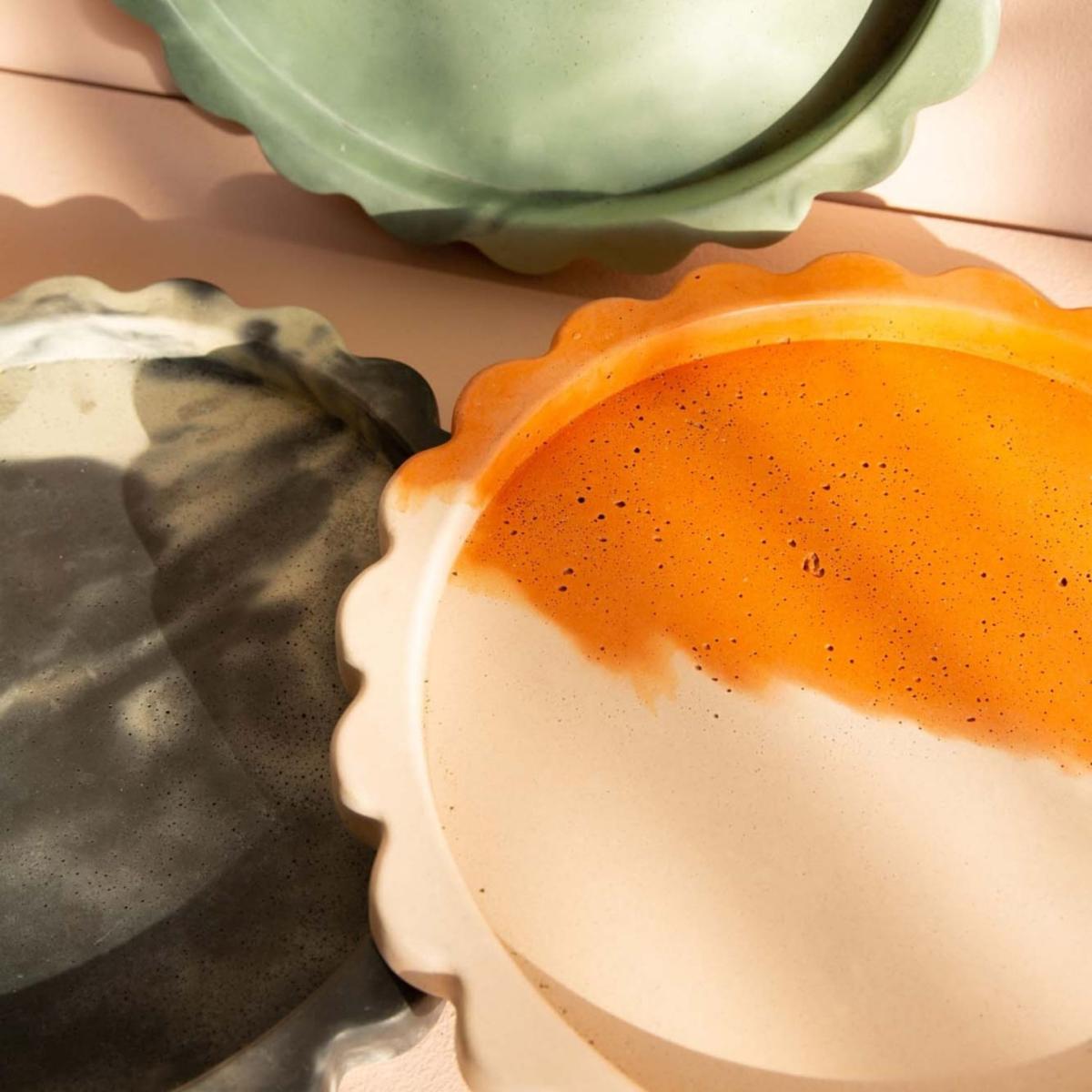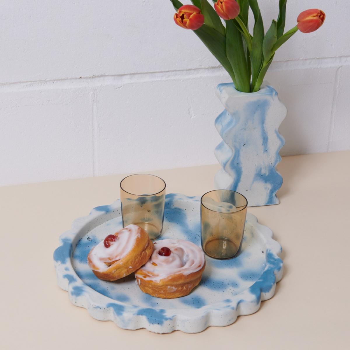 Concrete round tray with a soft scalloped edge. Use as a decorate display piece, whether on your coffee table with candles, a bottle and wine glasses or use in your bedroom for your favourite beauty products. Designed and hand carved from wood before being cast in concrete in our London studio. Available in a variety of colours. The image should be used as a guide only - due to concrete being a handmade and natural product, colour and distribution variations may occur. The sealed finish makes this product suitable for indoor and outdoor use.