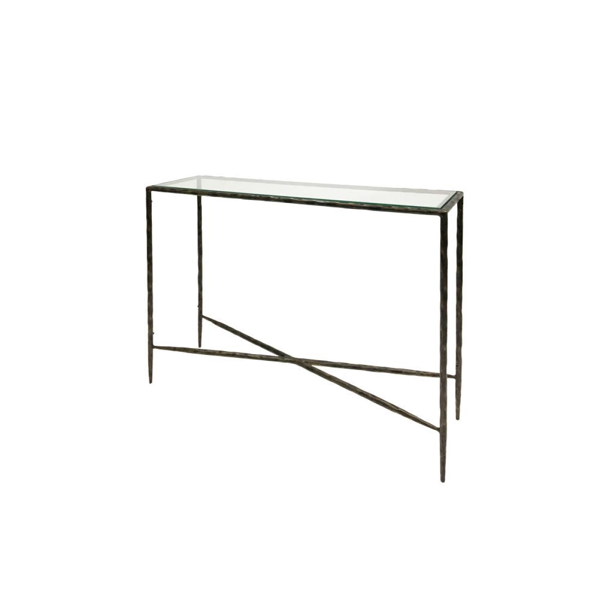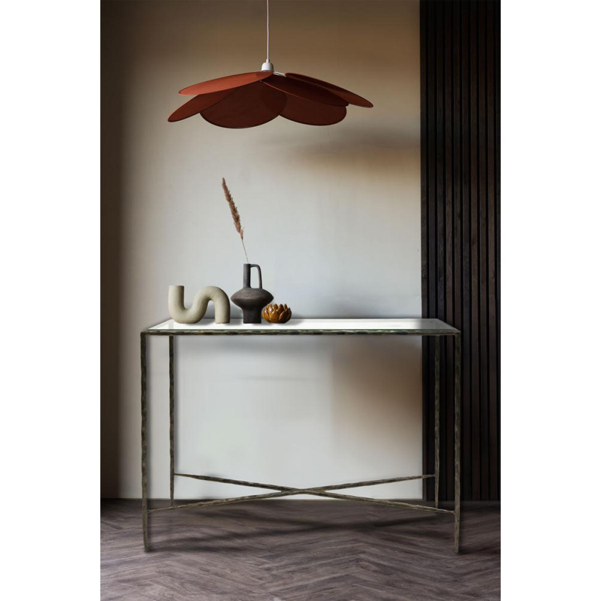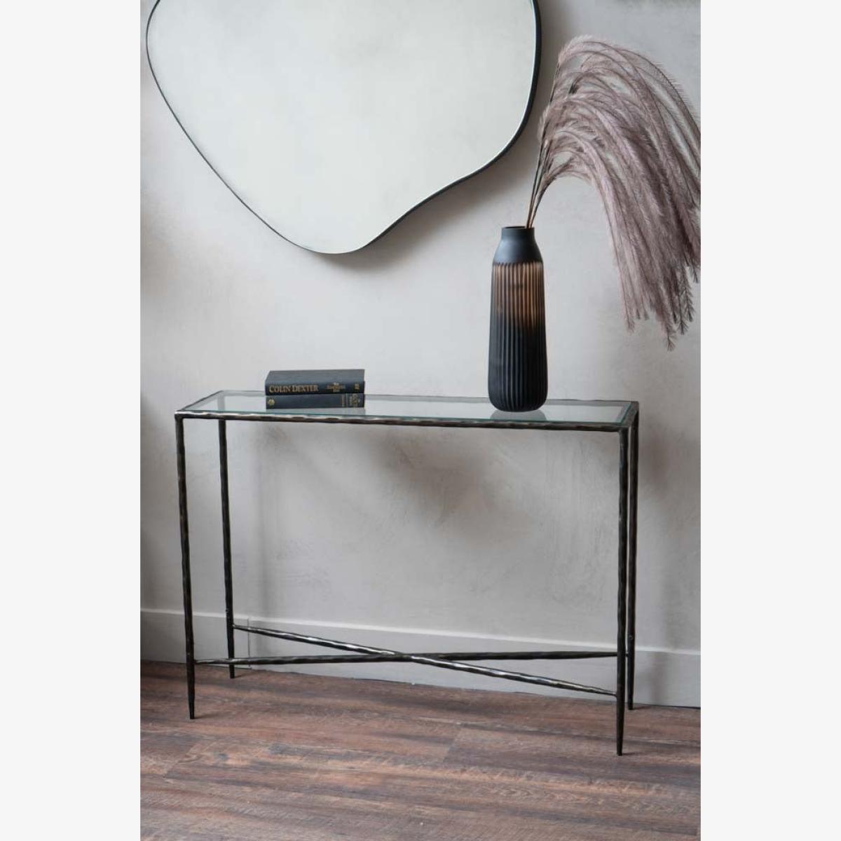 The clean lines and slim design of this piece make it perfect for the hallway or dining room. The legs and frame are crafted from vintage-style iron, while the glass top adds a contemporary look to successfully combine rustic charm with a modern aesthetic. The X-shaped frame adds interest and saves this from being too ‘boxy’, especially when styled with greenery to soften the lines further. Add a statement lamp and a favourite trinket tray and you have a work of understated elegance that sets the tone for the rest of your home.- Black Console With Clear Glass Top- Measures: H80cm x W110cm x D30cm- Material: Iron and glass