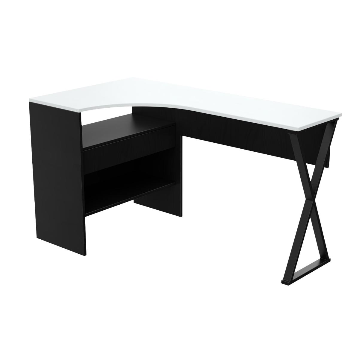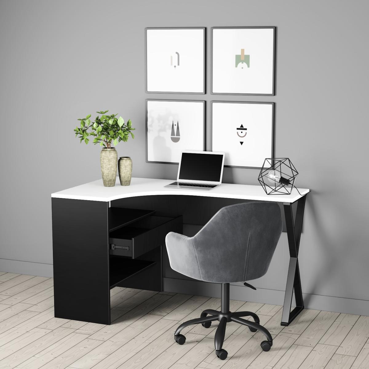 Features we love Monochrome desk with a statement crossed metal leg Maximise on minimal space with a spacious corner desk. Seamless design with a push to open handleless drawer. Clean lines and silhouette add to the minimalistic look. Versatile storage options keep your desk clutter-free. Need to know. Dimensions. H81 x W145.1 x D81cm Number of drawers. 1 Number of shelves. 1 Weight. 35kg Colour. Black and white Material. MDF board and metal frame Assembly required. Yes..