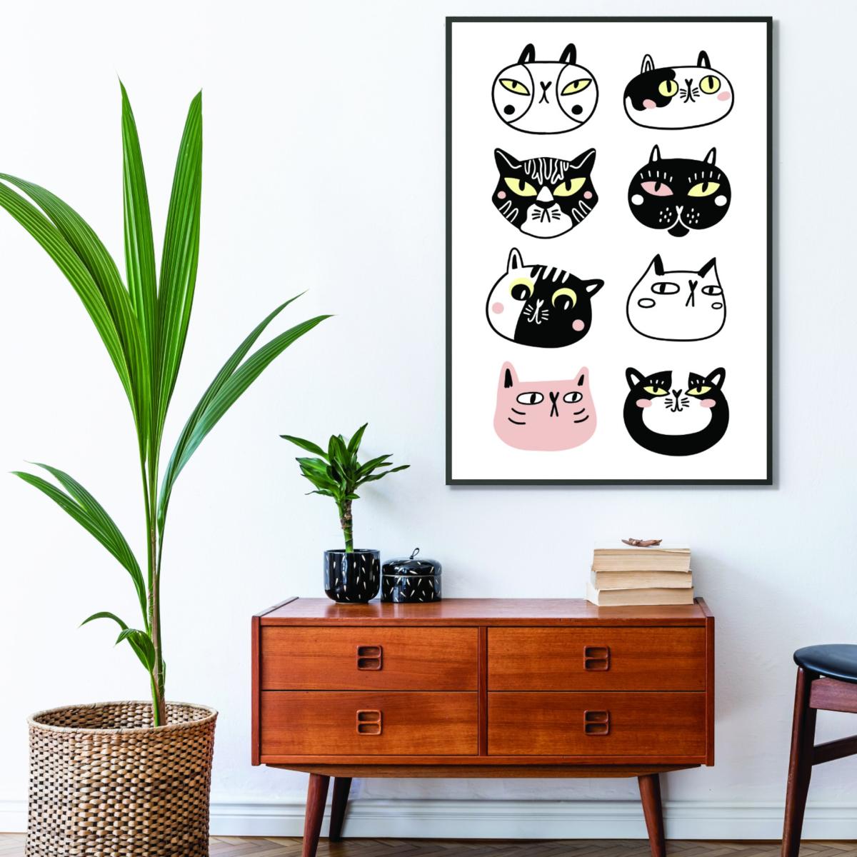 This print is a playful addition that works really well in eclectic, contemporary, or fun-themed interiors. I love how it injects personality and a dash of humour, making it ideal for personal spaces like living rooms, home offices, or even a dedicated cat corner. The bold black and white contrast, with subtle colour pops, means it pairs nicely with neutral walls or can be a statement piece against more vibrant backgrounds. Practical styling tips include layering it with minimalist frames to let the quirky artwork stand out, or grouping it with other cat-themed accessories for a cohesive look. Overall, it’s a charming piece that adds character, especially if you're aiming for a modern, relaxed vibe.