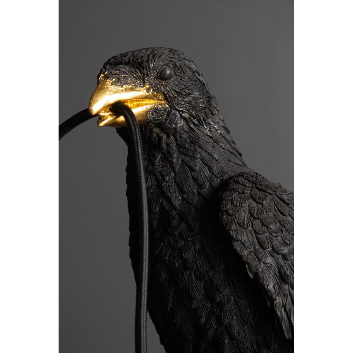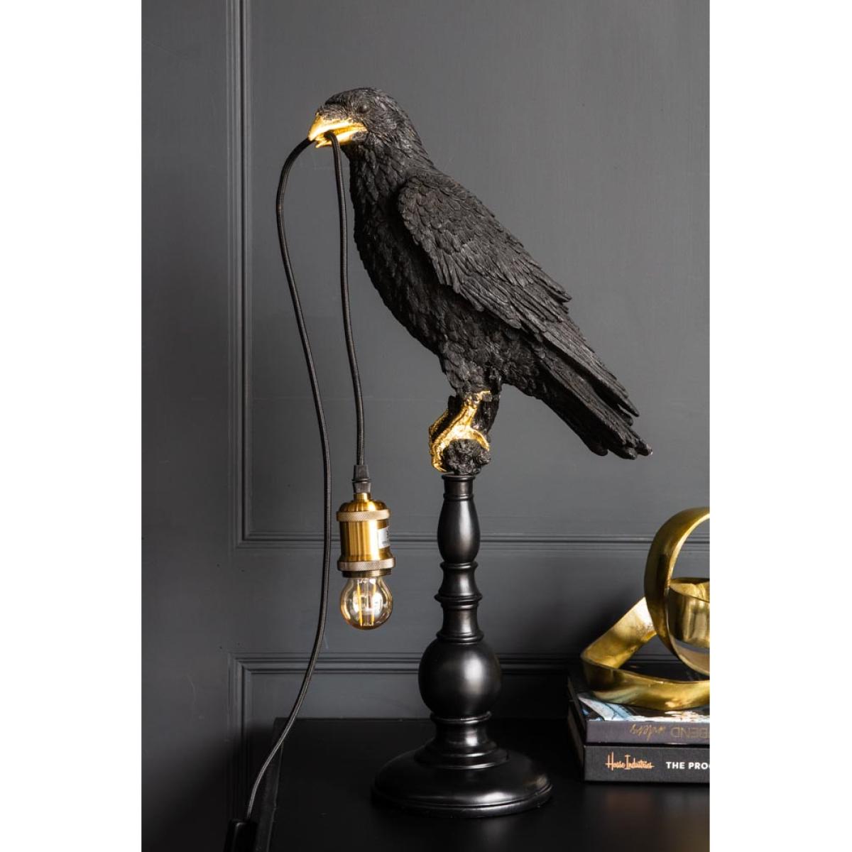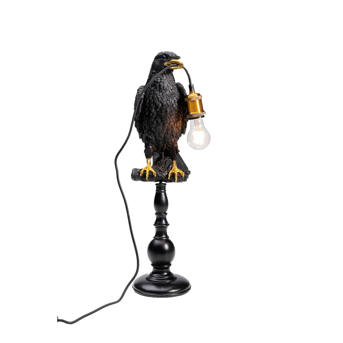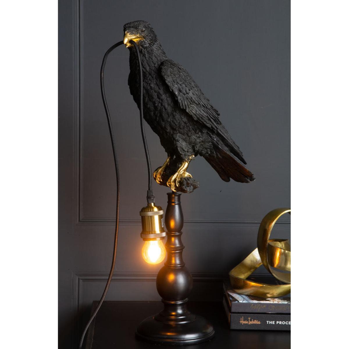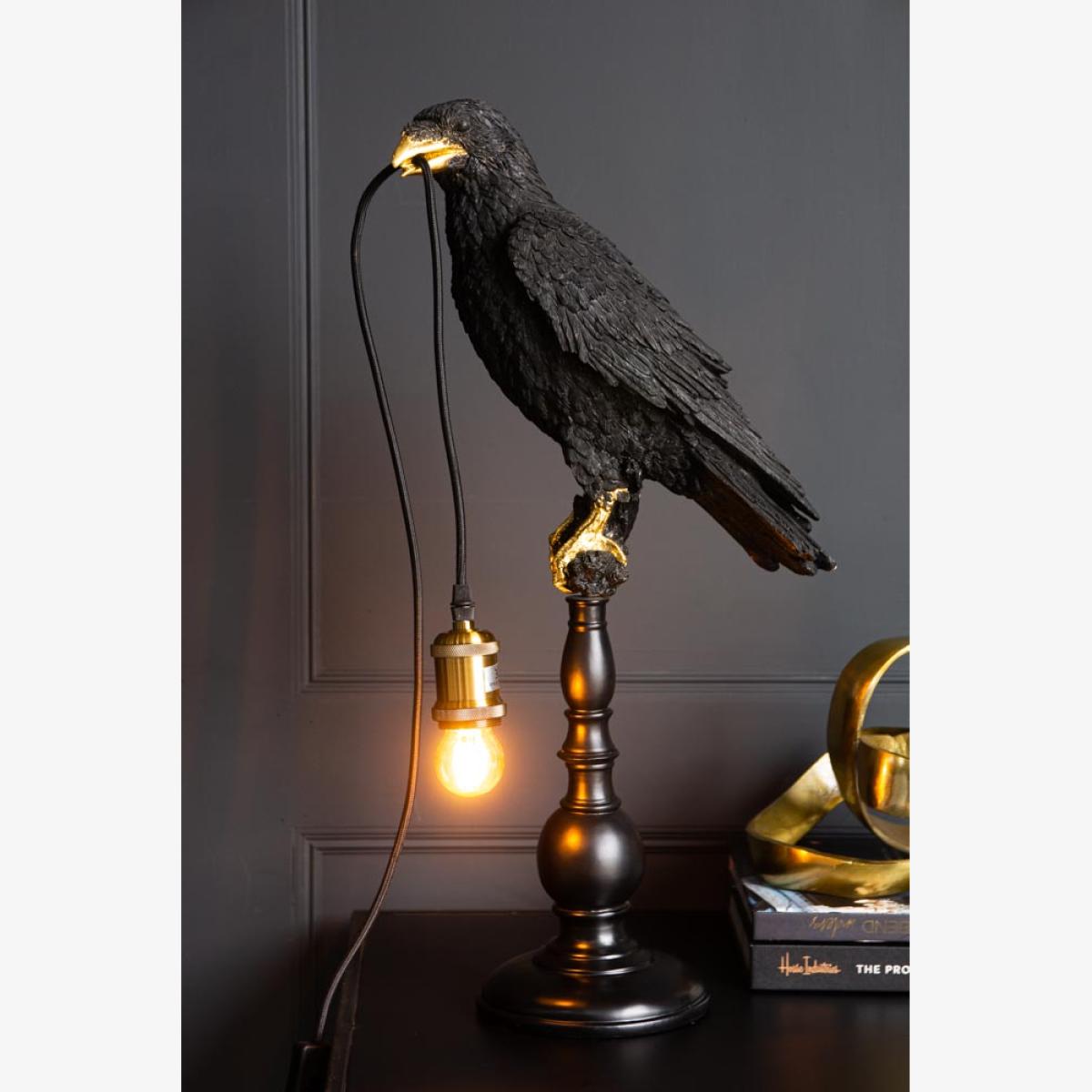 About The Black Crow Table Lamp An ultra quirky piece that’s not for the fainthearted, the Black Crow Table Lamp will make a statement in an of itself. This unique table lamp is crafted with amazing attention to detail, from the gold glittering beak and feet to the intricate detailing on the feathers. Perched on a turned wood black base, this boldly beautiful crow can be rotated to your desired position, which makes it ideal to light up any dull corner in your home. Holding the rope cable in its beak, this quirky crow table lamp offers a stylish gold light bulb socket that offers an utterly glamorous look. Pair this statement table lamp with a calming warm coloured bulb to make your space shine with delight. The Black Crow Table Lamp measures 61cm in height, has a width of 29cm, and a depth of 16cm. Why We Think You’ll Love The Crow Lamp Celebrating lighting that’s out of the ordinary, this unusual table lamp is sure to set your interior scheme apart from the rest. The ideal piece to inject instant drama into your space, this table lamp will most definitely be a conversation starter with its utterly lifelike design and charmingly quirky way of holding the light flex. Uplift a neglected corner of your home with this large table lamp, we think its design is utterly remarkable! Where To Style The Quirky Table Lamp Offering an oh-so-stylish black and gold colour palette, this decorative table lamp will inject glamorous statement style into your interior scheme. Style this unique lamp as a stand-alone piece on any sideboard, console table or side table paired with a warm coloured lightbulb for a quirky characterful look that exudes that much loved wow factor.