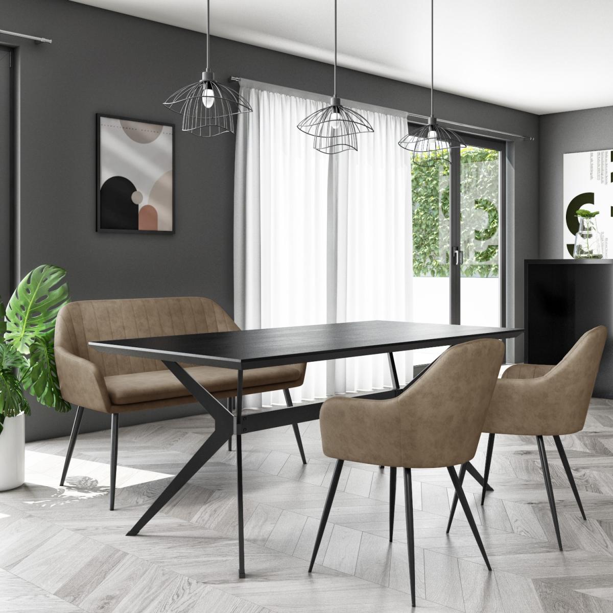 . This bundle includes. Black Oak Dining Table - Rochelle. 1 x Beige Faux Leather High Back Dining Bench - Logan. 2 x Beige Faux leather Tub Dining Chairs - Logan. Features we love Blackened oak dining table with black spider legs. Ideal for 4 diners could seat 6 with extra 2 chairs. Soft-to-touch grey faux leather bench with arms and; black legs2 beige faux leather dining chairs with arms and; black legs. Matching pieces available in the Rochelle range. Need to know. Dining Table Information. Dimensions. H76 x W180 x D90 cm Colour. Black Tabletop Finish. Blackened oak Leg finish. Polished powder coated metal Material. MDF and metal Assembly required. Yes Dining Bench Information. Dimensions. H84 x W127 x D57 cm Maximum Weight Load. 150kg per seat (300kg) Weight. 14.5kg Colour. Beige Finish. Faux leather upholestry Material. Faux leather and metal Assembly required. Yes Dining Chair Information. Number of chairs. 2 Dimensions. H85 x W59 x D45 cm Maximum Load Weight. 150kg per chair Material. Faux leather and; Metal Finish. Two tone - Beige and; Black Assembly required. Yes