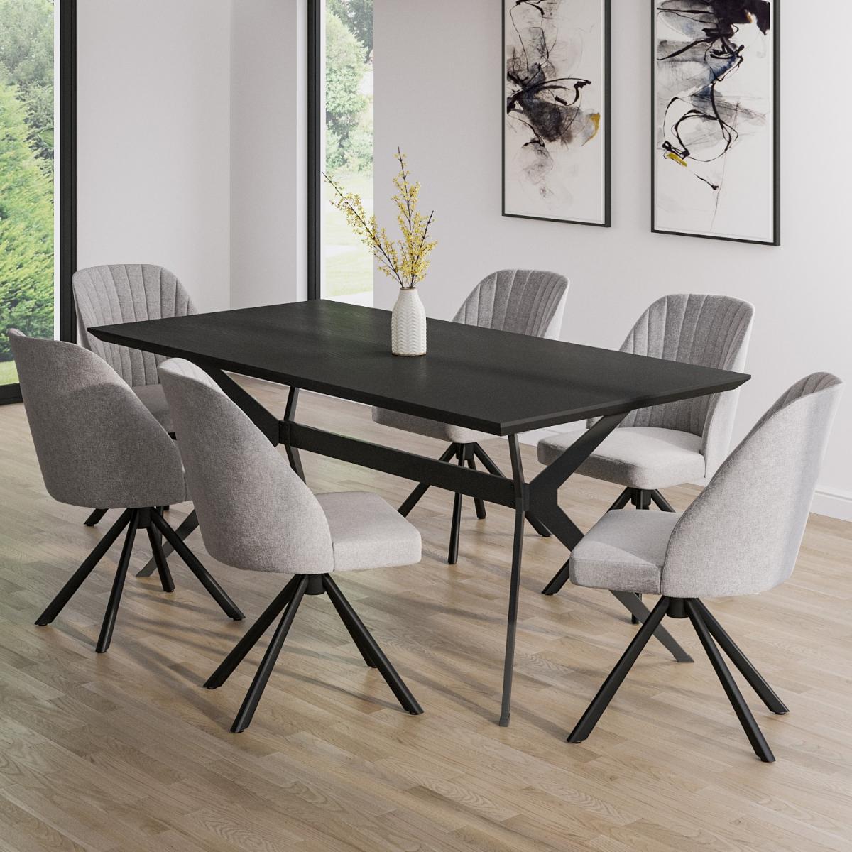 Black Dining Table with 6 Grey Fabric Swivel Dining Chairs - Rochelle