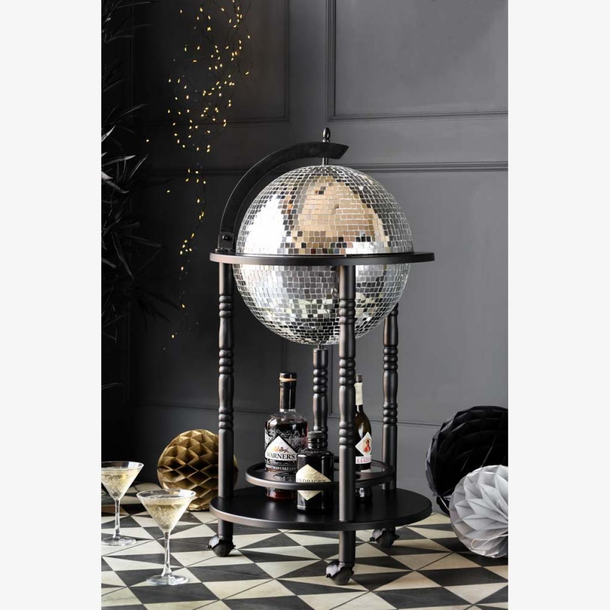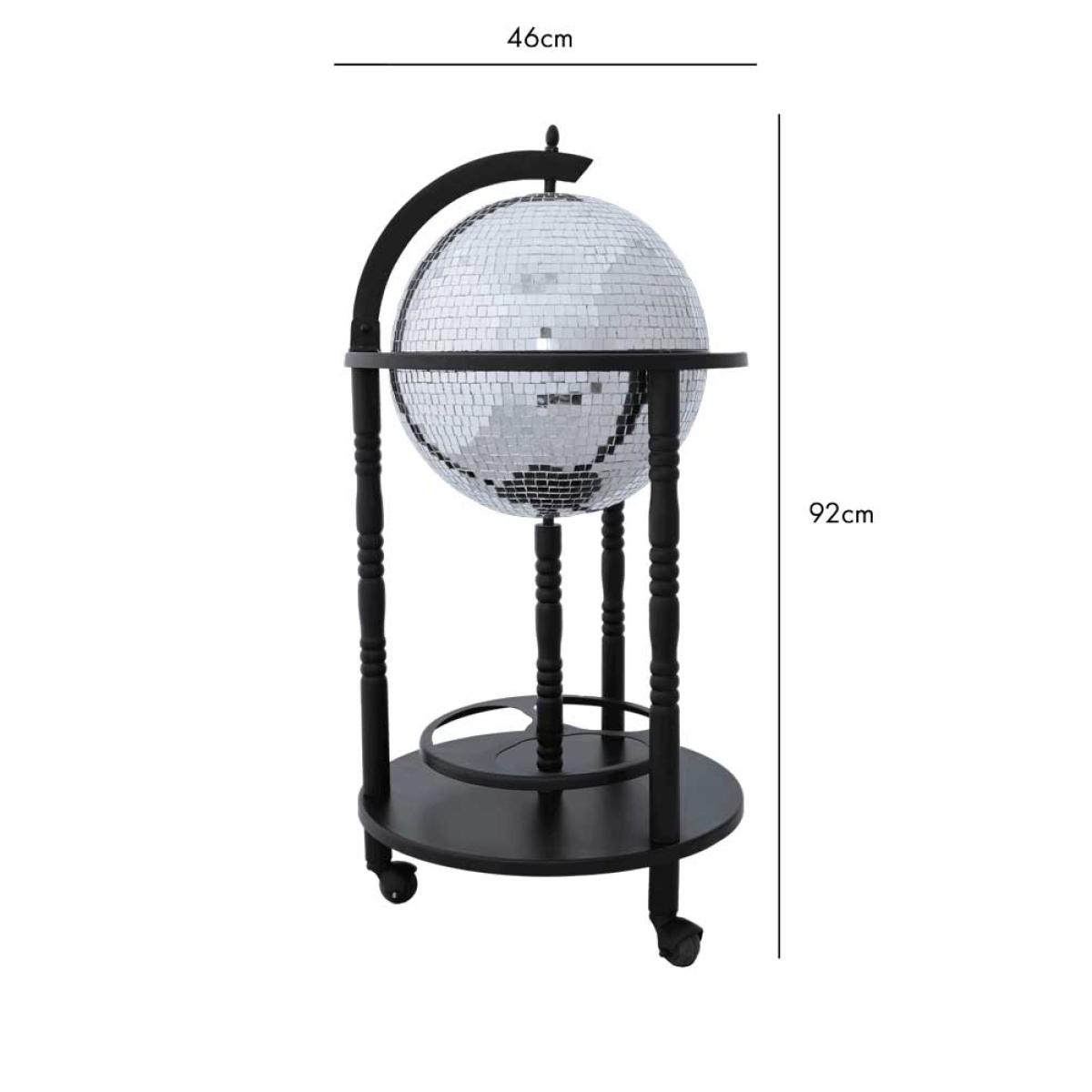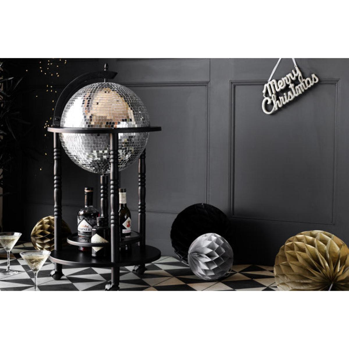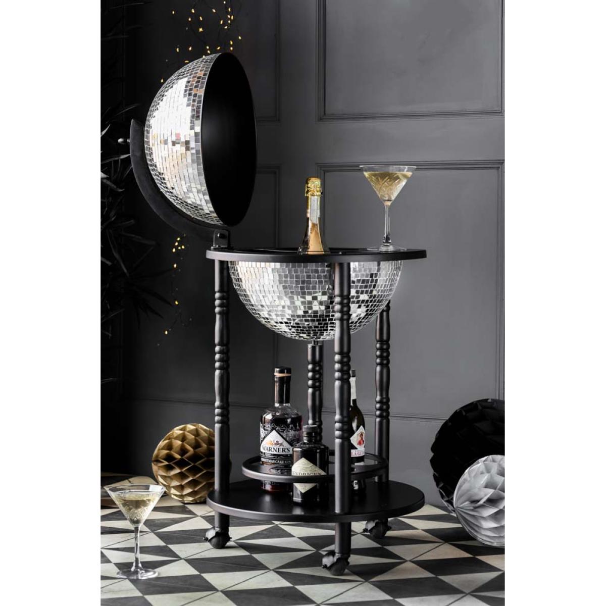 About The Black Disco Ball Drinks Trolley Cart Combining two of our favourite things (cocktail hour and disco balls), the Black Disco Ball Drinks Trolley Cart is the ultimate statement piece for party season! With a genius design that sees the top half of the glitter ball open to reveal handy bar storage inside, this dreamy bar cart trolley can fit three average size spirit bottles and a selection of smaller bottles or glassware. Measuring H92cm, there is also space on the bottom of the design for up to six spirit bottles or wine/cocktail glasses. Pair this with castors that allow the design to move into place easily, and you have yourself the drinks trolley of dreams! Why We Think You Will Love The Glitter Ball Bar Cart Proof that dreams do come true, the Black Disco Ball Drinks Trolley Cart is as stylish as it is sexy. Inspired by our resident maximalist Lucy St George, this stunning drink station joins our collection as the perfect piece to prepare your home for entertaining - from Friday night drinks to epic New Year’s Eve parties! As the ideal place to store your favourite bottles of booze, bar carts are always essential for us in the living spaces of our homes. However, the black glitter ball drinks trolley takes this to a whole new level. Glamorous beyond belief, the Disco Ball Black Bar Cart creates an aspirational cocktail corner unlike any other! How To Style The Mirror Ball Black & Silver Drinks Trolley When it comes to styling the Black Disco Ball Drinks Trolley Cart, we recommend keeping it simple to allow the incredible mirror ball design to shine. Fill the inside of the glitter ball with everything you need for the perfect cocktail but keep the storage space at the bottom more minimal with just your favourite bottles of booze on display. However, this doesn’t mean you can’t have fun with the space around your bar cart. Display a few disco balls in varying sizes around your bar cart for fabulous Studio 54 vibes, or introduce paper honeycombs, fans and stars around the cart during the festive season for pure maximalist magic!
