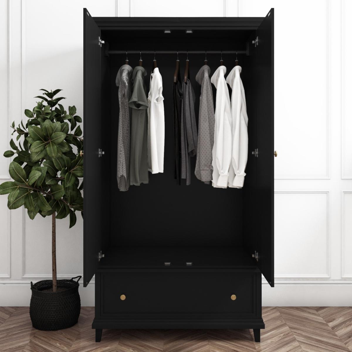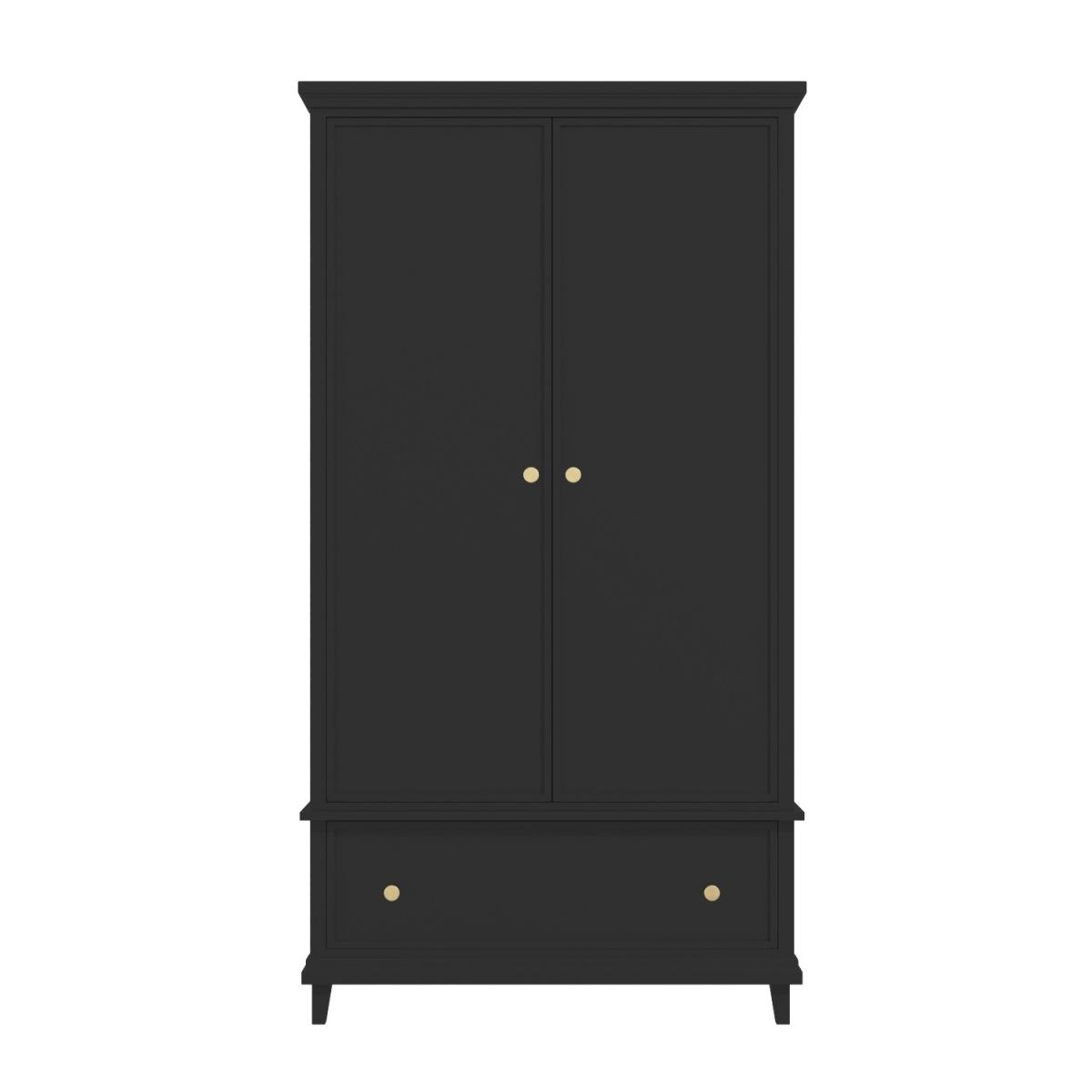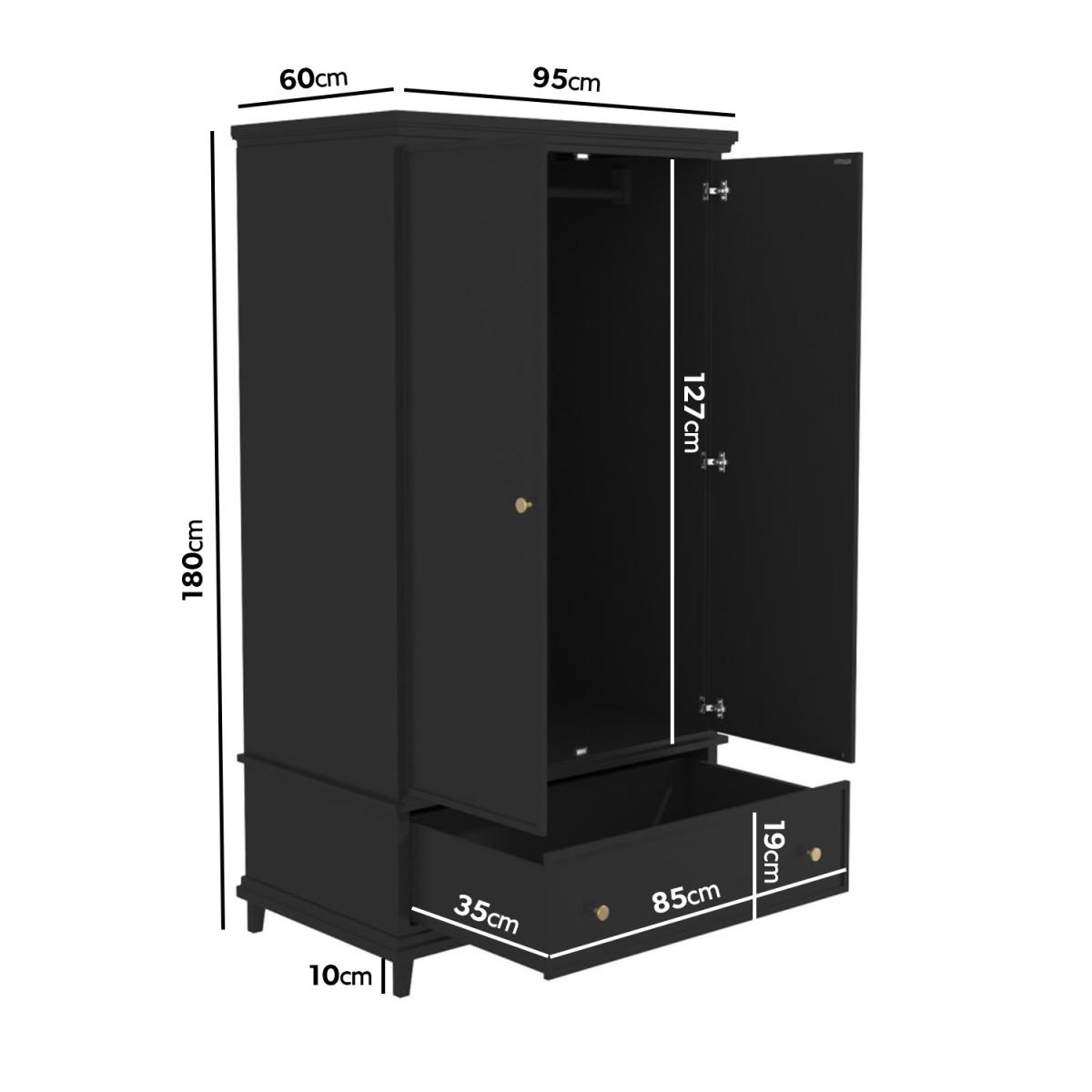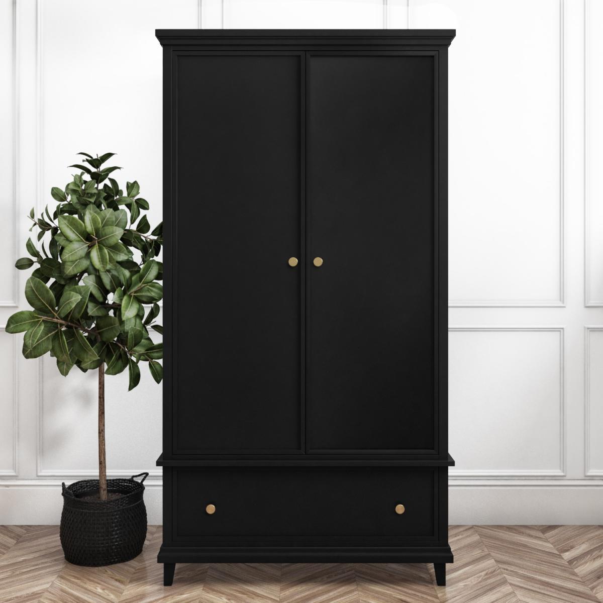 Features we love Modern black wardrobe with gold accent handles. Useful internal rail and bottom storage drawer Shaker style detailing gives a contemporary feel. Brushed-gold coin handles add a finishing touch. Complete the set with matching items also in the range Find the perfect storage solution for your bedroom with the Georgia double wardrobe. The subtle shaker detailing and brushed coin handles give this piece a contemporary feel whilst the black painted finish gives this piece a striking yet modern appearance. Pair this wardrobe with its matching counterparts to complete the look. Need to know. Dimensions. H180 x W95 x D60cm Drawer dimensions. H19 x W85 x D35cm Number of drawers. 1 Weight. 43kg Colour. Black with gold handles Finish. Painted Material. Solid pine frame acacia (legs) and metal ball bearing runners Assembly required. Yes.