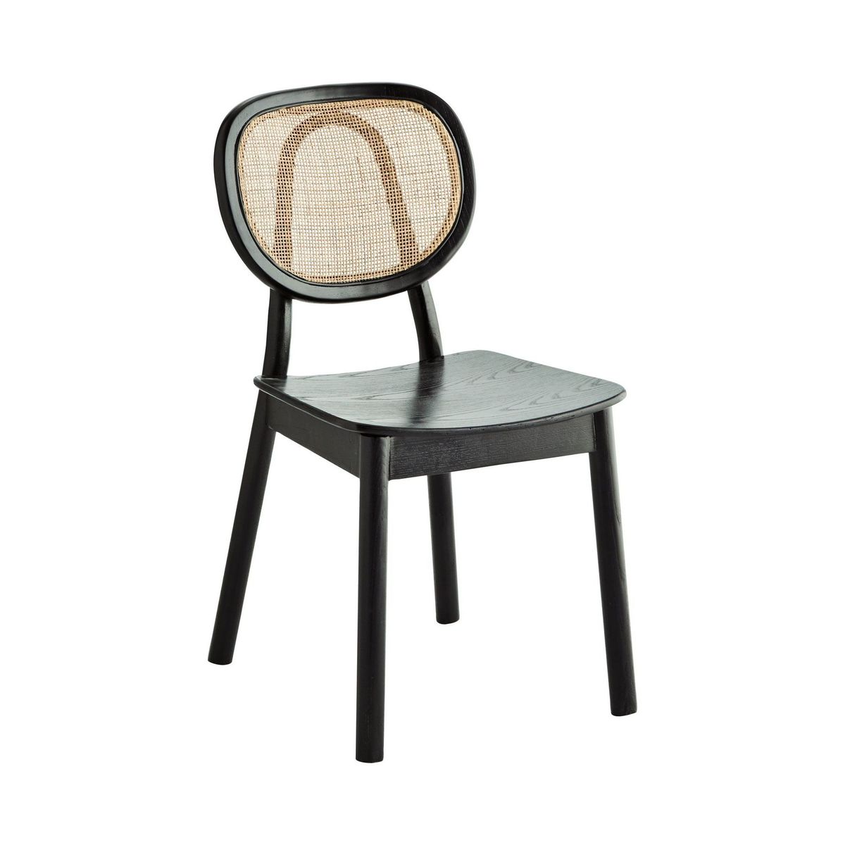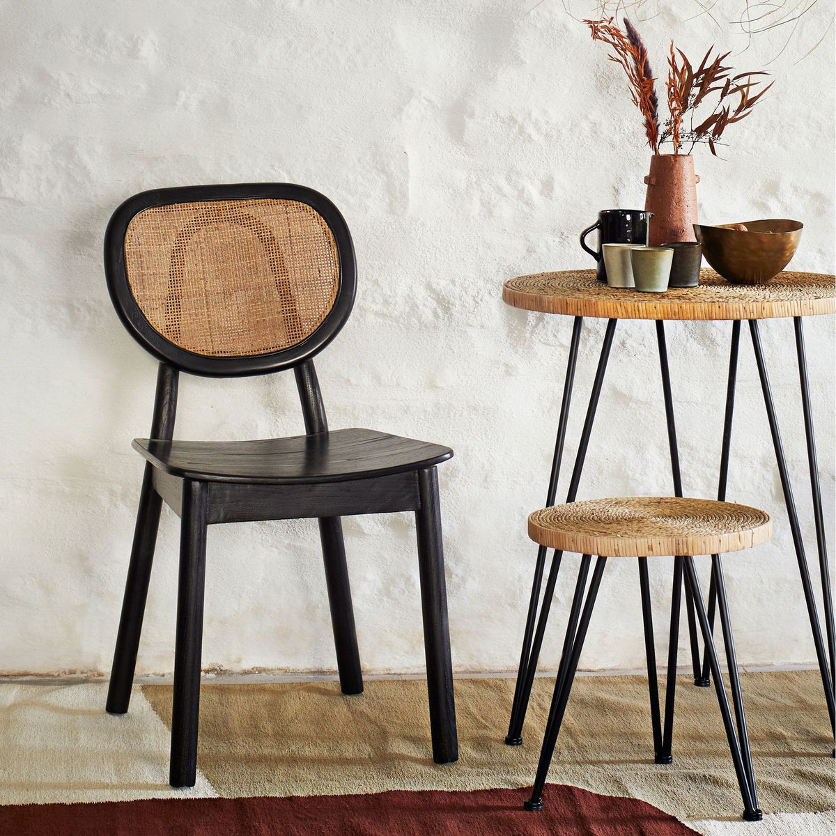 A retro-inspired chair crafted from elm wood with a contemporary black finish and a contrasting natural rattan back.