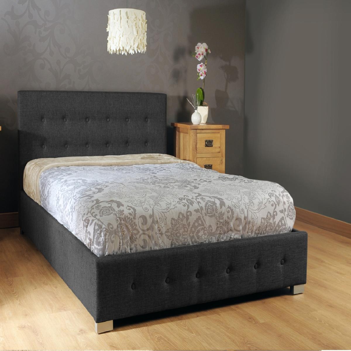This distinguished fabric upholstered bed frame features a modern square headboard with button detail to the head and footboard and is finished with light wood feet. The great aspect of these bed frames is they feature a gas lift mechanism, that lifts up the mattress easily to reveal a straight to floor storage space, for all your bed linen and duvets the mattress is supported on a solid beech slats framework.