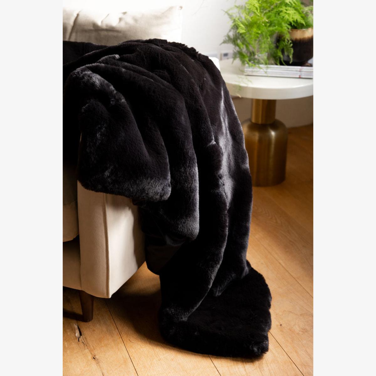 <!--td --> Wrap yourself in luxury with our Black Faux Fur Throw. Just as incredibly soft as our Natural Faux Fur Throw, this throw comes in a black hue, seamlessly complementing any décor style. Its divine soft texture invites you to snuggle on the sofa or add an extra layer of cosy warmth to your bed. Its deep, rich colour adds heaps of sophistication, making it a versatile, stunning accessory for any room in your house. Perfect for lazy afternoons, movie nights, or as a stylish accent on a chair, the Black Faux Fur Throw is just perfect for bringing those cosy autumn / winter vibes. - Black Faux Fur Throw - Measures: W150cm x L180cm - Material: 100% Polyester - Dry clean only