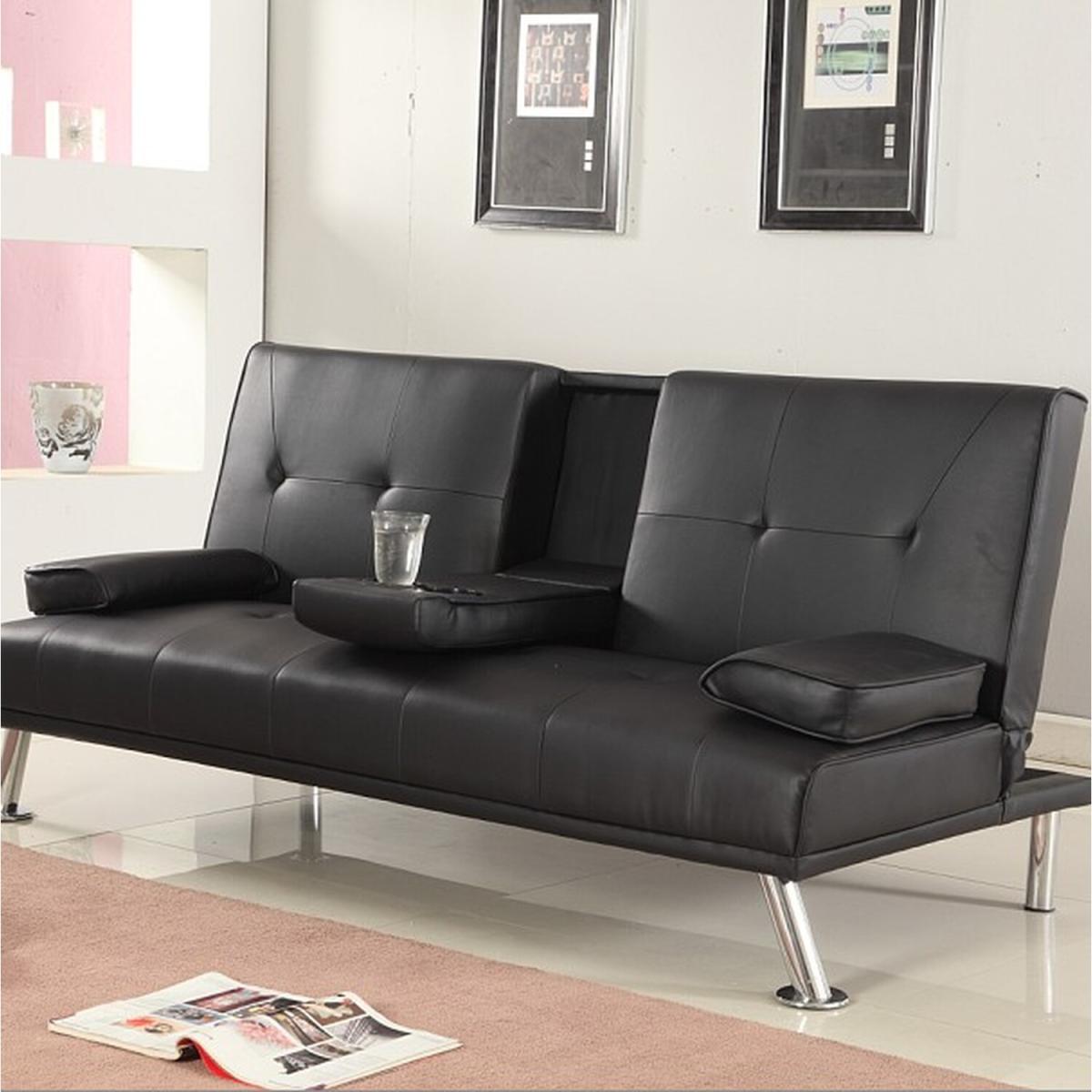 This Sofa Bed is a highly functional, stylish Sofa. It has a fold-down table with two drinks holders, perfect for movie nights. Made of high-quality faux leather, this multi-functional sofa bed offers durability as well as looking great, creating a focal point in whichever room it's in. It transforms from a sofa into a bed with the additional feature of the pull-down table, providing a hassle-free solution for people staying over. This has been designed for comfort and style, with the ingenious click-clack mechanism and fantastic pull-down table it is difficult to beat. This product is finished with quality soft faux leather and has polished chrome feet. The armrests are not attached and can double up as pillows when in bed mode and can comfortably sleep, one adult. The quality and design of the sofa bed offer ease of use and reliability.