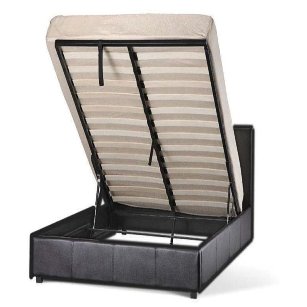 This faux leather ottoman storage bed incorporates a hydraulic gas lift system that raises the mattress and base to provide easy access to the storage space below. The storage area on this is straight to the floor area and does not have a base. The bed frame features a sturdy beech sprung slatted base supported by a centre rail and two middle legs - a great value bed that is well constructed too.