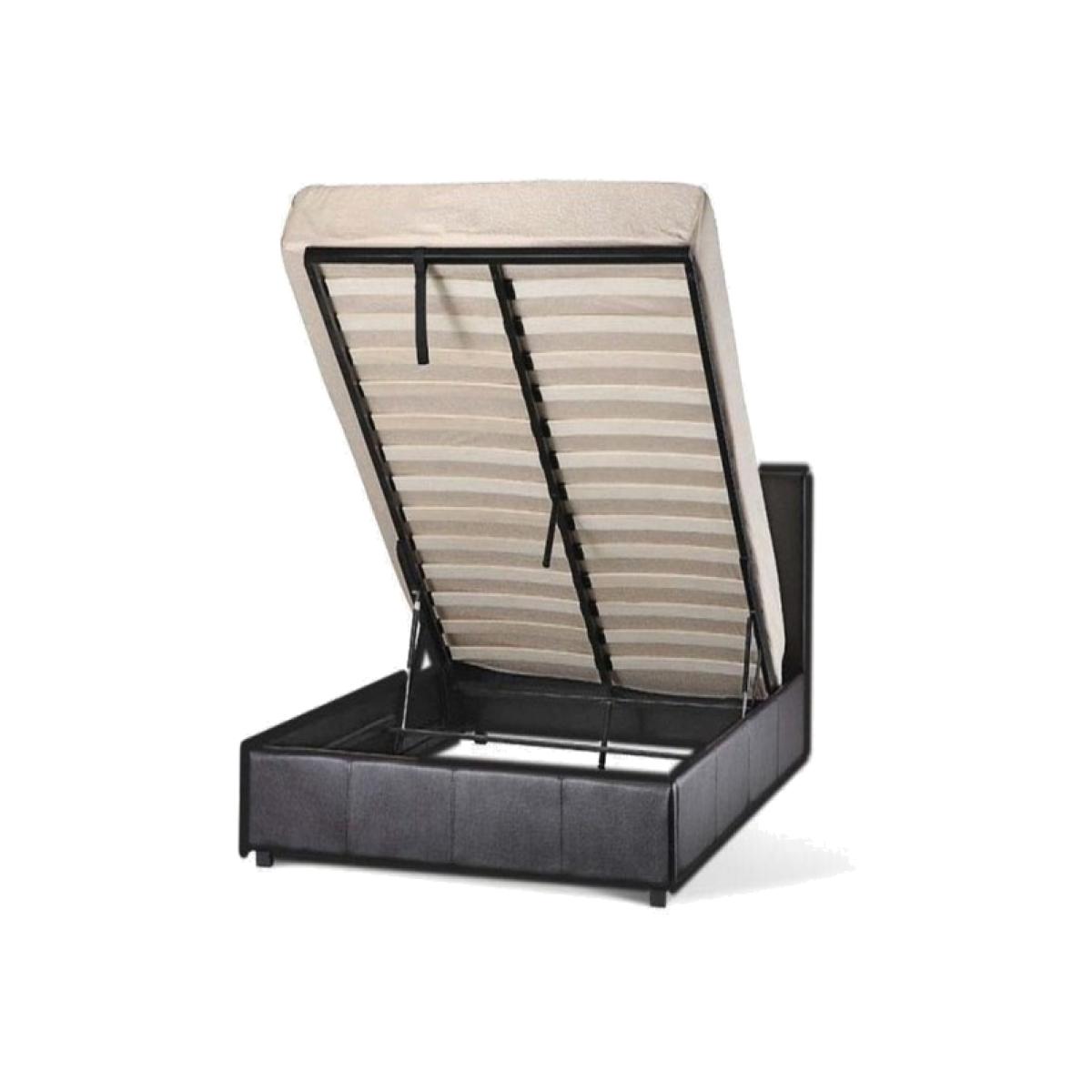 This faux leather ottoman storage bed incorporates a hydraulic gas lift system that raises the mattress and base to provide easy access to the storage space below. The storage area on this is straight to the floor area and does not have a base. The bed frame features a sturdy beech sprung slatted base supported by a centre rail and two middle legs - a great value bed that is well constructed too.