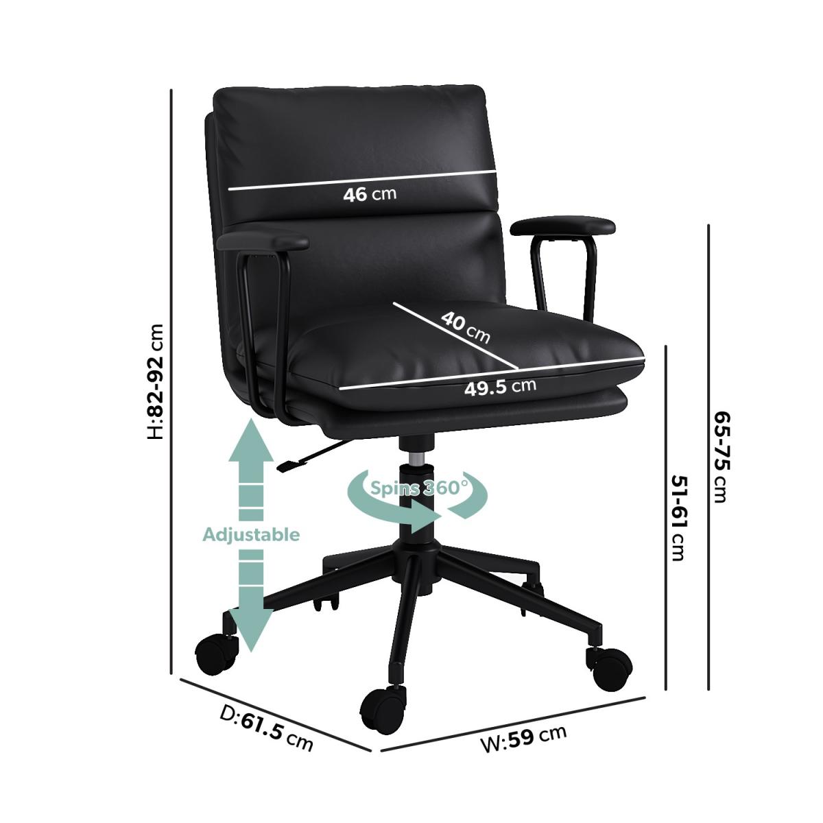 All about me Add the perfect finishing touch to your home office with our Otis desk chair. The plush cushions provide a comfy seat while working from home all day. The faux leather creates a stunning modern look in any interior and the sturdy metal base means it's built to last. Need to know Dimensions:W59 x D61.5 x H82-92 cm Weight: 10.5 kg Max supported weight: 130 kg Colour:Black Finish: Upholstered Material: PU leather and metal base Assembly required: Yes Packed dimensions: W73 x D41 x H60 cm