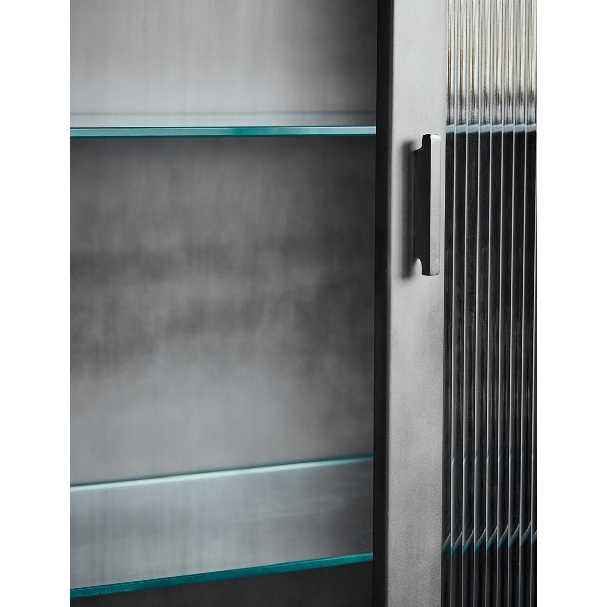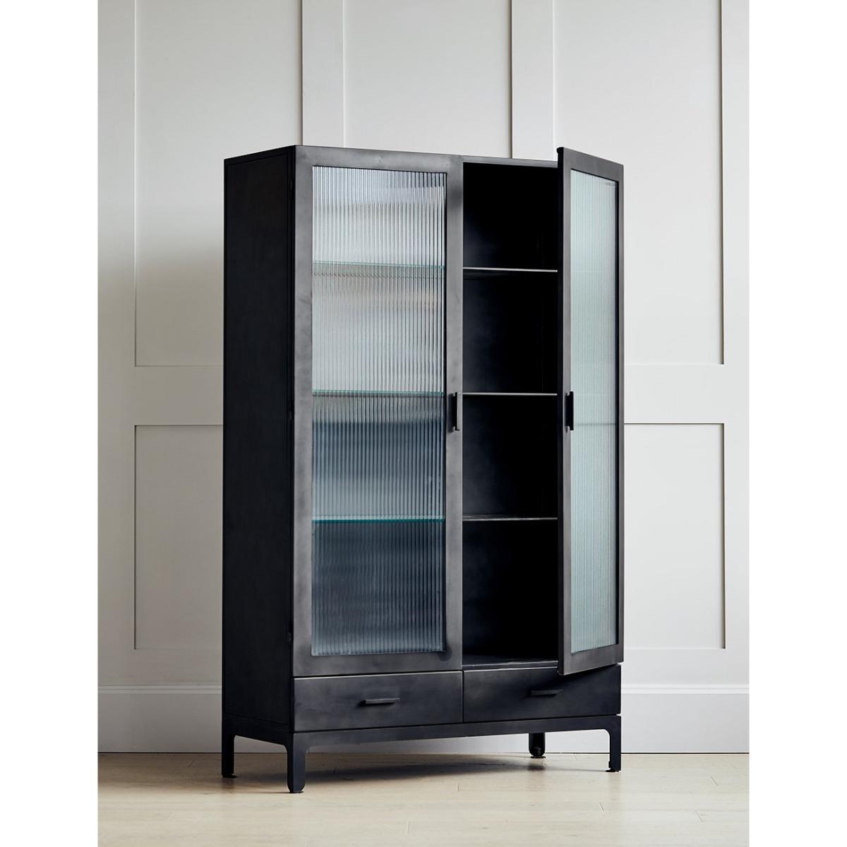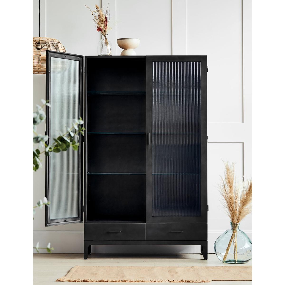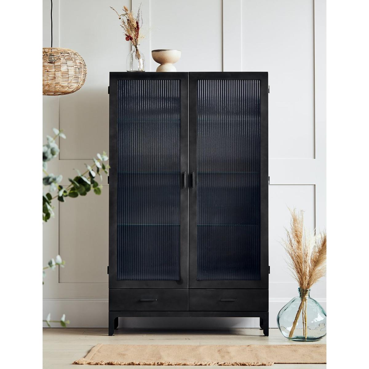 This beautifully crafted metal cabinet features stylish fluted glass doors. We love the combination of the black, slightly distressed metal, clear fluted glass and inner shelves that have a lovely subtle blue tint. A single cabinet is also available. Please note that this is a heavy piece of furniture and can be secured to the wall.