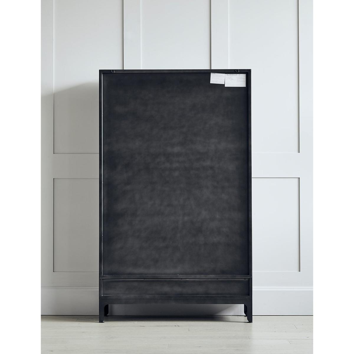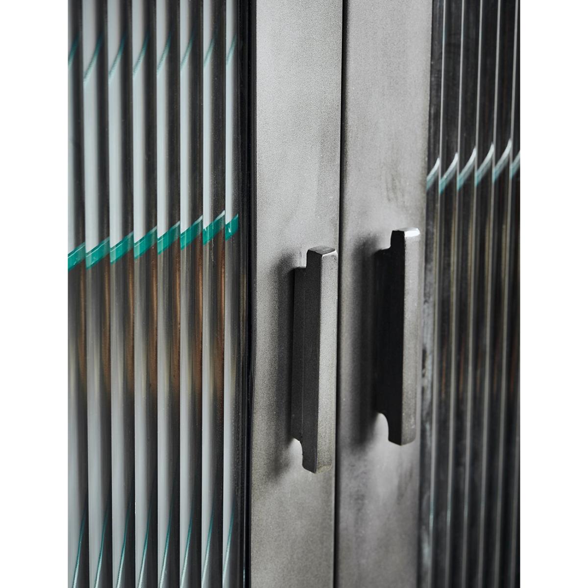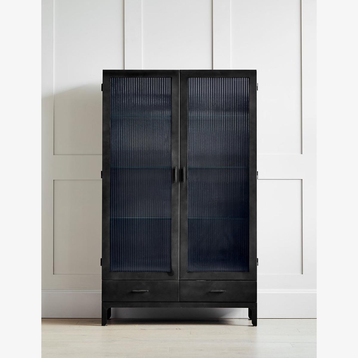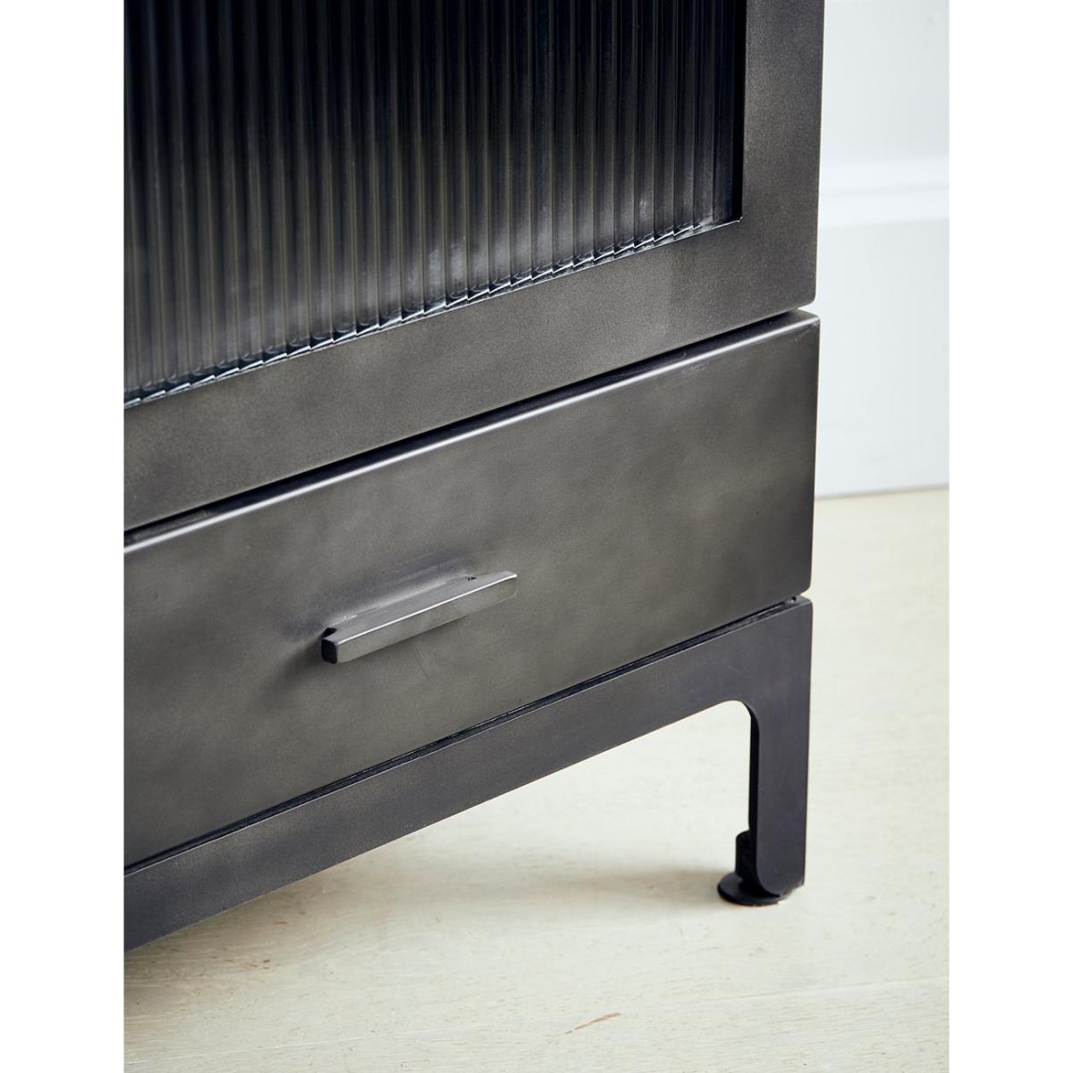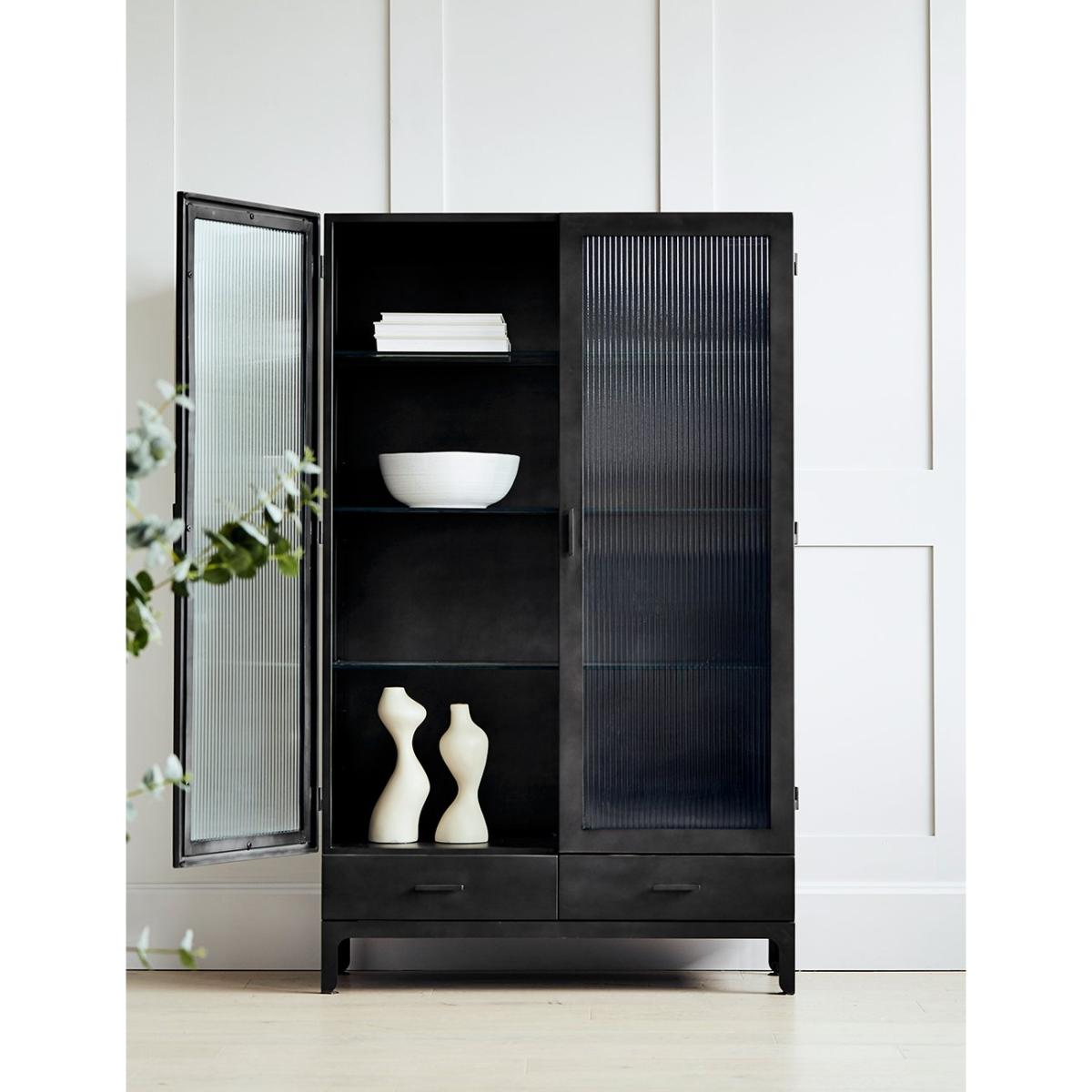 This beautifully crafted metal cabinet features stylish fluted glass doors. We love the combination of the black, slightly distressed metal, clear fluted glass and inner shelves that have a lovely subtle blue tint. A single cabinet is also available. Please note that this is a heavy piece of furniture and can be secured to the wall.