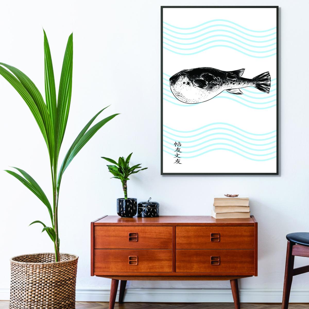 I love this piece for its striking monochrome aesthetic and bold, graphic impact. The black fugu print works well in contemporary or minimalist interiors, adding an eye-catching focal point without overwhelming the space. It pairs effortlessly with neutral colour schemes, natural textures, or even soft pastels to create a sense of balance. When styling, consider placing it above a clean-lined sofa or sideboard, and complement it with subtle accessories to let the artwork stand out. Its large size makes it ideal for empty walls in living rooms or hallways, providing instant visual interest and a modern, artful vibe to the room.