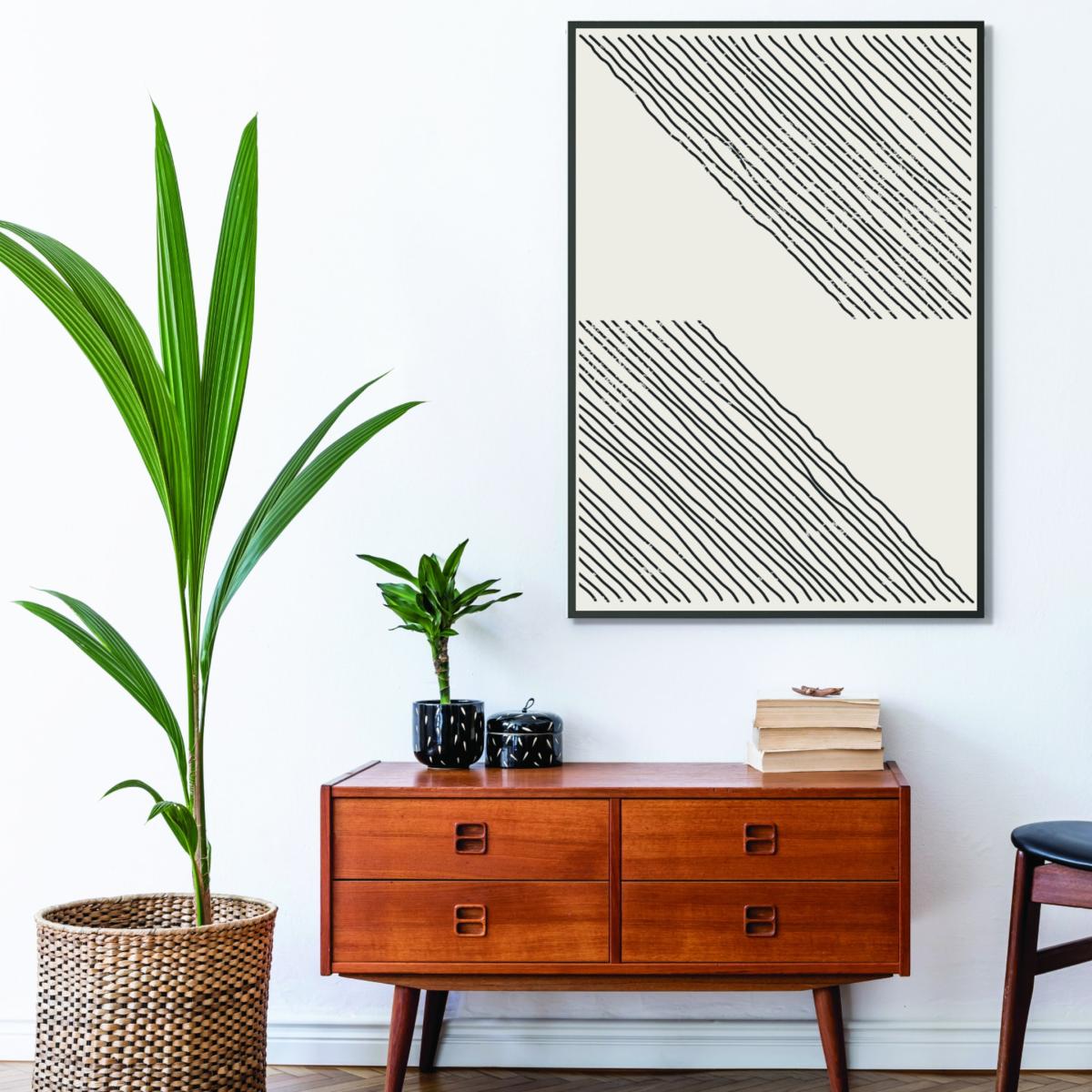 I love this black geometric print for its clean, contemporary appeal-it’s a versatile piece that can add a modern edge to various interiors. It works particularly well in minimalist or monochrome schemes, where its bold lines bring structure and visual interest without overwhelming the space. For practical styling, consider framing it with a slim, matte black or white frame to keep the look sleek, and hang it above a neutral sofa or workspace to create a focal point. Its A4 size makes it perfect for smaller areas like a gallery wall or a side table vignette, offering a crisp, graphic touch that elevates the overall vibe of the room.