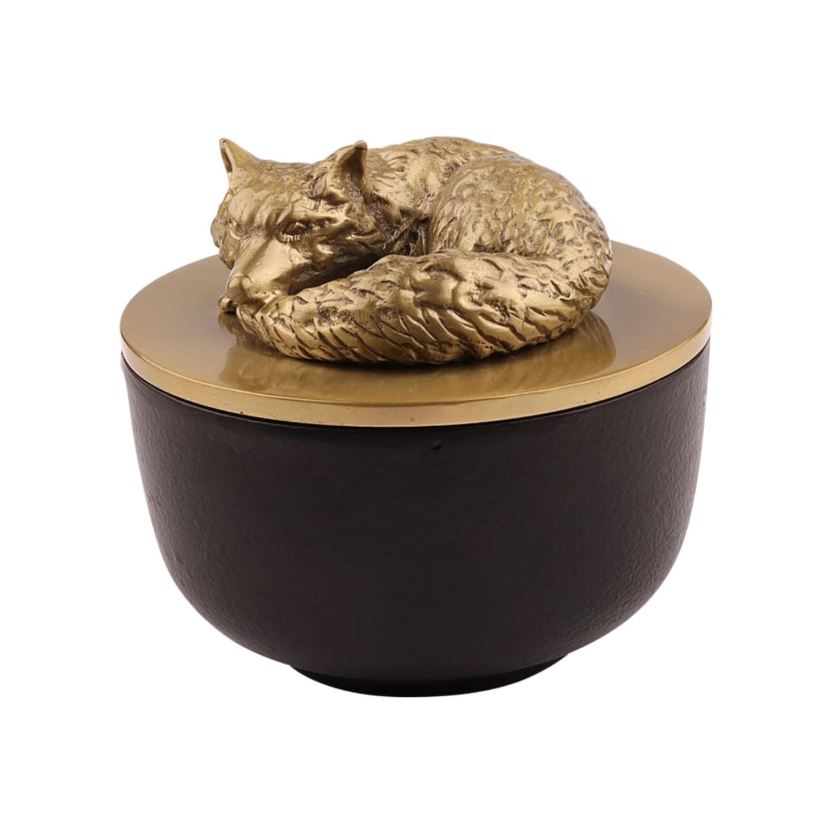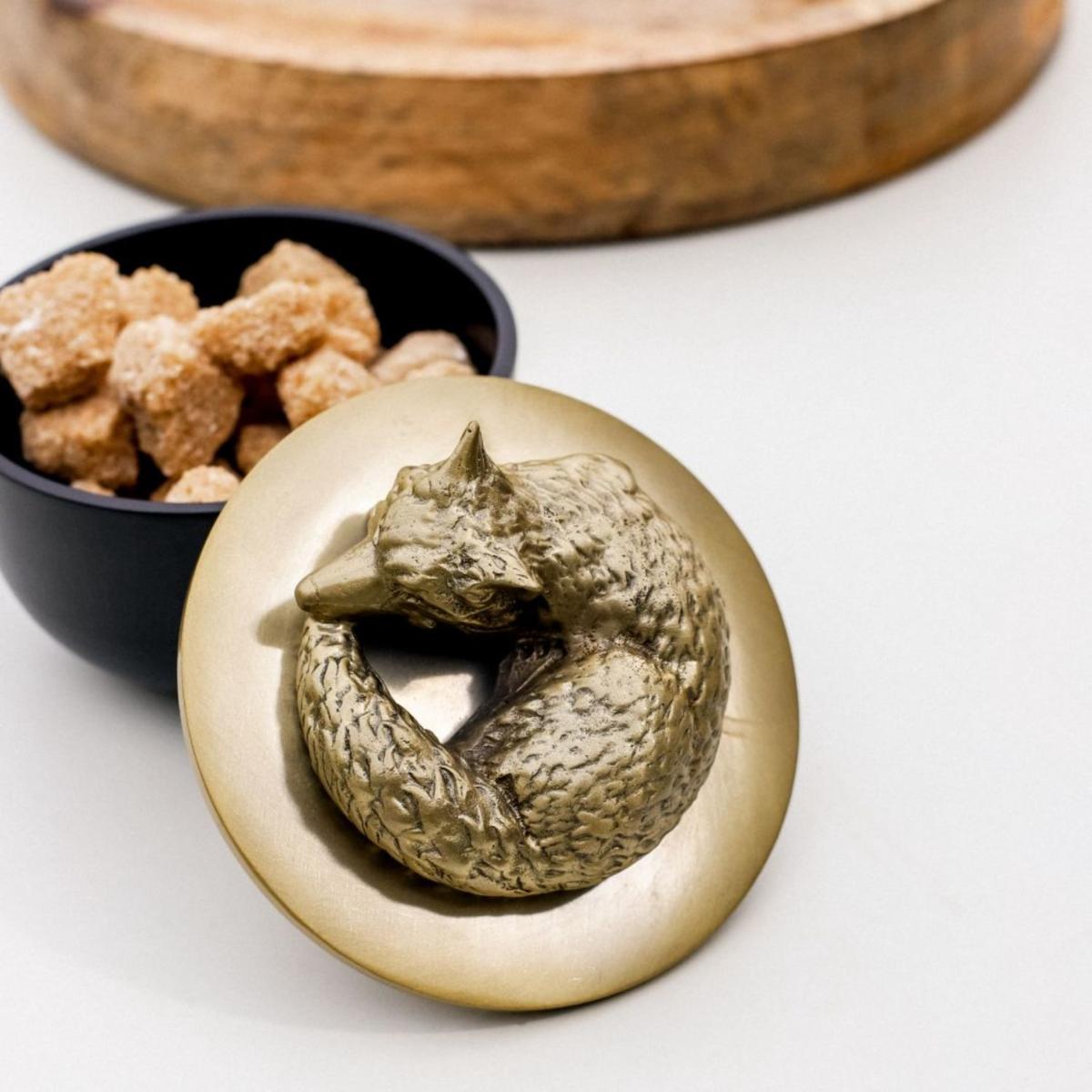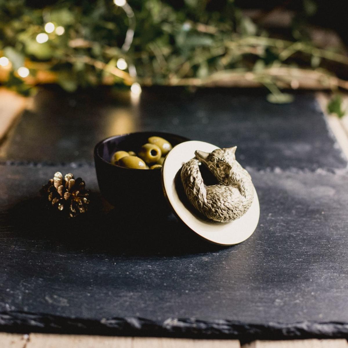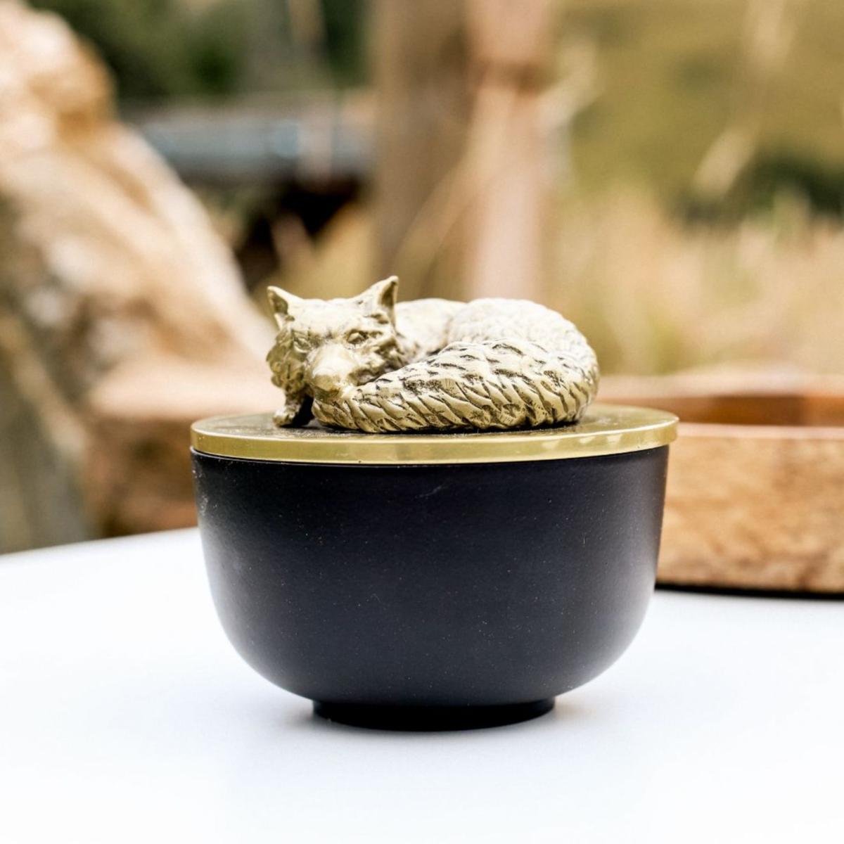 A captivating decorative bowl, showcasing a striking sculpture of Manston, the Fox. This versatile, food-safe bowl is ideal for storing trinkets, keys, or elegantly serving your favorite snacks. The bowl and lid are meticulously handcrafted using time-honoured metalworking techniques.