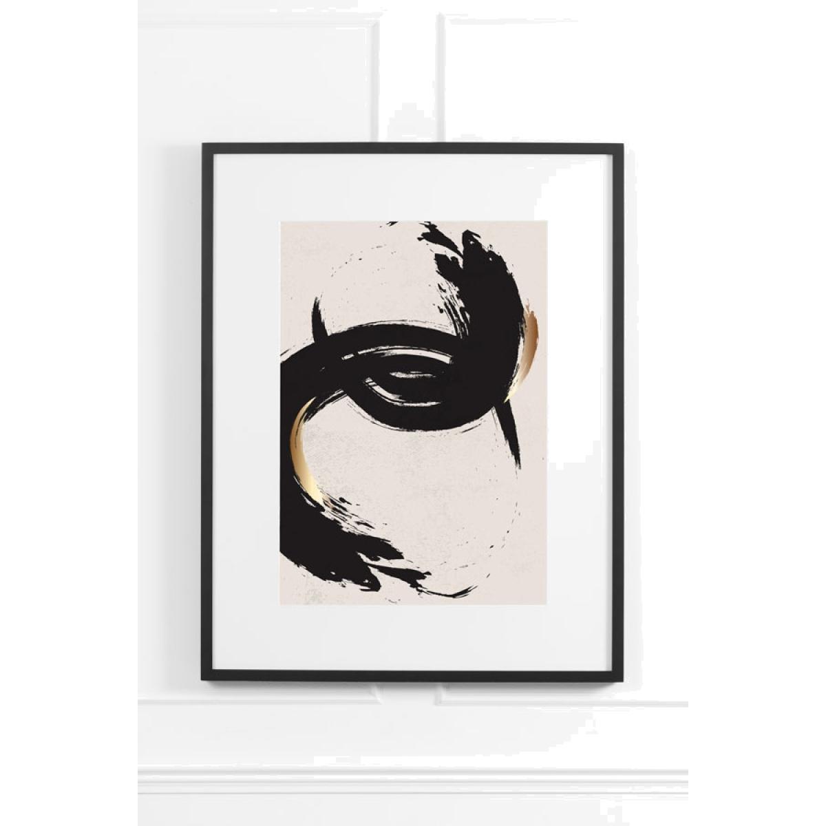 A bold abstract print featuring strong, dark brush strokes over a muted base, hand finished with gold metallic ink. 250gsm paper with a satin finish complete with an elegant matte black wooden frame.