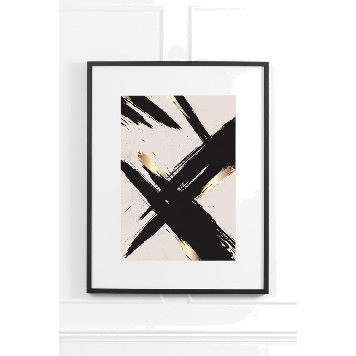 A bold abstract print featuring strong, dark brush strokes over a muted base, hand finished with gold metallic ink. 250gsm paper with a satin finish complete with an elegant matte black wooden frame.